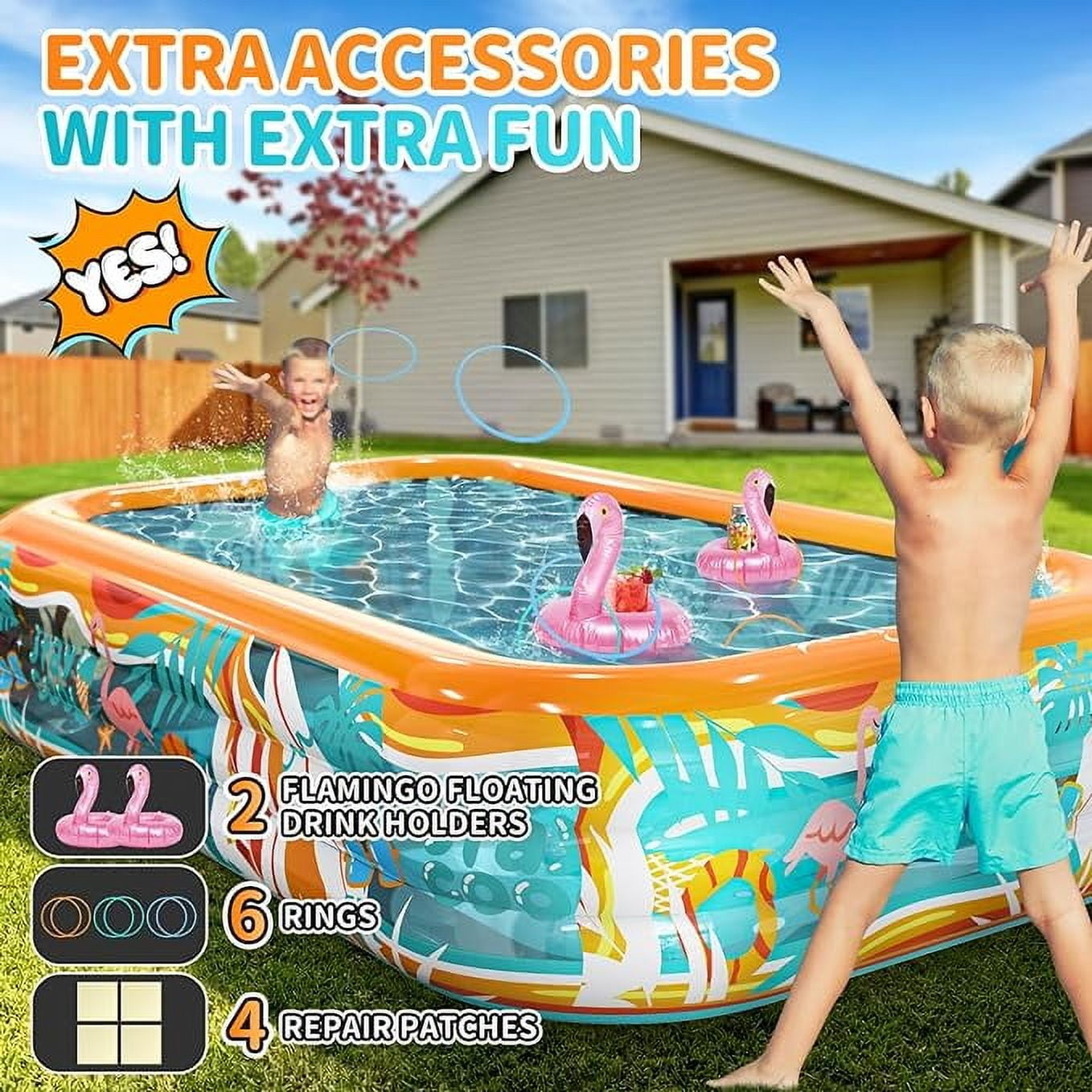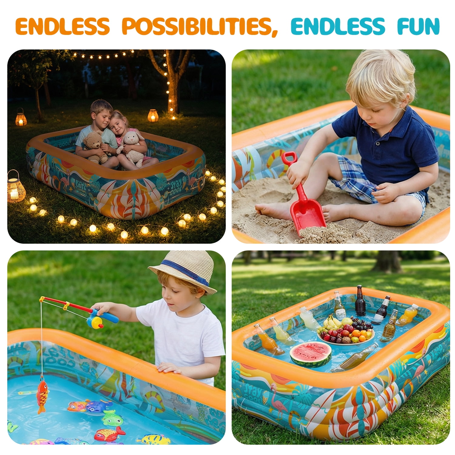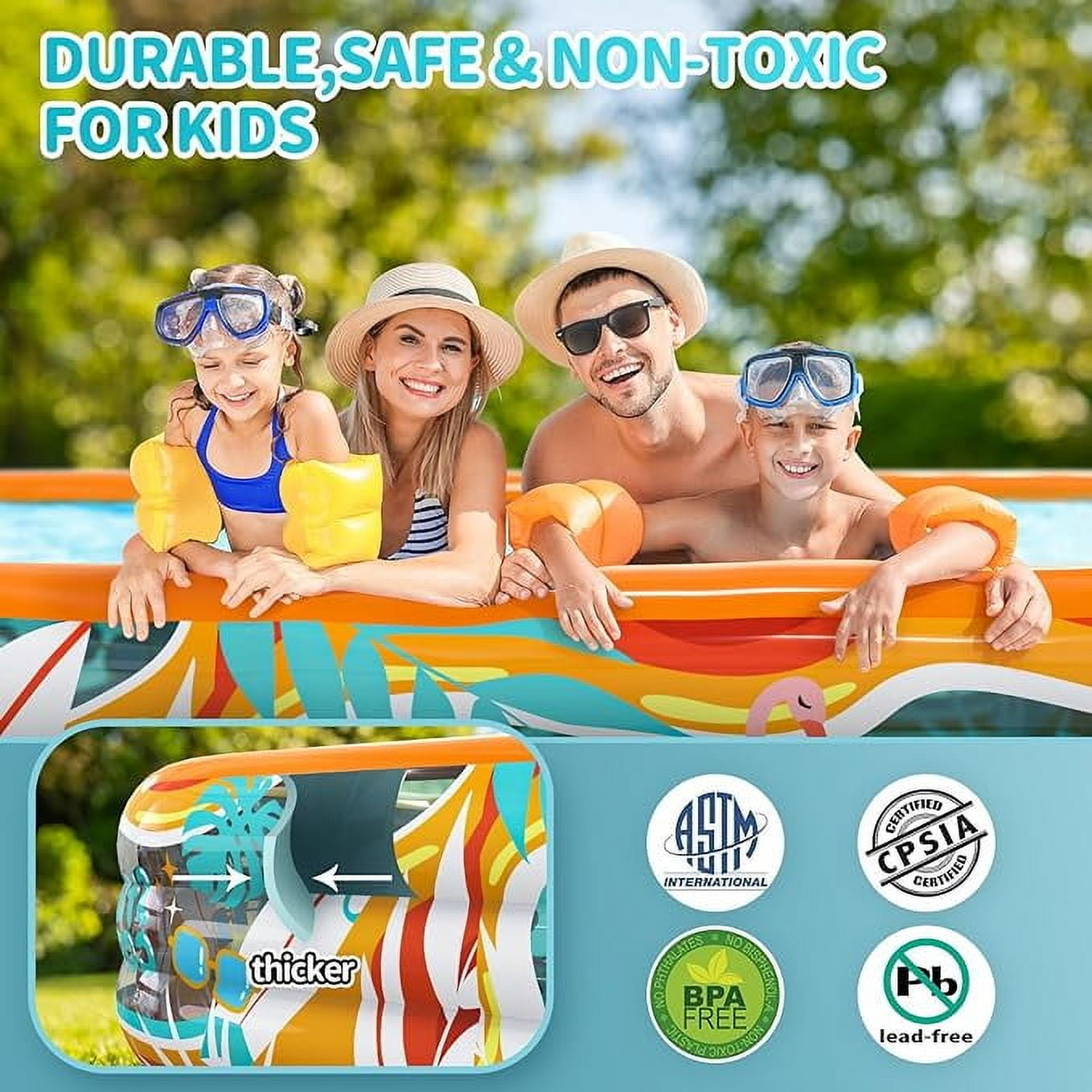 Inflatable Children/Adults Swimming Pools, 120″ x 72″ x 22″, Multicolor 12.7 lbs Safe and durable rectangular inflatable pool made with phthalate and lead-free materials BPA-free construction meets international children’s toy standards Twice thicker than most pools on the market, reducing the risk of punctures Easy to set up; simply spread out on the ground Inflates in 3-4 minutes with an electric pump (not included) Built-in 2 curve water valves double the drainage speed Great gift for kids, families, and pets Can be used as a swimming pool in the backyard or as a ball pit indoors
