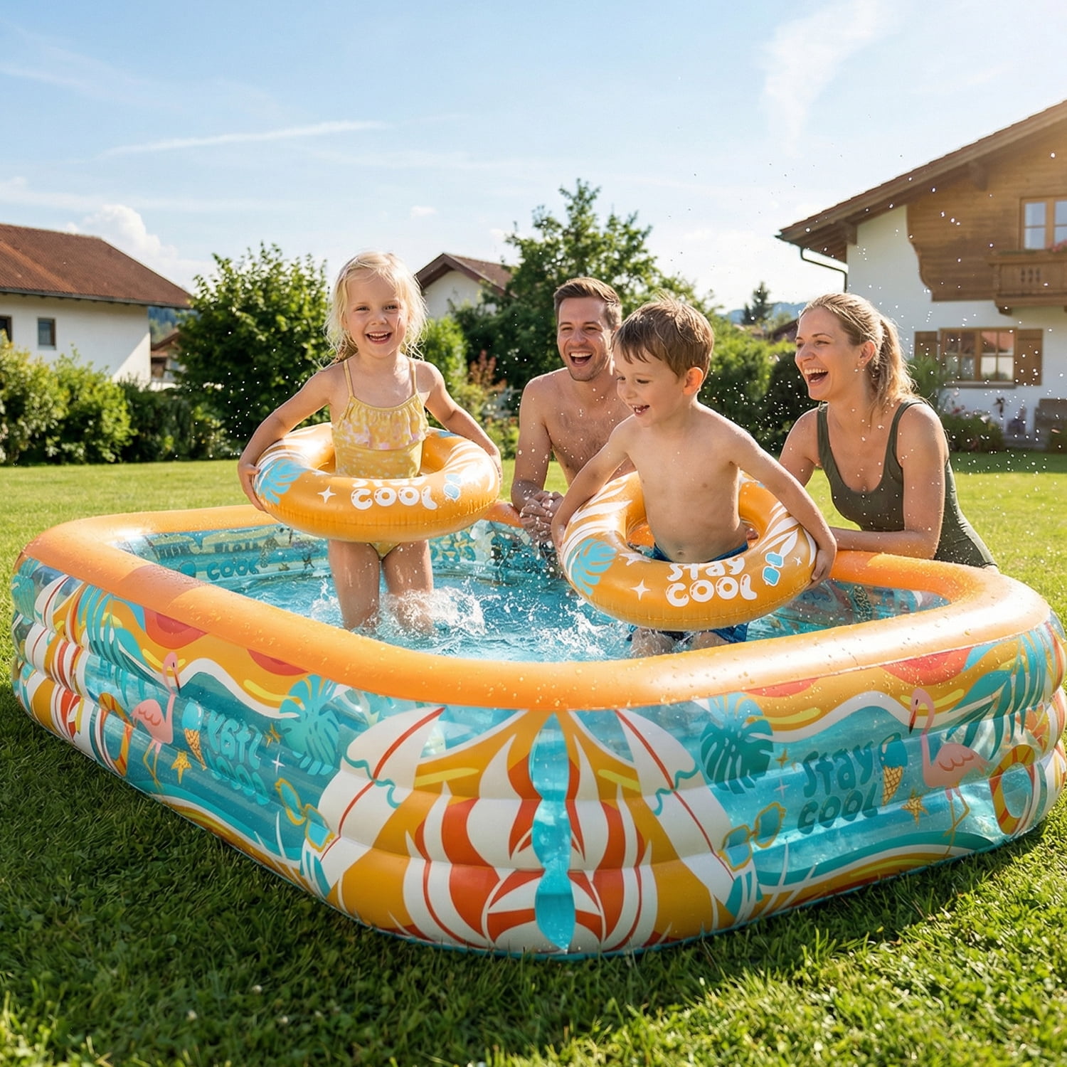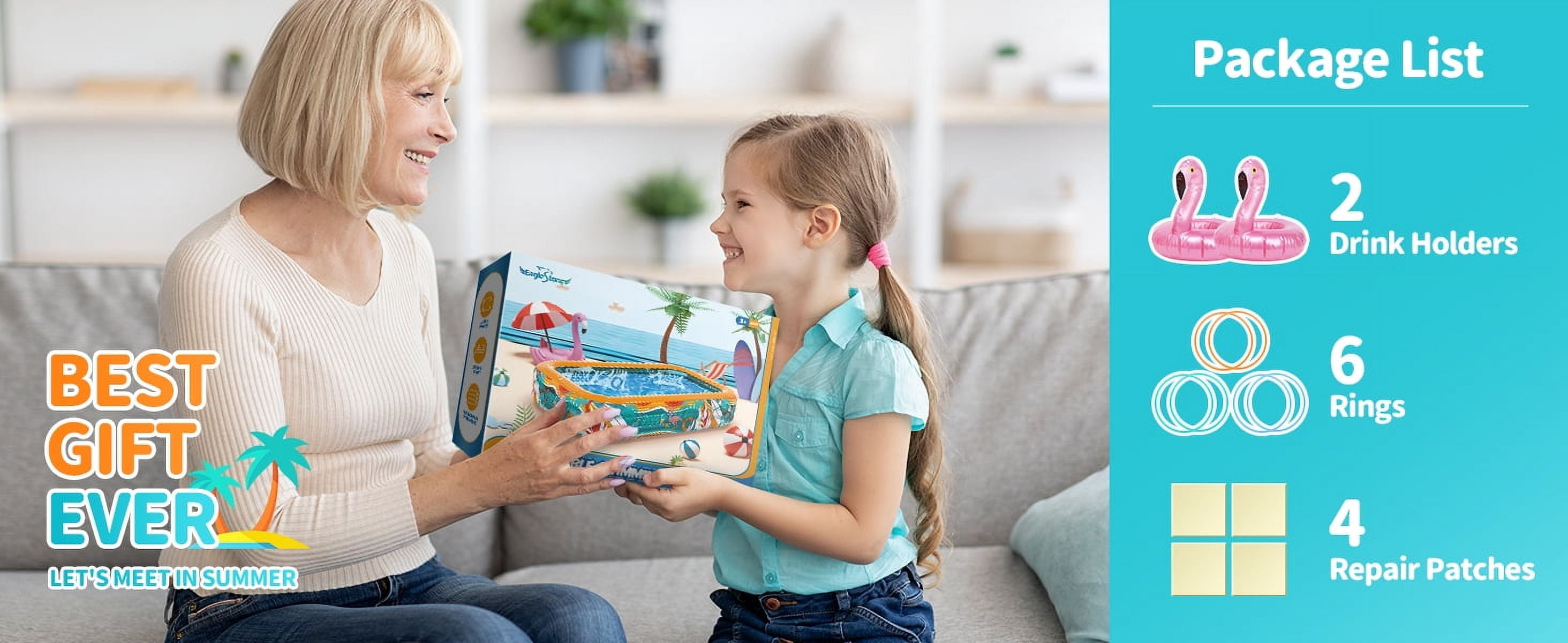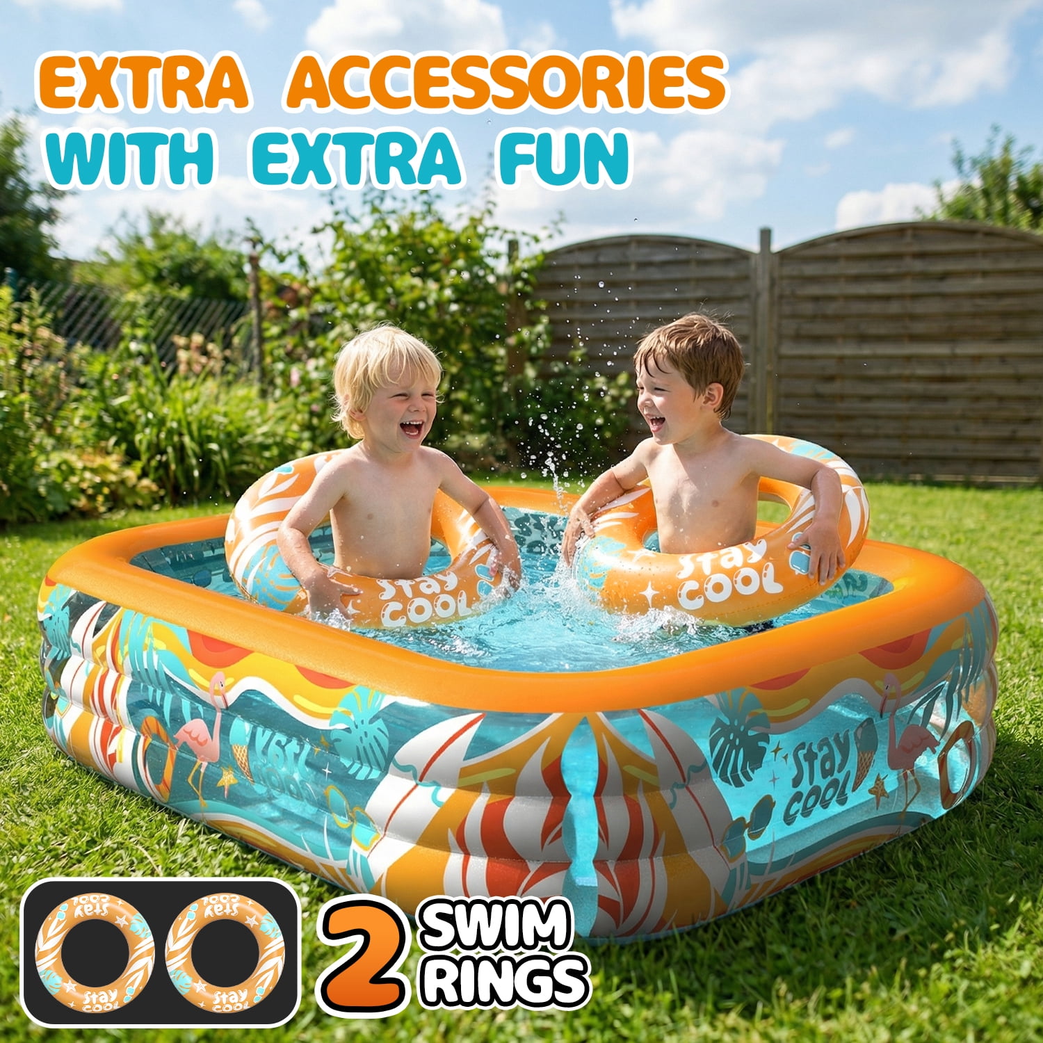 Inflatable Children/Adults Swimming Pools, 120″ x 72″ x 22″, Multicolor 12.7 lbs Safe and durable rectangular inflatable pool made with phthalate and lead-free materials BPA-free construction meets international children’s toy standards Twice thicker than most pools on the market, reducing the risk of punctures Easy to set up; simply spread out on the ground Inflates in 3-4 minutes with an electric pump (not included) Built-in 2 curve water valves double the drainage speed Great gift for kids, families, and pets Can be used as a swimming pool in the backyard or as a ball pit indoors