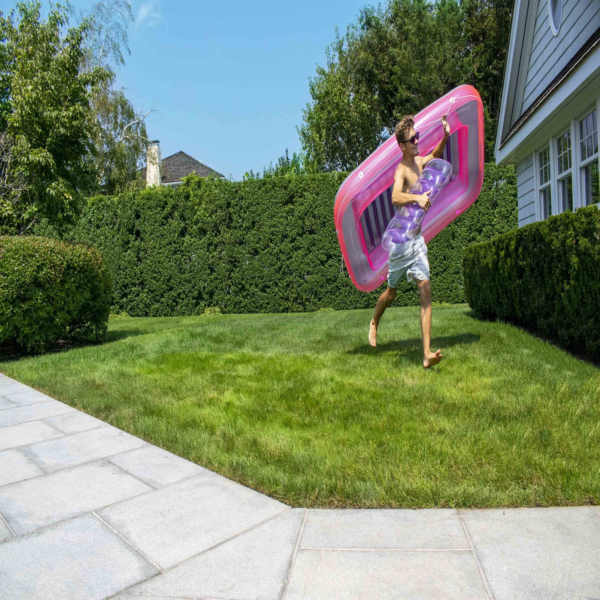 Suntan tub swimming pool raft lounger Features a PVC repair patch for those holes The mattress is a transparent purple and pink color