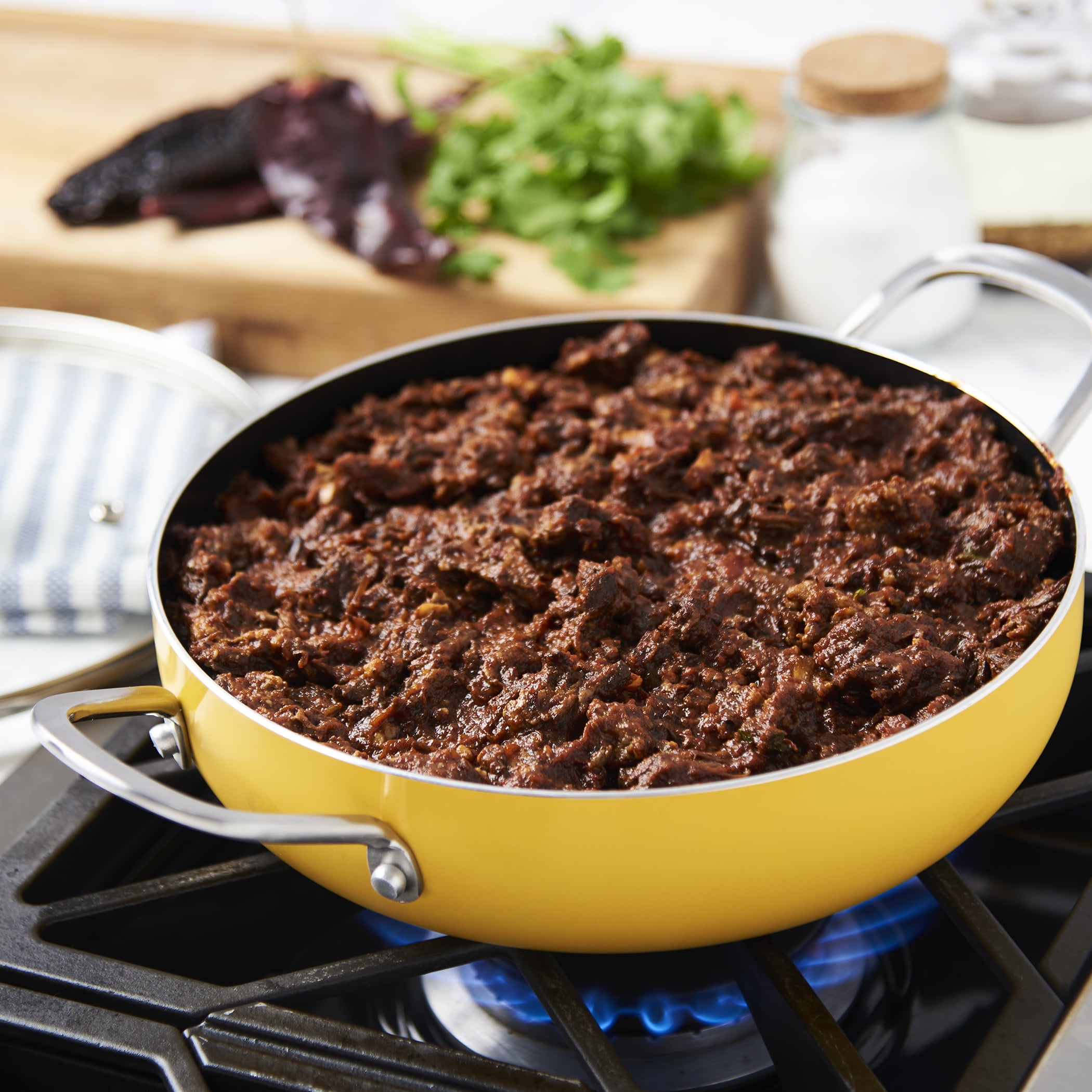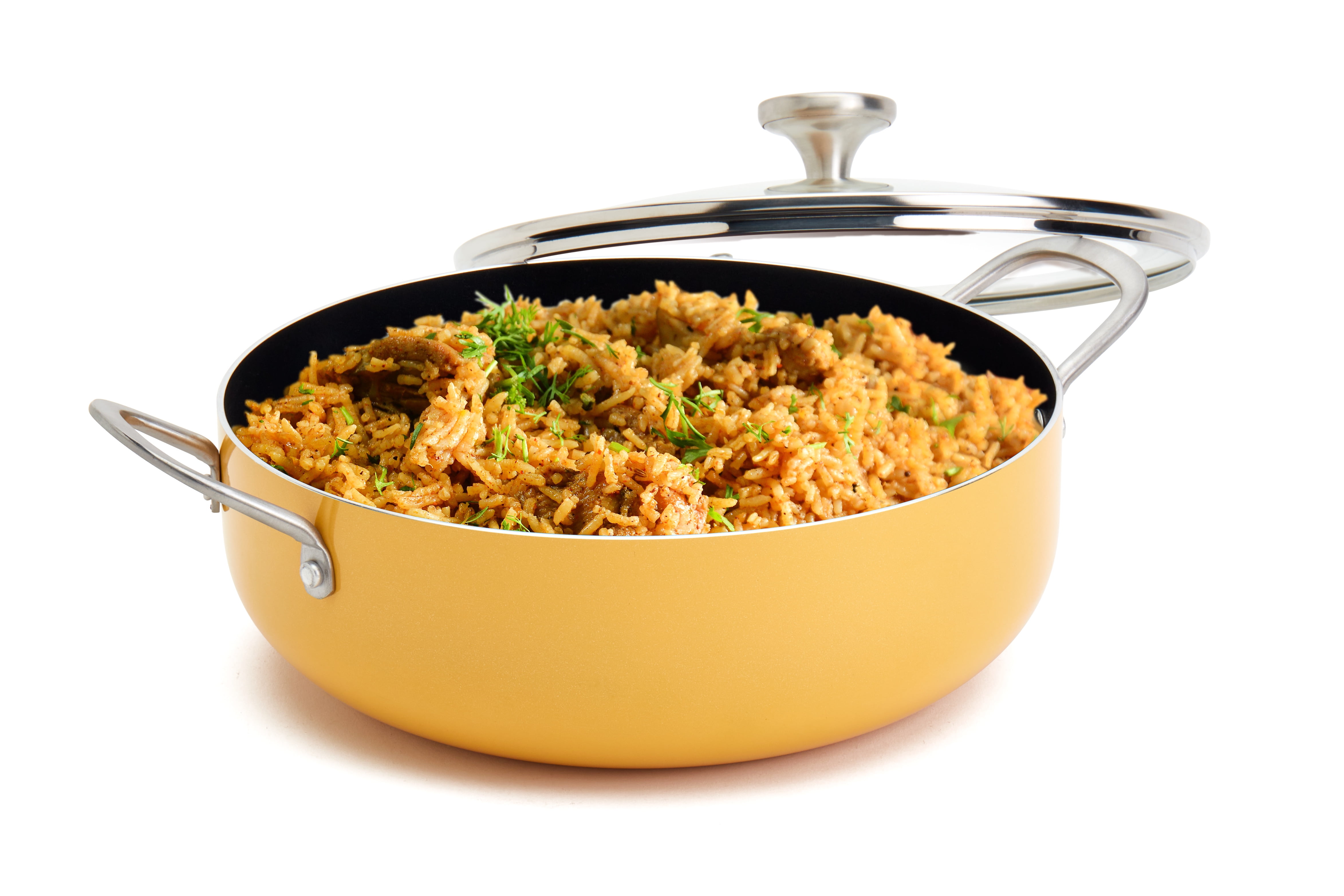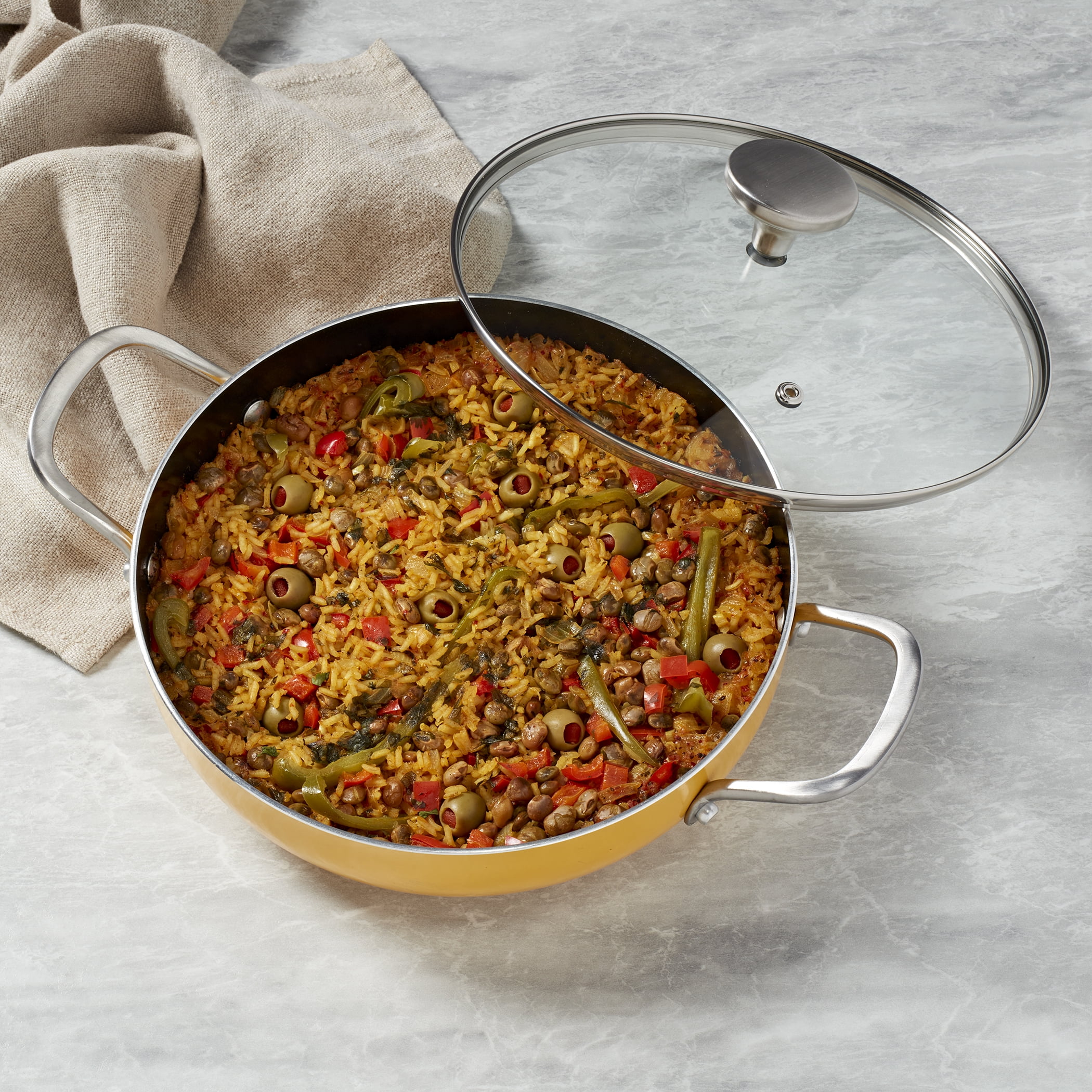 INFUSE brings the intense flavors of Latin cuisine to your kitchen with a cookware collection that celebrates the cultural significance of Latin cooking. Our assortment is designed to honor the rich history of the cuisine and bring out the delightful aromas and delicious flavors that have made the food so popular worldwide. Whether you’re cooking rice, braising meat, or simmering a stew, grab a reliable caldero and enjoy an authentic and deliciously prepared meal. Designed to be a kitchen workhorse, this caldero, from the Spanish ‘cauldron,’ features rounded sides that are built to handle a wide variety of recipes. This stylish 6-quart yellow caldero is dependable and versatile, made of durable aluminum that heats up quickly and evenly, and finished with a premium non-stick coating for excellent food release and easy cleanup.