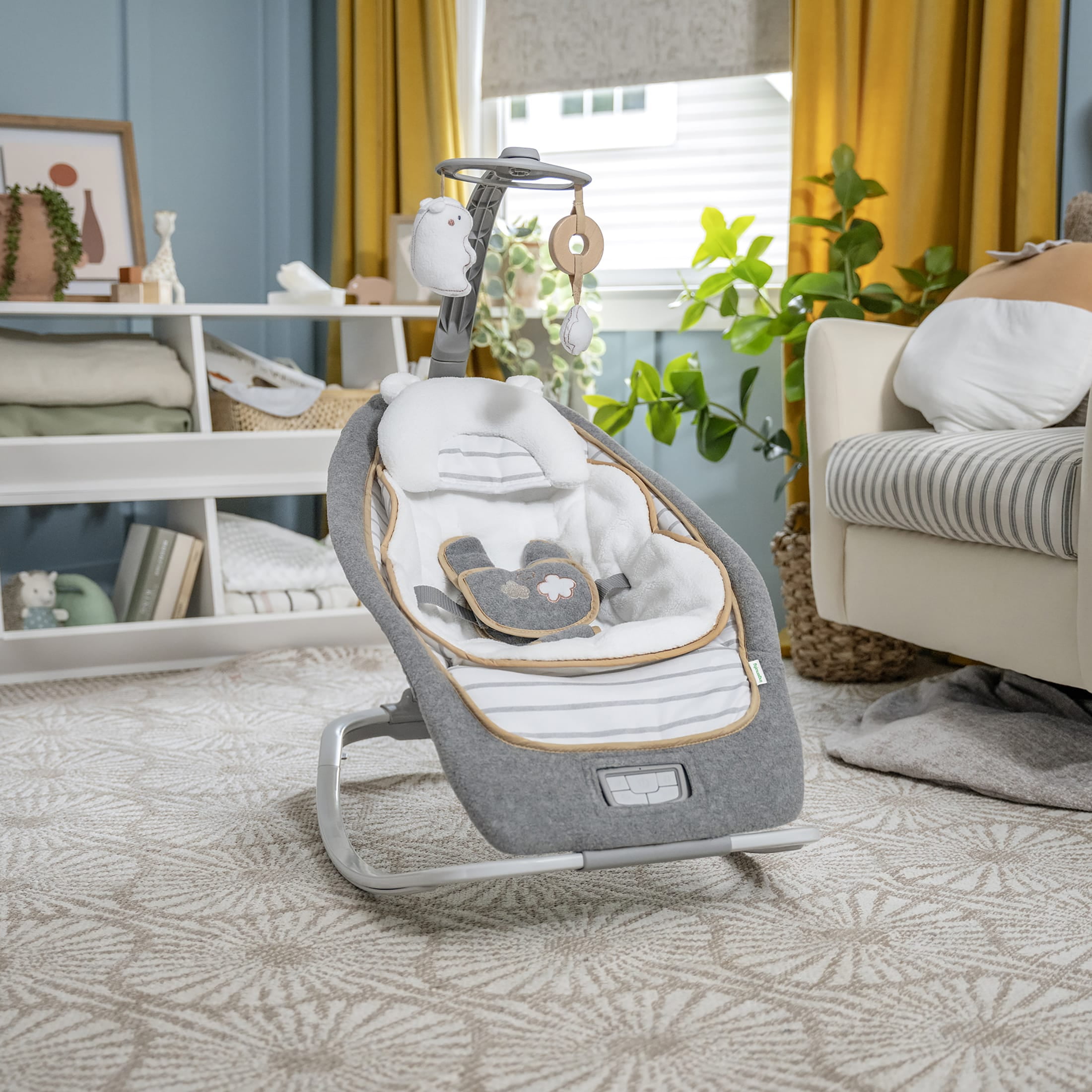 Premium, plush fabrics surround baby in softness Contemporary designer look that you’ll love having in your home Entertains baby with soothing vibrations, music, and nature sounds with volume control Adorable character head rest is wrapped in plush fabric and supports smaller babies, but removes as baby grows Unique recline options – three very distinct recline positions provide more options for baby’s comfort Folds flat for easy and compact storage and transport. Wipeable for easy cleaning