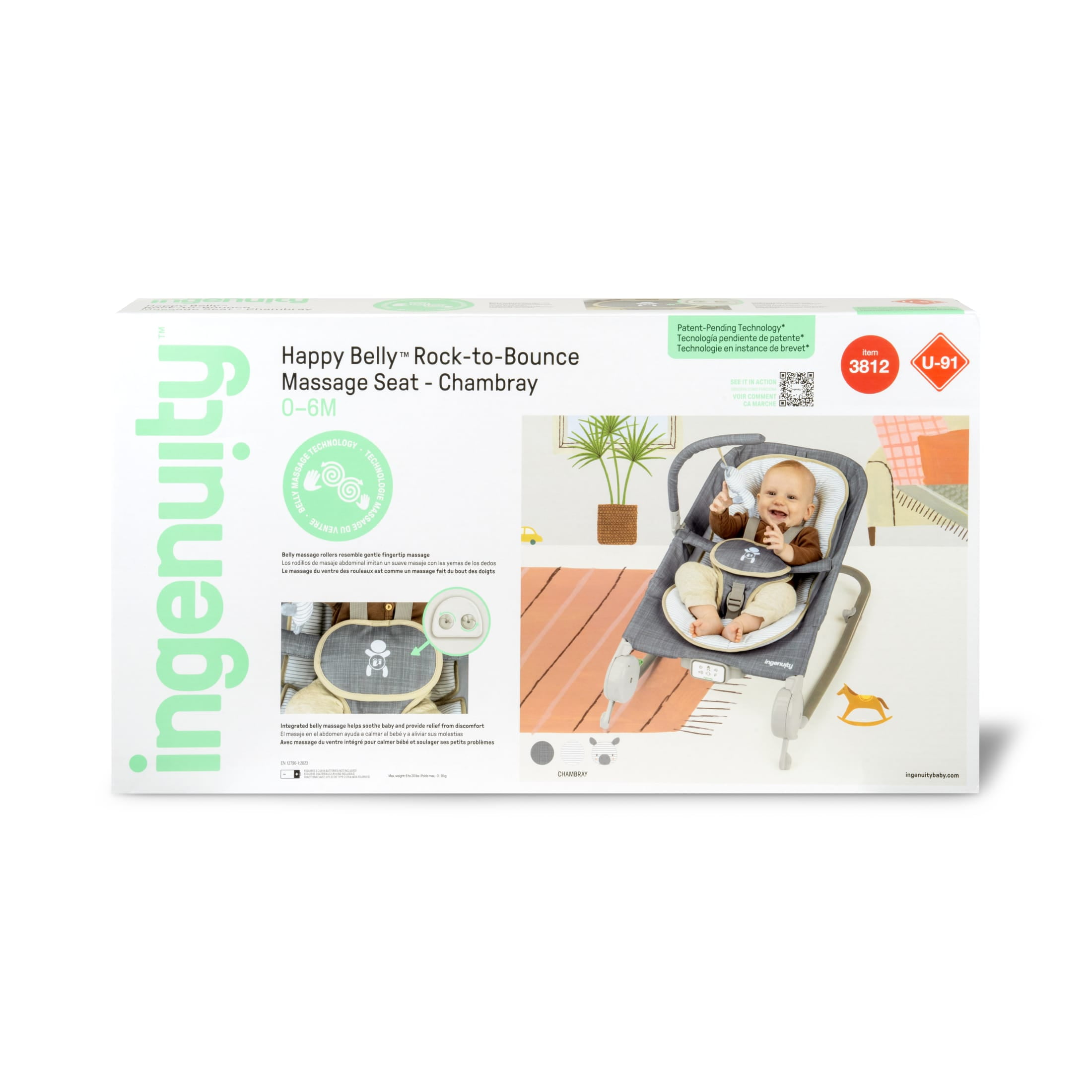 The first-ever, patent-pending Ingenuity Happy Belly Baby Bouncer and Rocker Massage Seat has integrated belly massage technology offering a circular massage motion to help soothe baby and provide relief from discomfort The belly massage rollers resemble a gentle fingertip massage and are safely activated by a parent’s push of a button; Designed in the USA with expert-led medical advice A GentleTouch control pad operates 20 melodies, nature sounds, vibrations and massage; The belly comfort module automatically shuts off after 3 minutes; 3C batteries required Seat seamlessly converts from a bouncing to rocking and offers plush infant insert and 5-point harness keeps baby comfy and safe; Folds flat for easy storage and includes carry bag for easy travel Includes a detachable toy bar with a soft, plush Casi the Zebra character toy; for ages 0-6 months or up to 20 pounds, whichever comes first; the assembled dimensions are 27.4” x 16” x 22”