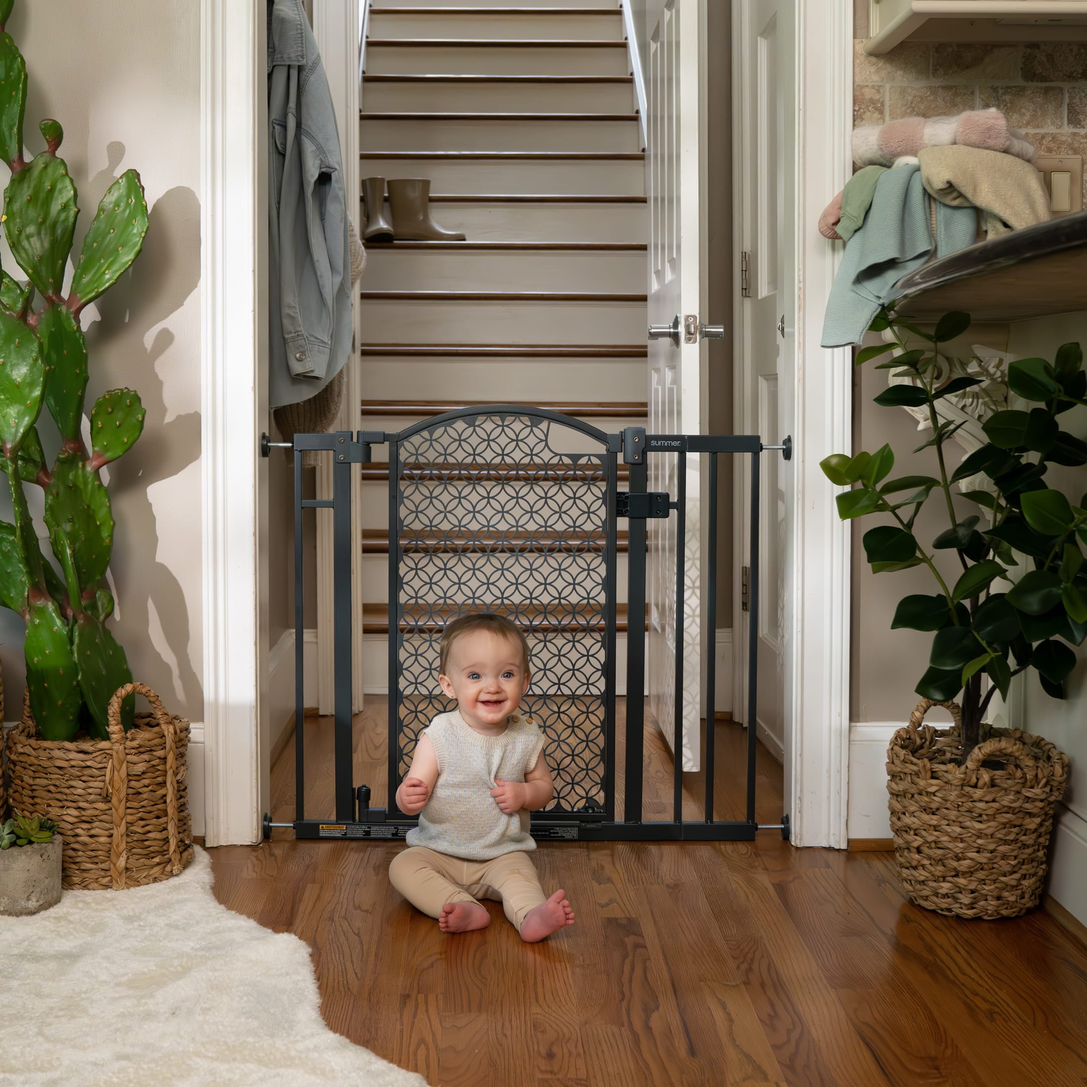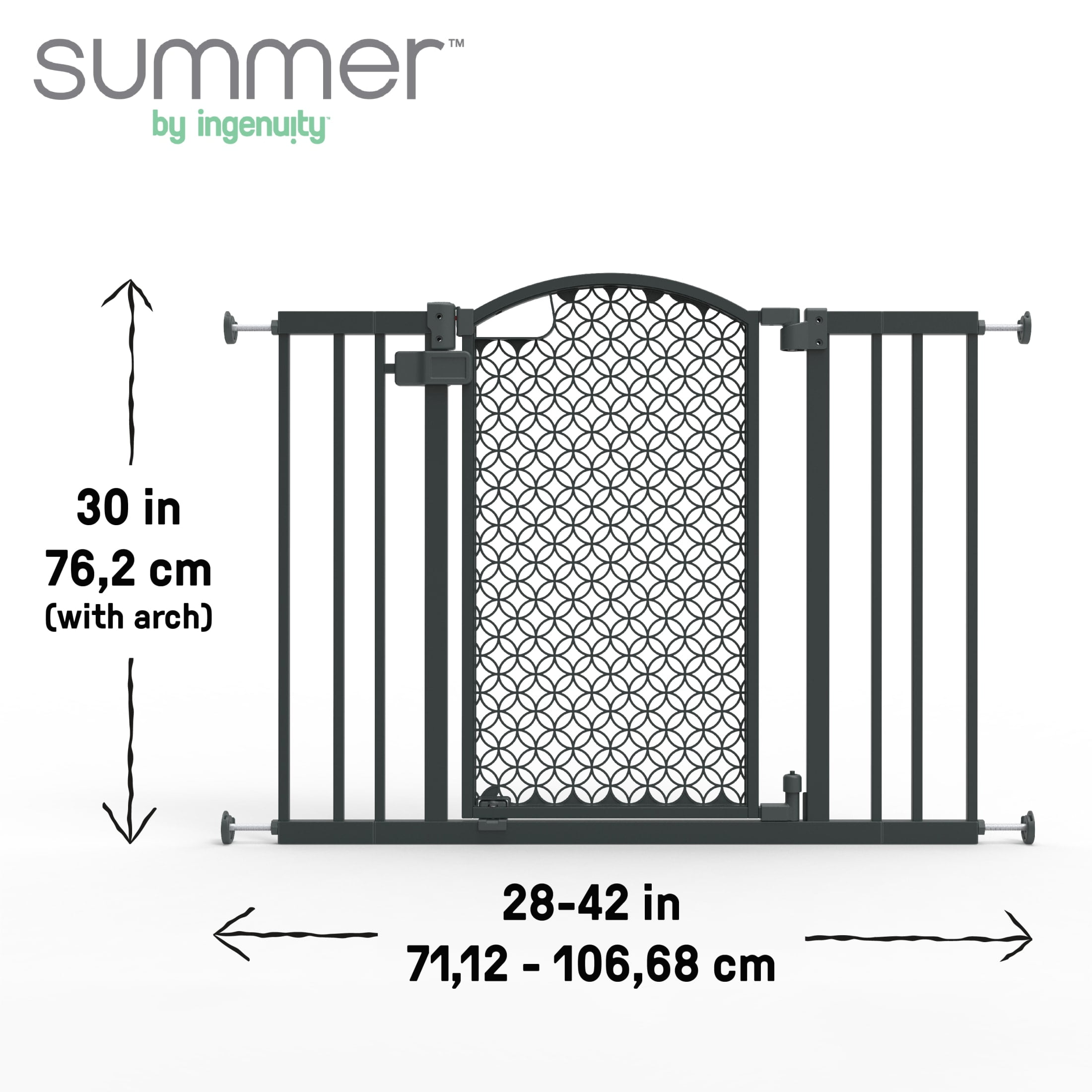 The Ingenuity The Doorway 42W Series Pet and Baby Gate fits openings 28-42″ and is 30″ tall; please measure opening prior to purchase to ensure proper fit Fits in doorways or hallways with easy no-drill pressure mount system to help prevent damage; also fits at top or bottom of stairs, on walls or flat banisters, with included hardware kit 18″ wide door can swing both ways; gate door stays open when engaged greater than 90 degrees; door opened less than 90 degrees auto-closes; stopper prevents door from swinging over stairs when installed at top of stairs Lock door securely to keep babies, toddlers, and dogs contained with narrowly spaced bars that prevent them from squeezing through; adults can open door with one hand by engaging the latch and pulling up on the door Will appear bent at first, but will be corrected upon proper installation; note this gate will not fit an opening 32-33″ or 37-38″
