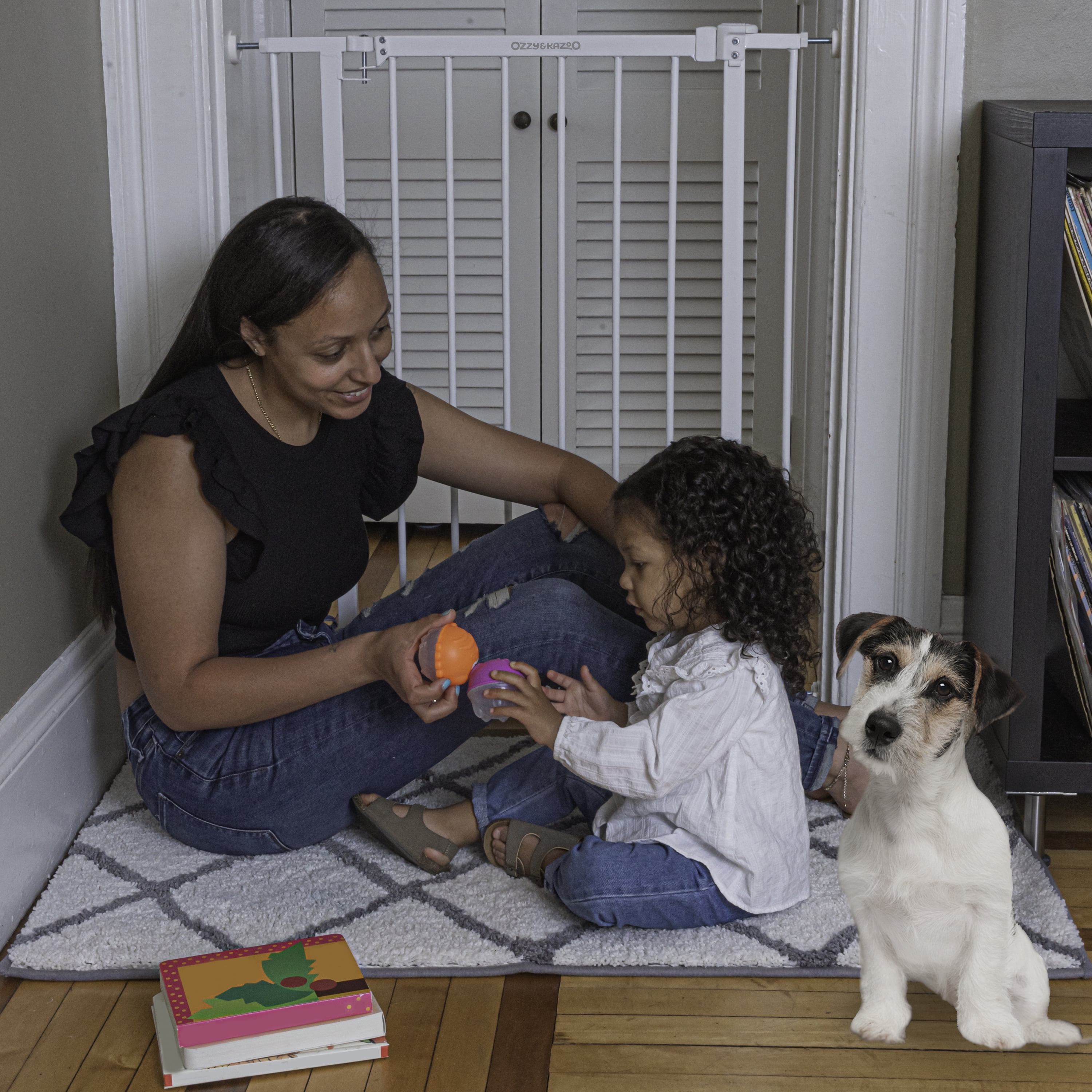 A seamless blend of security convenience and style the Ingenuity Ozzy & Kazoo 36-inch Extra-Tall Walk-Through Dog Gate For Doorways and Stairways meets the needs of both you and your furry friends. Finished in a sleek white hue this metal dog gate seamlessly integrates into any decor scheme ensuring it complements your home s aesthetic without compromising on style even amidst the whimsical chaos of pet-friendly living. Spanning openings from 28.75 to 39.75 inches wide and towering at 36 inches tall this gate provides ample space to contain pets of all sizes ensuring their security within their designated area. Recognizing the diversity of every dog s domain this pet gate comes complete with an installation kit offering both a no-drill pressure mount system with adhesive wall cups for doorways and sturdy hardware for top-of-the-stair setups. Equipped with a generously wide 19.5-inch door navigating through the gate is effortless with just a single hand ensuring seamless passage while maintaining a secure boundary for your furry companions. With a reliable latch system rest assured that your pet gate securely contains your canine companion while a door stopper eliminates it from swinging outward when installed over stairs providing peace of mind for pet owners. Elevate your home s security and style with the Ingenuity Ozzy & Kazoo Extra-Tall Walk-Through Dog Gate where functionality meets fashion for both you and your beloved furry family members.