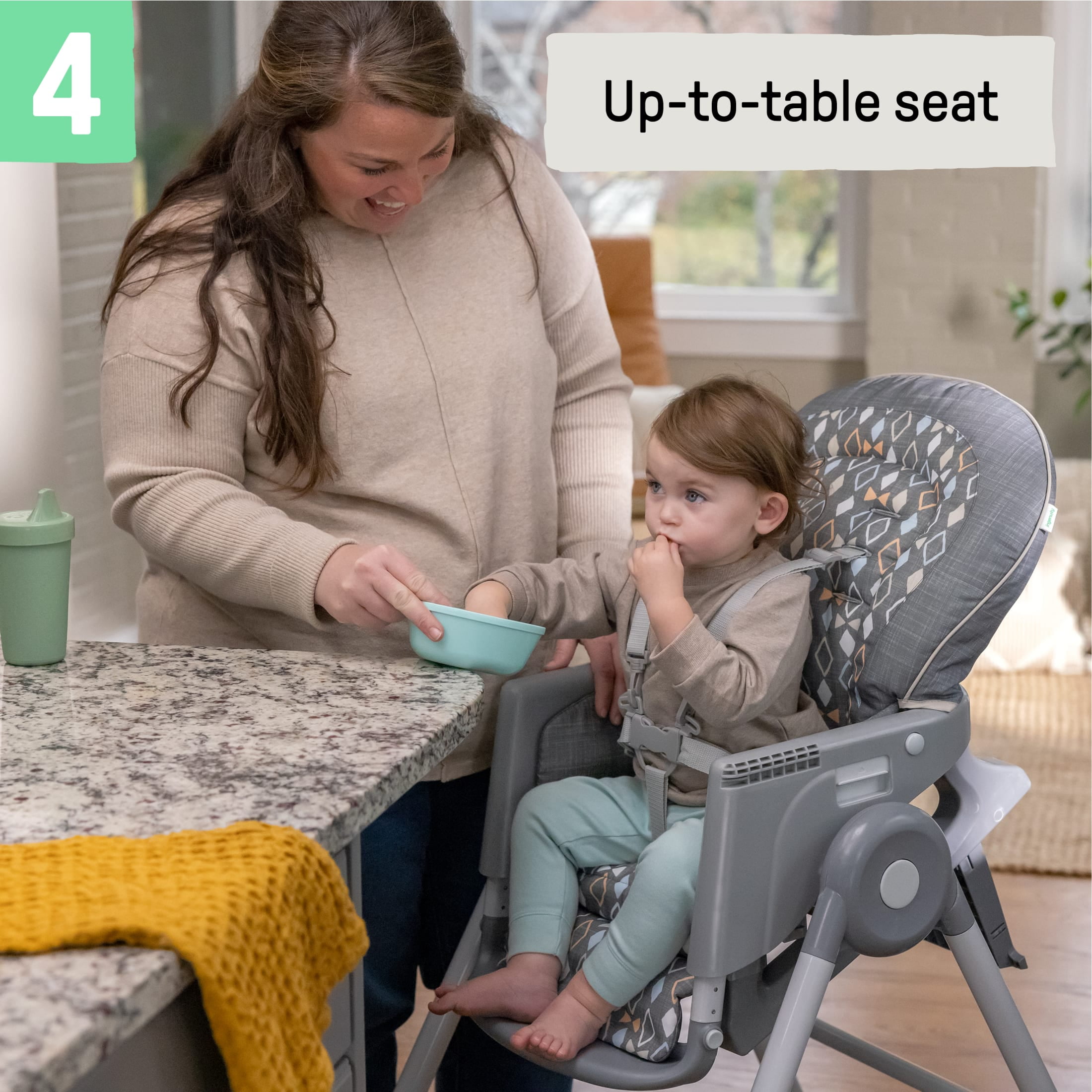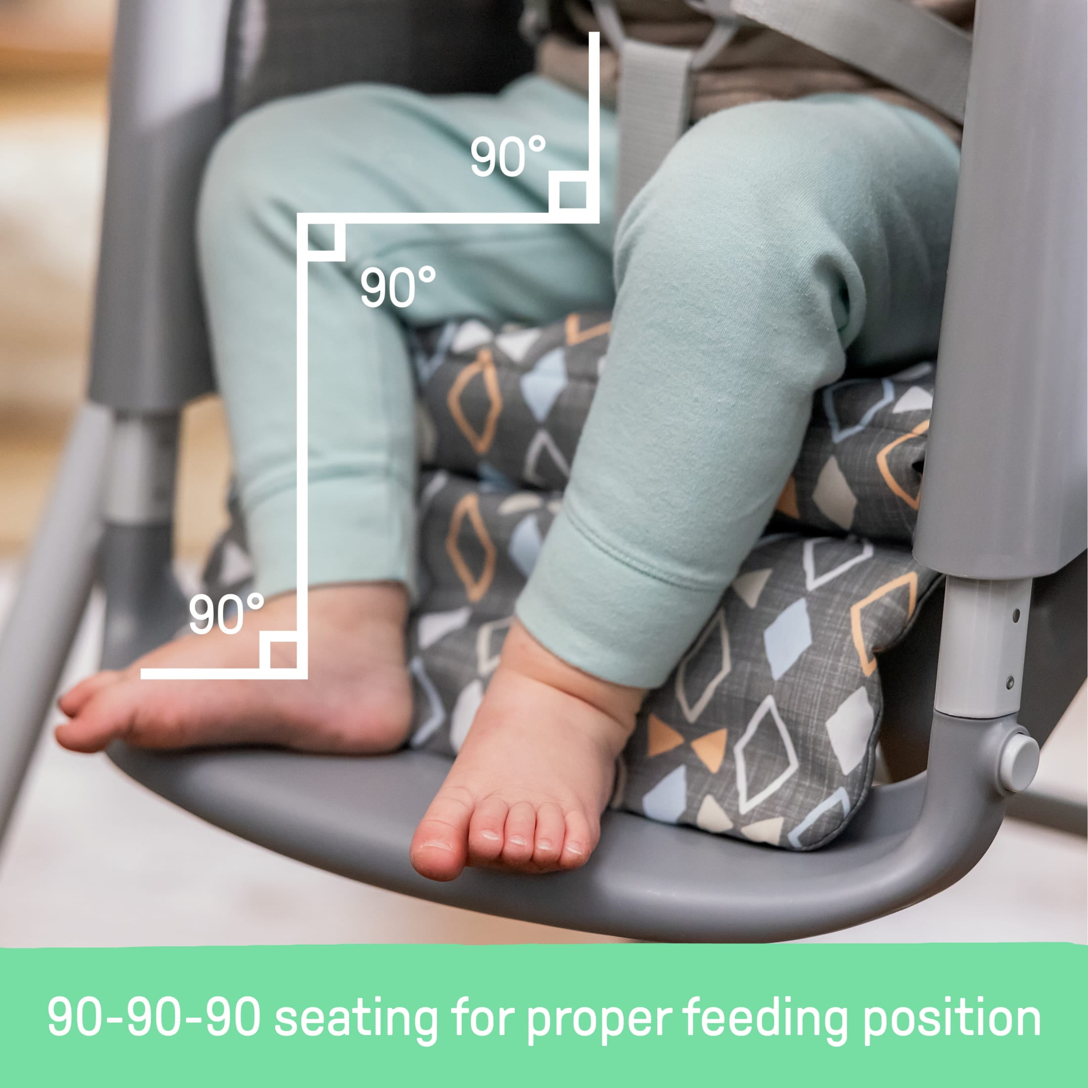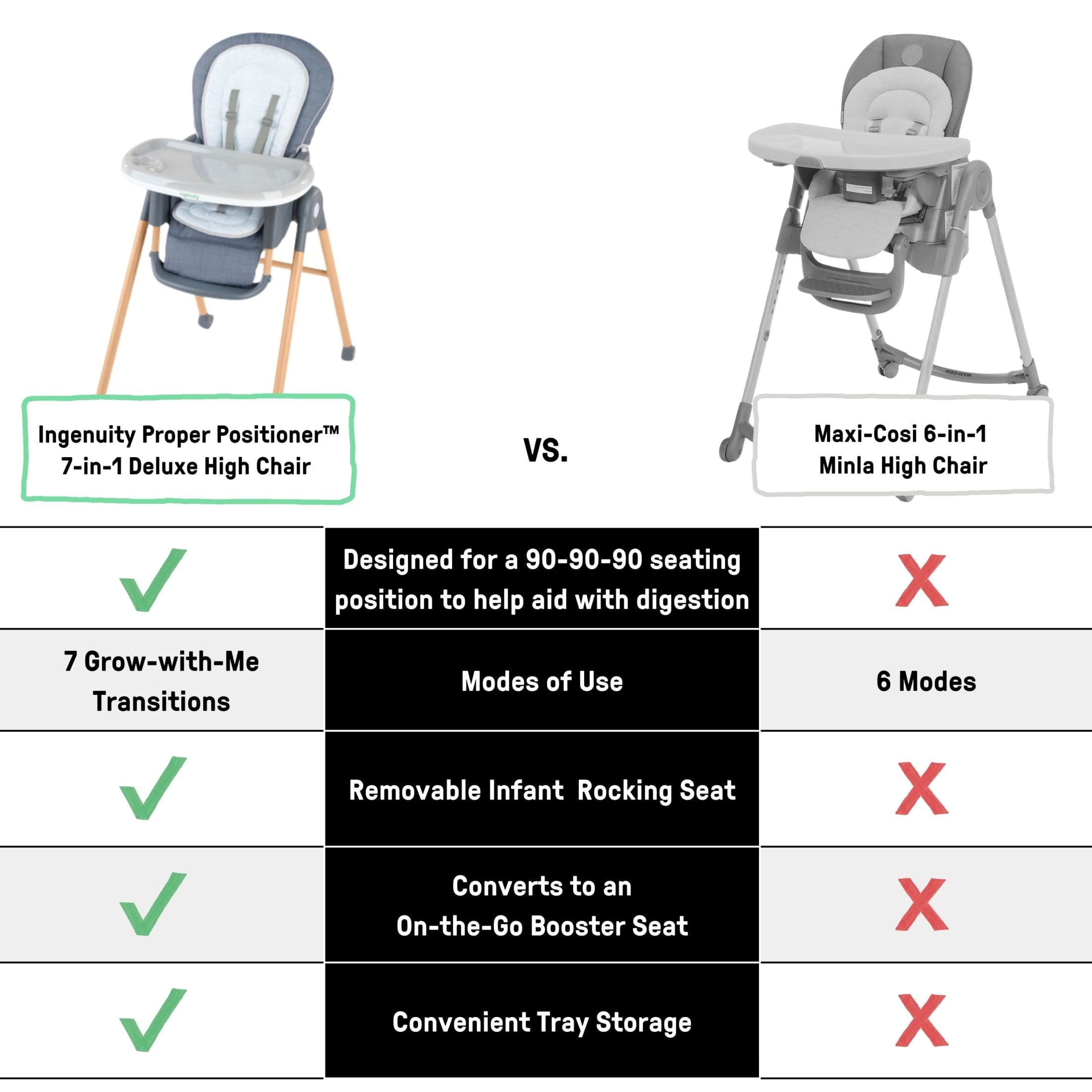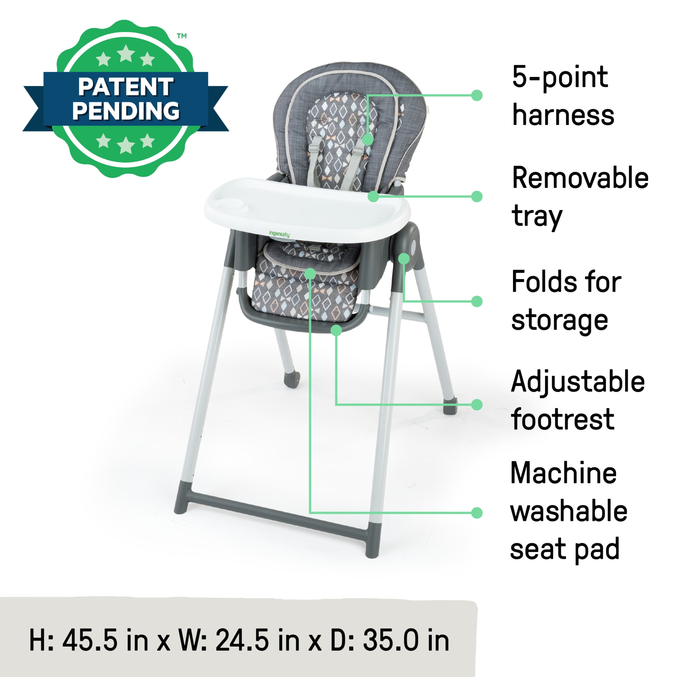 The Ingenuity Proper Positioner 7-in-1 High Chair puts baby in an optimum feeding position making mealtime less stressful for parents! This chair features 7 grow-with-me stages of feeding to promote good posture for better digestion from newborn to toddler The first 2 features cater to baby’s early stages: the full-tilt recline mimics mom’s hold for bottle feeding, while Ingenuity’s first-ever removable rocking infant seat makes it easy to move from room to room As baby grows, so do this infant chair’s features! When your little one is ready for bigger bites, the Proper Positioner moves from a traditional high chair to an up-to-table seat and a chair top high chair Big kid, bigger seating options! This 7-in-1 transforms into a toddler high chair and transitions into a booster, perfect for restaurant dining. The seat offers ergonomic design to help with postural stability while the multi-position, adjustable footrest gives added comfort The removable seat pad and infant insert are machine-washable for easy cleaning. For ages 0-36 months or up to 33 pounds, whichever comes first; assembled dimensions 35” (L) x 24.5” (W) x 45.5” (H)