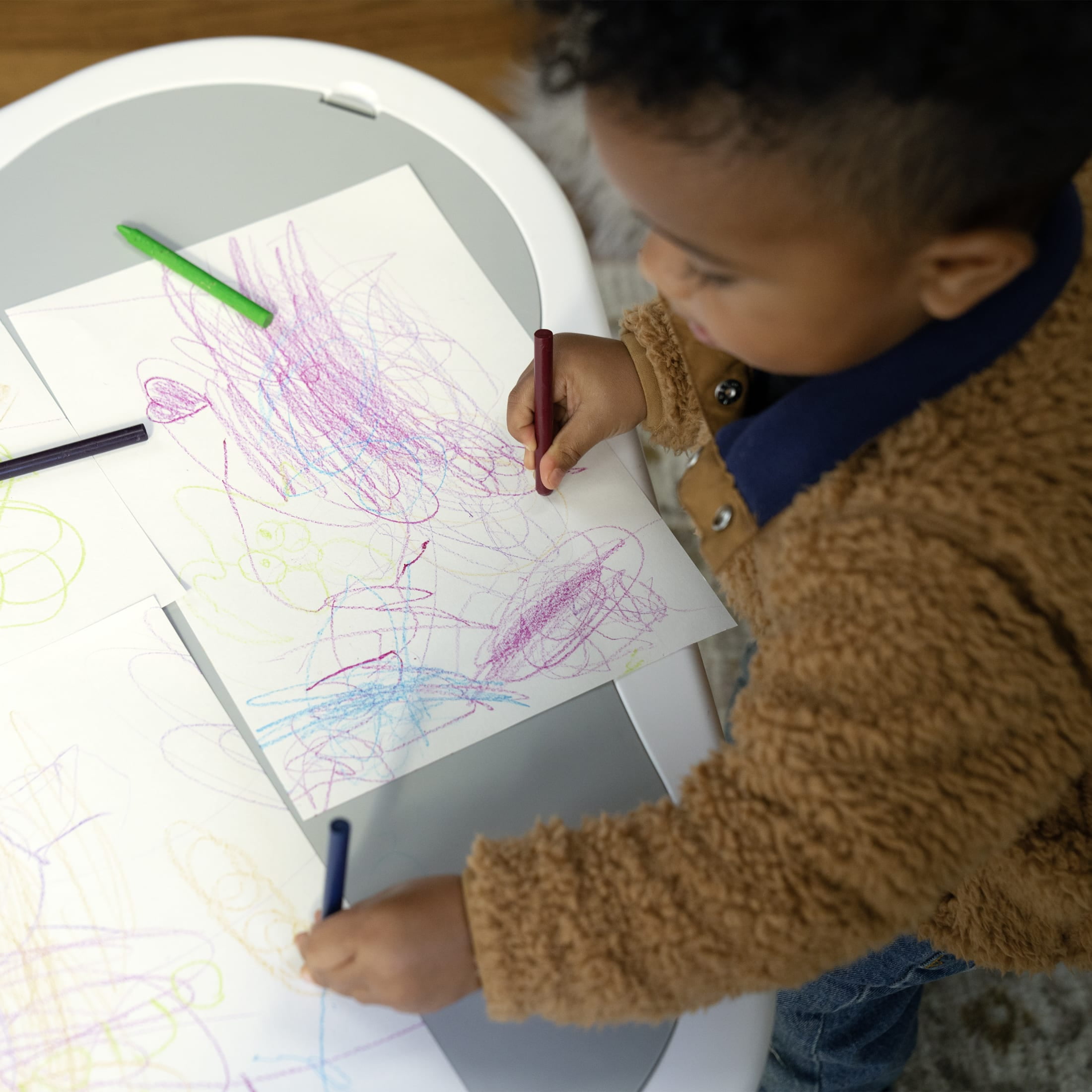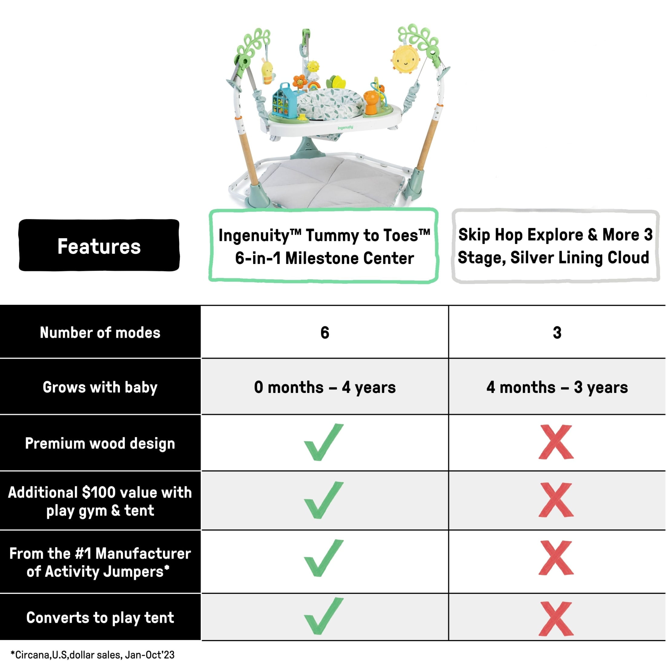 Ingenuity’s Tummy-to-Toes 6-in-1 Milestones Center gives you all the tools you need to build 6 different milestone-based activities from baby to big kid Fun starts on day 1 with the the floor gym which helps baby with reaching and grasping. The toy bar includes a detachable plush Bomby the Bumblebee, a BPA-free cloud toy, and sun mirror The soft, quilted, and padded mat gives baby a cozy place to play; the mat comes with a prop pillow for additional support and link loops to attach baby’s favorite toys; mat folds up for on the go play Encourage imagination, plus cause and effect, with the toy greenhouse, which has lights, music, and nature sounds for baby to “water” and give “sunlight” to plants; 3 AA batteries required (not included) Baby will jump for joy in 360° play at 3 different toy stations; adjusts to 4 heights. Jumper converts to table with premium, modern legs. Next, the playhouse encourages pretend play Note: Due to product improvements, table legs may differ slightly from images.