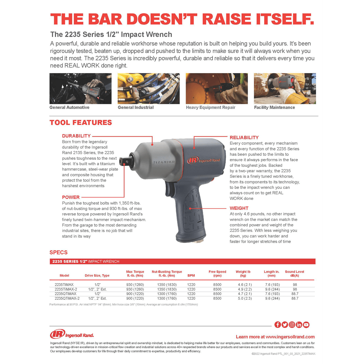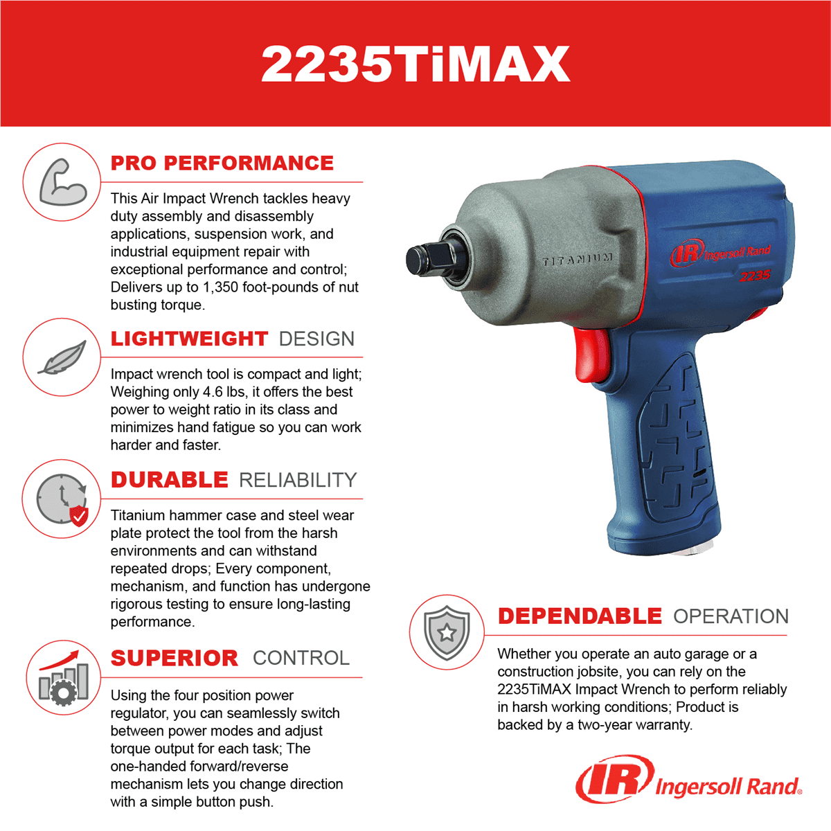 Ingersoll Rand 2235TIMAX, 1/2″ Pneumatic Impact Wrench Punish the toughest bolts with up to 1,350 ft-lbs. of nut-busting torque and up to 930 ft-lbs. of maximum reverse torque The proprietary twin hammer impact mechanism delivers maximum power and performance Rugged titanium hammer case and steel wear plate ensure maximum durability and service life Finely tuned to push the limits and tackle even the toughest of jobs Best-in-class power-to-weight ratio at only 4.6 lbs