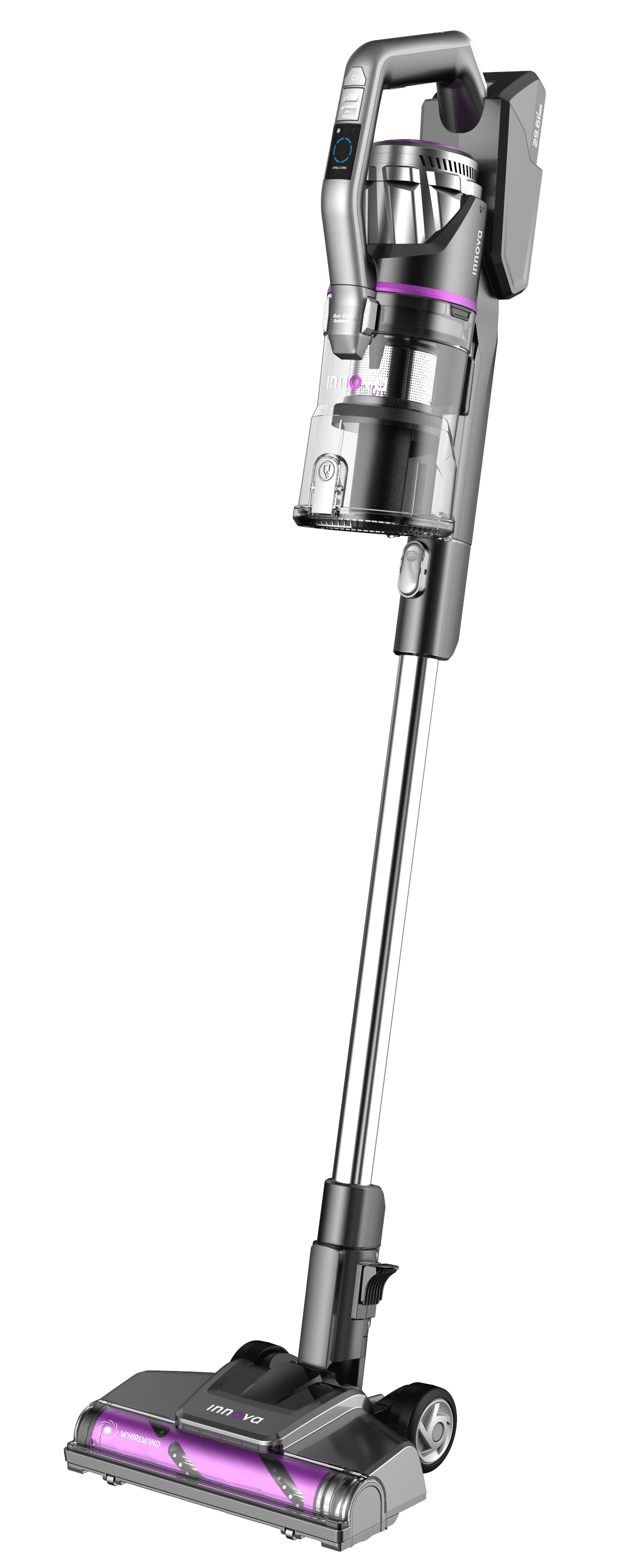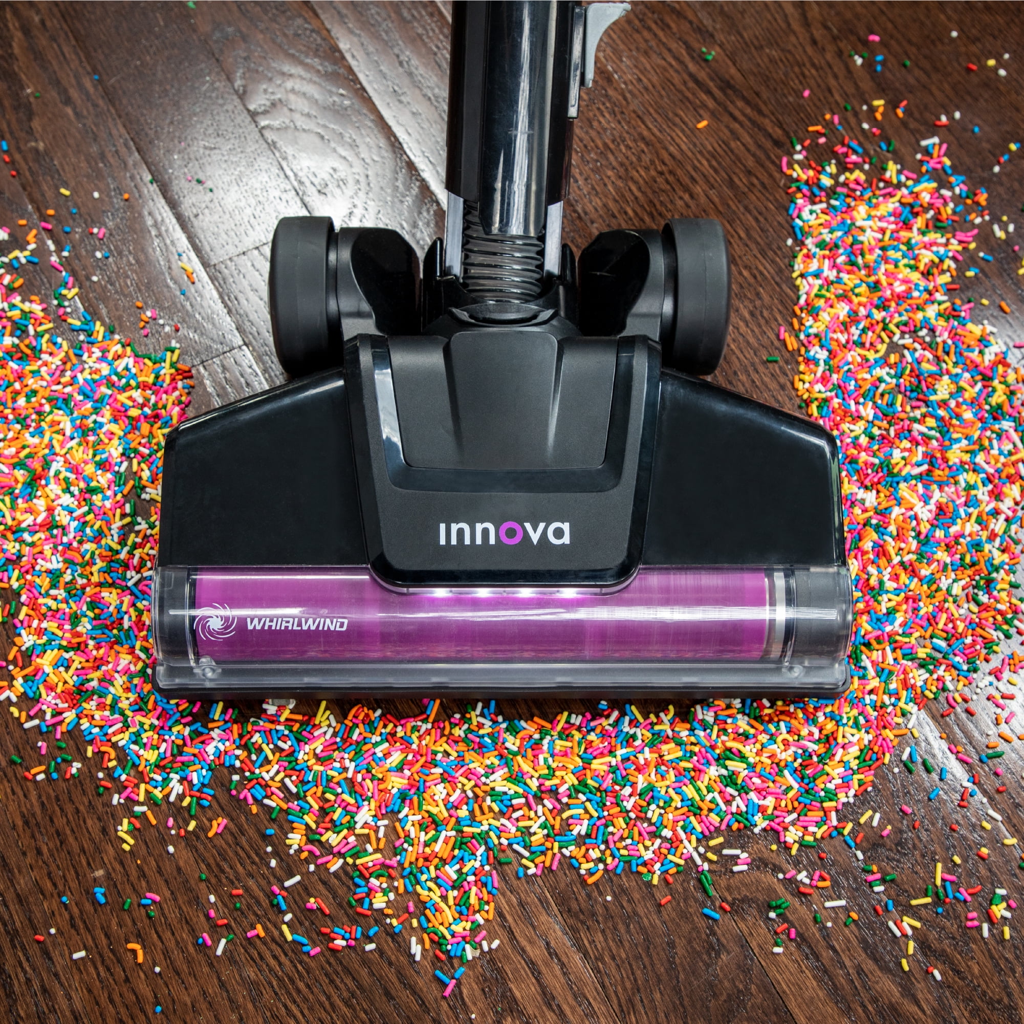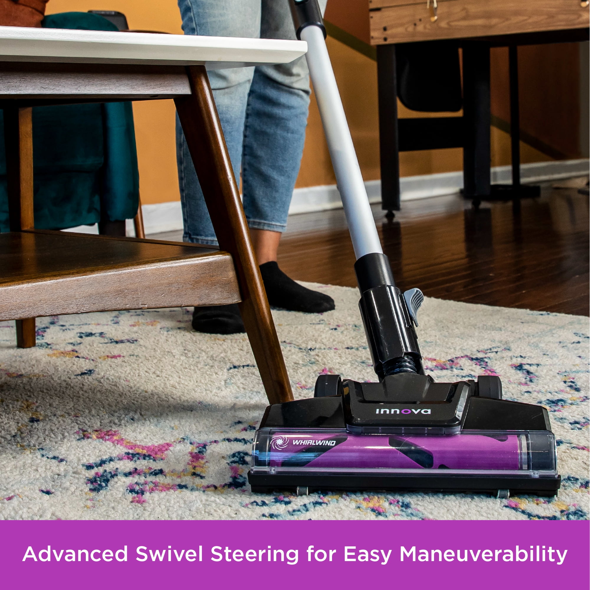 WhirlWind® Anti-Tangle Brushroll: Whirlwind Anti-Tangle Technology actively breaks hair to prevent tangles and clogs from forming. Whirlwind anti-tangle technology concentrates air flow for a deeper clean. Fade-Free Runtime: Up to 60 minutes runtime of fade-free powerful consistent suction for an enhanced cleaning experience. Brushroll and Suction Control: Fingertip controls with an LED user interface allow you to optimize your cleaning for every surface. Accessories Included: Includes a motorized anti-tangle pet tool attachment, crevice tool and 2-in-1 dusting/upholstery brush as well as a separate charging dock for convenient recharging anywhere you want so the Innova is ready and waiting for it’s next challenge. Motorized Pet Tool: Motorized anti-tangle pet tool effectively removes hair and debris from stairs and upholstery. Grab & Go Convenience: Lightweight at less than 8 lbs., yet powerful enough to clean both carpet and hard floors. Removable Battery: Removable and replaceable battery for easy charging. XL Capacity Easy-Empty Dust Cup: Easy-empty 1L dust cup allows for convenient uninterrupted cleaning. LED Headlights: LED Headlights make it easy to spot dust and debris you might otherwise have missed. Easily Converts to a Hand Vacuum: Easily converts to a cordless handheld vacuum with versatile accessories for convenient above floor cleaning in hard-to-reach places in your home or in your car. Lay Flat Design: Lay flat design to help you easily clean under furniture. Easy Rest Feature: Allows you to prop the vacuum up against furniture or counters without it falling. Sleek & Stylish: Featuring a sleek silver base, with stylish purple accents, this is the perfect addition to any home!