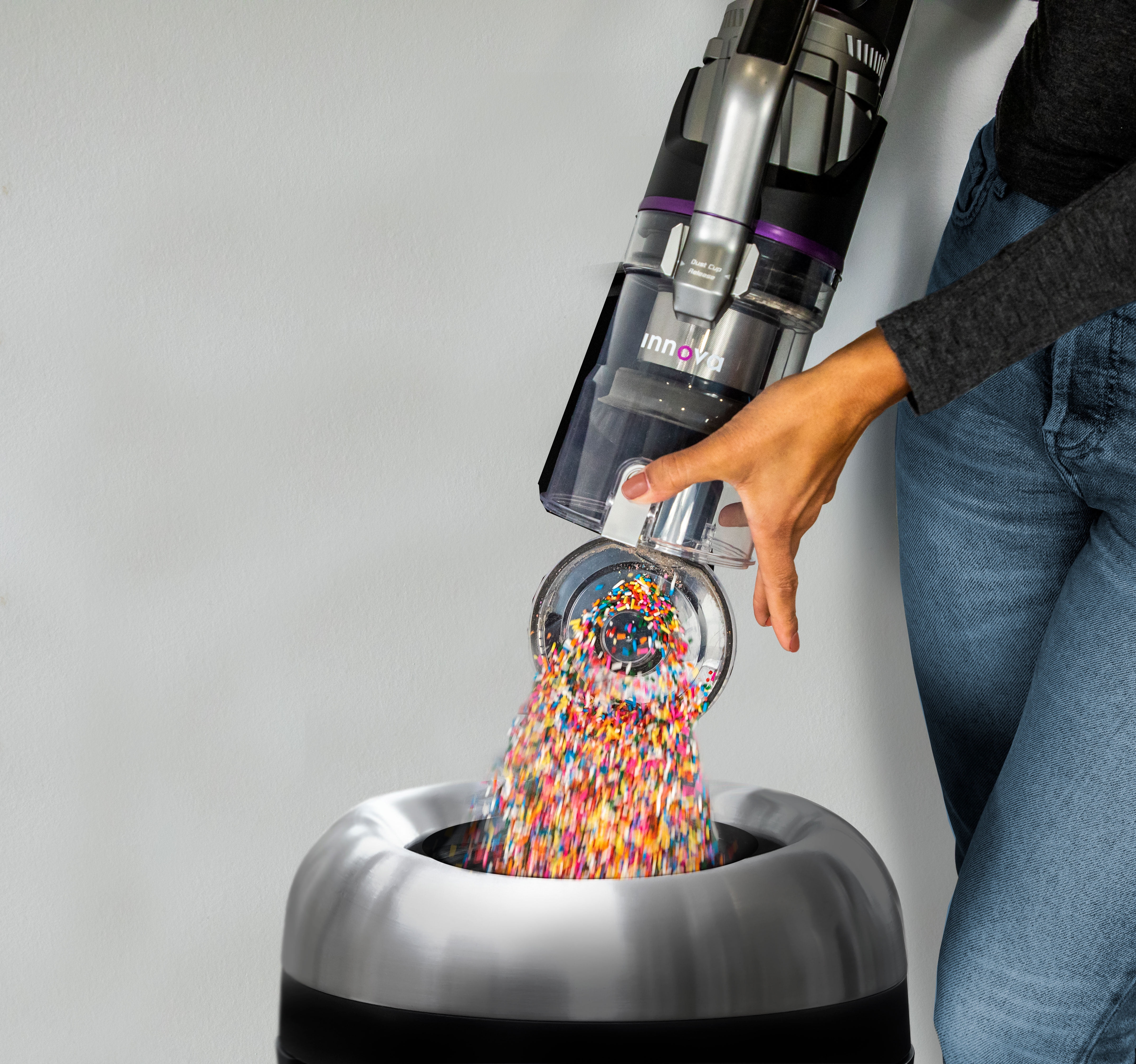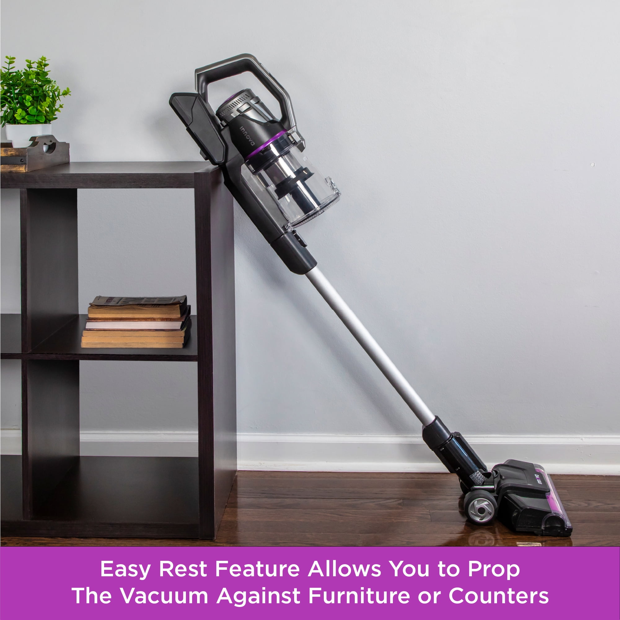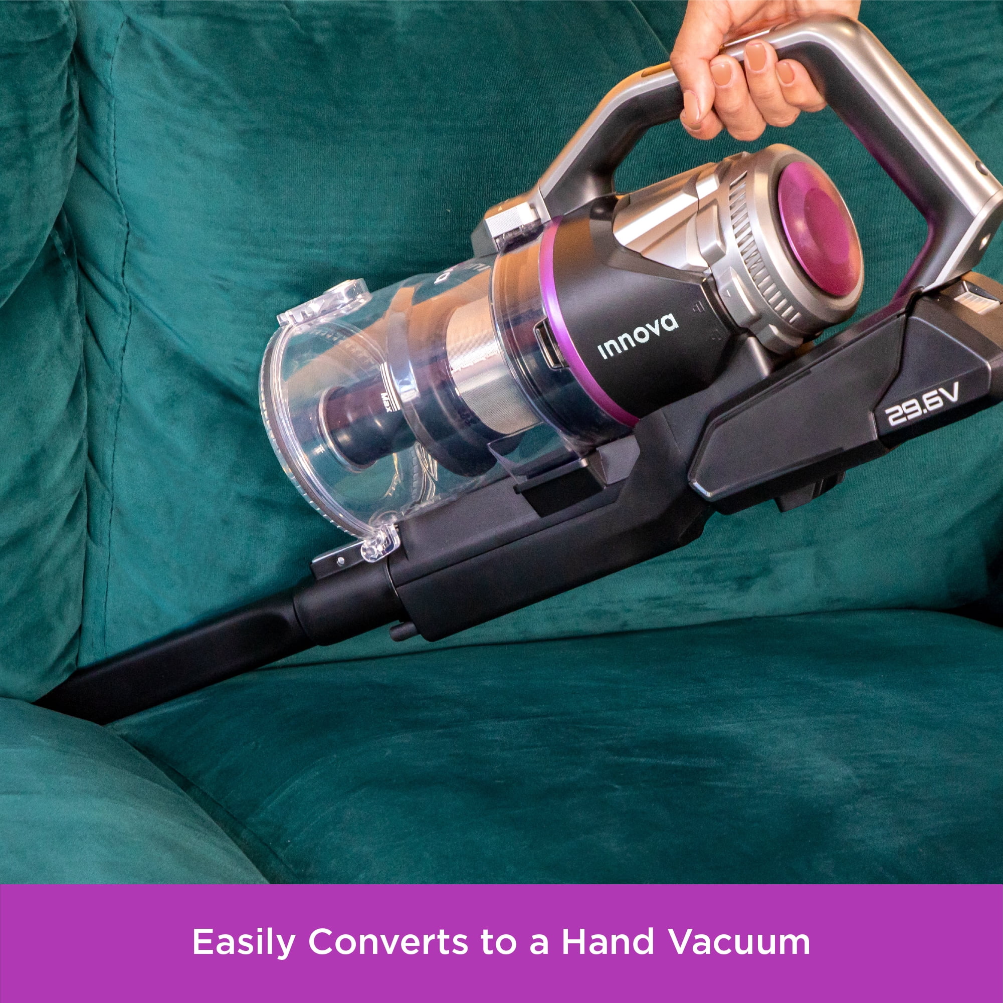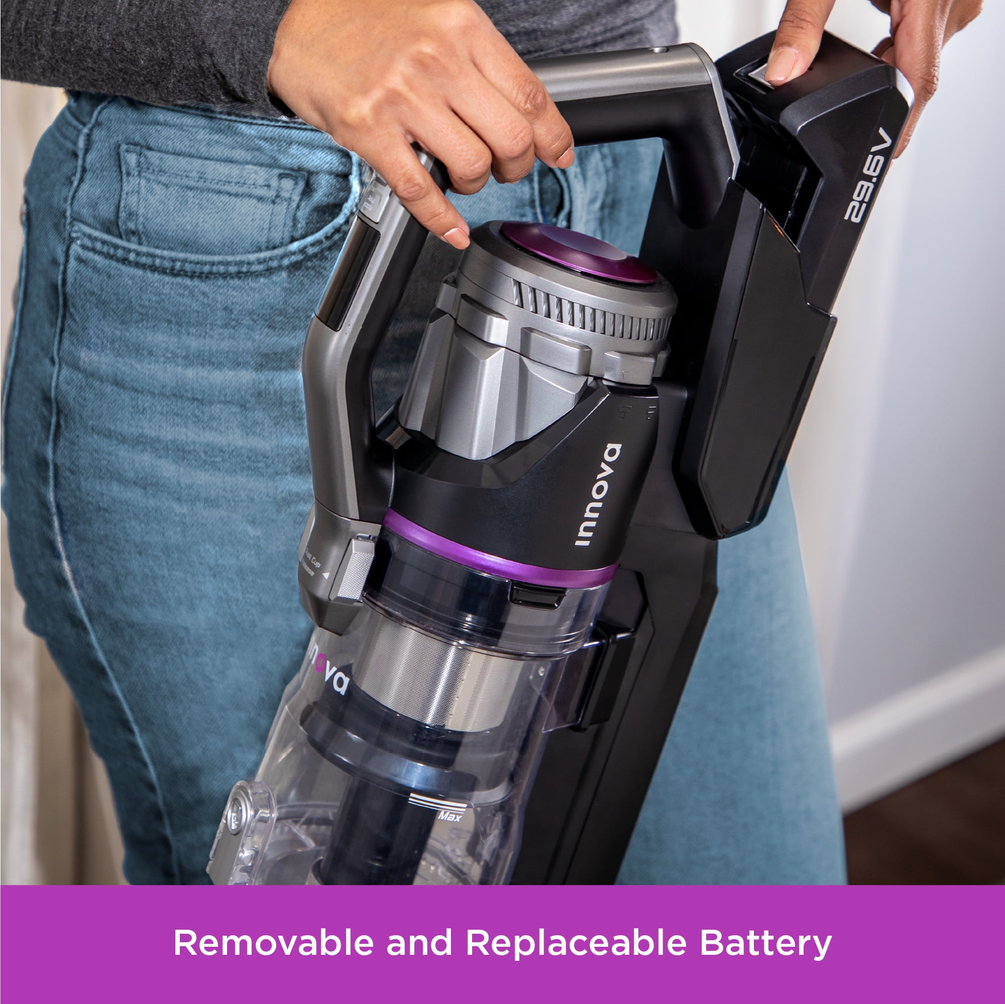 WhirlWind® Anti-Tangle Brushroll: Whirlwind Anti-Tangle Technology actively breaks hair to prevent tangles and clogs from forming. Whirlwind anti-tangle technology concentrates air flow for a deeper clean. Fade-Free Runtime: Up to 60 minutes runtime of fade-free powerful consistent suction for an enhanced cleaning experience. Brushroll and Suction Control: Fingertip controls with an LED user interface allow you to optimize your cleaning for every surface. Accessories Included: Includes a motorized anti-tangle pet tool attachment, crevice tool and 2-in-1 dusting/upholstery brush as well as a separate charging dock for convenient recharging anywhere you want so the Innova is ready and waiting for it’s next challenge. Motorized Pet Tool: Motorized anti-tangle pet tool effectively removes hair and debris from stairs and upholstery. Grab & Go Convenience: Lightweight at less than 8 lbs., yet powerful enough to clean both carpet and hard floors. Removable Battery: Removable and replaceable battery for easy charging. XL Capacity Easy-Empty Dust Cup: Easy-empty 1L dust cup allows for convenient uninterrupted cleaning. LED Headlights: LED Headlights make it easy to spot dust and debris you might otherwise have missed. Easily Converts to a Hand Vacuum: Easily converts to a cordless handheld vacuum with versatile accessories for convenient above floor cleaning in hard-to-reach places in your home or in your car. Lay Flat Design: Lay flat design to help you easily clean under furniture. Easy Rest Feature: Allows you to prop the vacuum up against furniture or counters without it falling. Sleek & Stylish: Featuring a sleek silver base, with stylish purple accents, this is the perfect addition to any home!