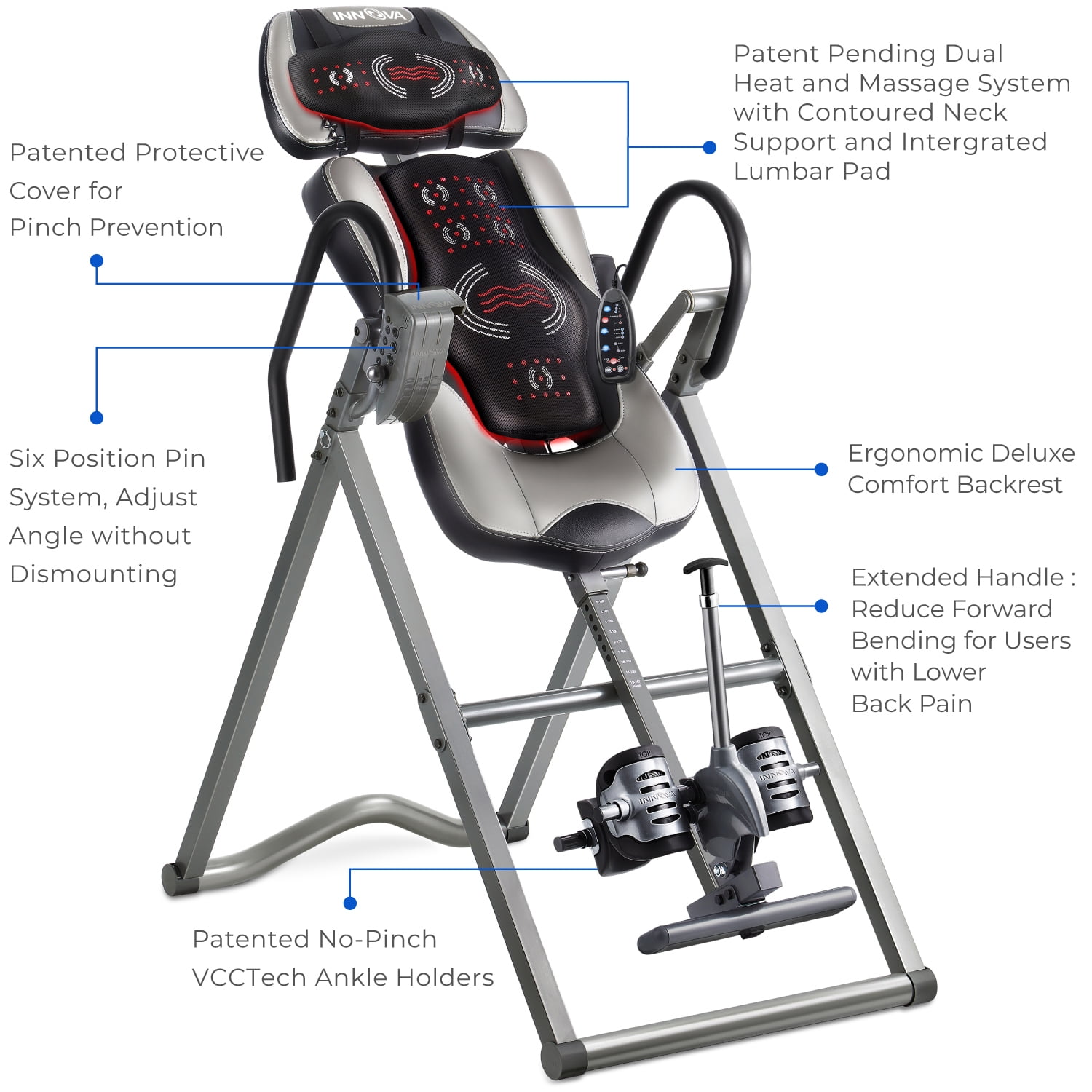 Innova Health and Fitness ITM6000 Advanced Heat and Massage Therapeutic Inversion Table upto 300 lb Heavy-duty inversion table designed for comfort and effectiveness Features a revolutionary dual heat and massage pad that targets neck and spinal regions Offers multiple massage modes and two heat levels for a customizable experience Large backrest and adjustable headrest provide added comfort during use Soft touch foam handlebars ensure a secure grip for easy inversion