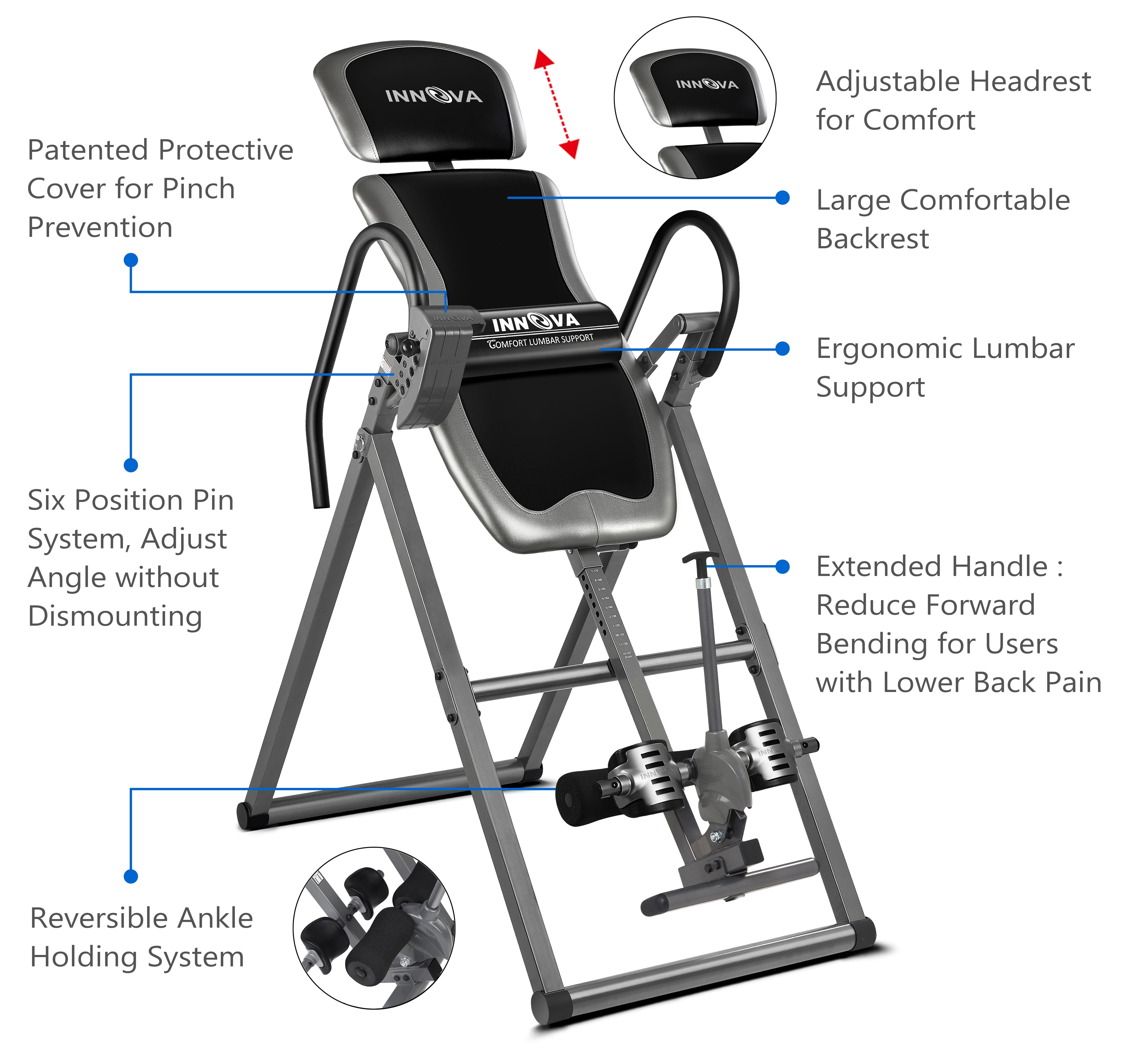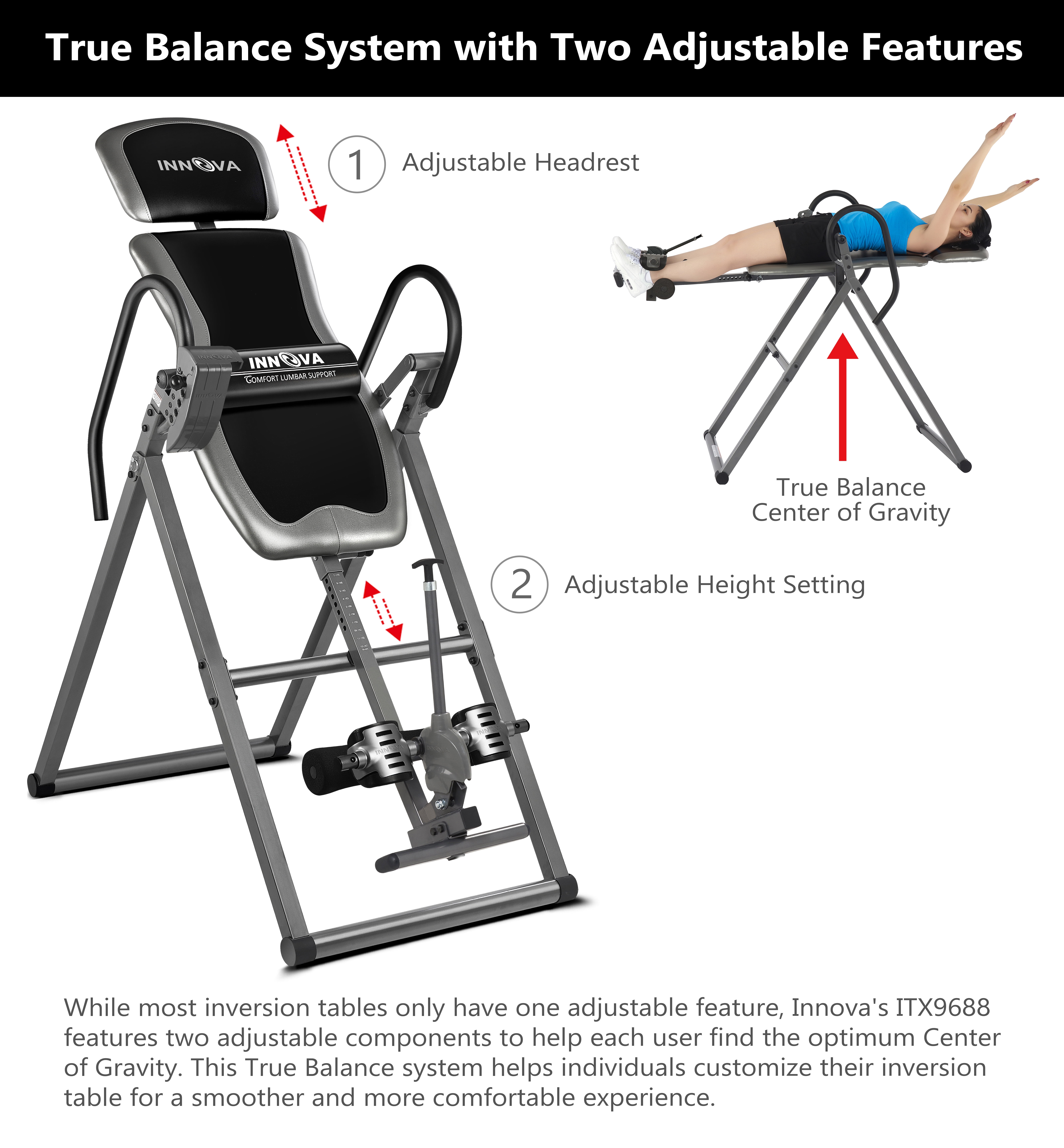 Innova Health and Fitness, Model ITX9688 The Innova ITX9688 is a heavy-duty inversion table that comes with many features that set it apart from other inversion tables. Starting with its large backrest, adjustable headrest, and soft touch foam handlebars, it provides a comfortable, easy inversion. But these are just the basics. The ITX9688’s True Balance System allows each user to find their own unique center of gravity. The Six Angle Pin System allows users to trust that the ITX9688 will easily, safely, and consistently deliver on the finest inversion experience. True Balance System – Double Adjustment Structure Unlike other inversion tables, which only have one adjustable part, the ITM4800’s True Balance System has two adjustable features, to help each individual user find the smoothest and most comfortable inversion experience for them. The True Balance Structure allows users to adjust the headrest and the height to micromanage the center of gravity. The 6-Angle Pin System with Protective Cover The ITM4800 also includes a patented protective cover for the easy to adjust six angle pin system. Just position the pin in the desired slope and know that your inversion position will be safe, comfortable, and consistent every time. Old tether strap systems require the user to dismount entirely and climb underneath the table in order to adjust and can loosen after repeated use. Disclaimer: inversion tables are intended to provide immediate and lasting back relief, but may not work for all customers, we cannot guarantee pain relief with the purchase of this product Safety Information: Consult with a licensed physician before using this inversion table. Some medical conditions may not be suitable for use with this product. Disclaimer: Although we strive to ensure all product details and information is accurate, there may be slight variations by the manufacturer. Actual product packaging and materials may vary and may contain different information than shown on our product page or website. Please do not rely solely on the information presented and be sure to read all labels, warnings, and instructions before using the product. For additional information on the product, please do not hesitate to contact the manufacturer.