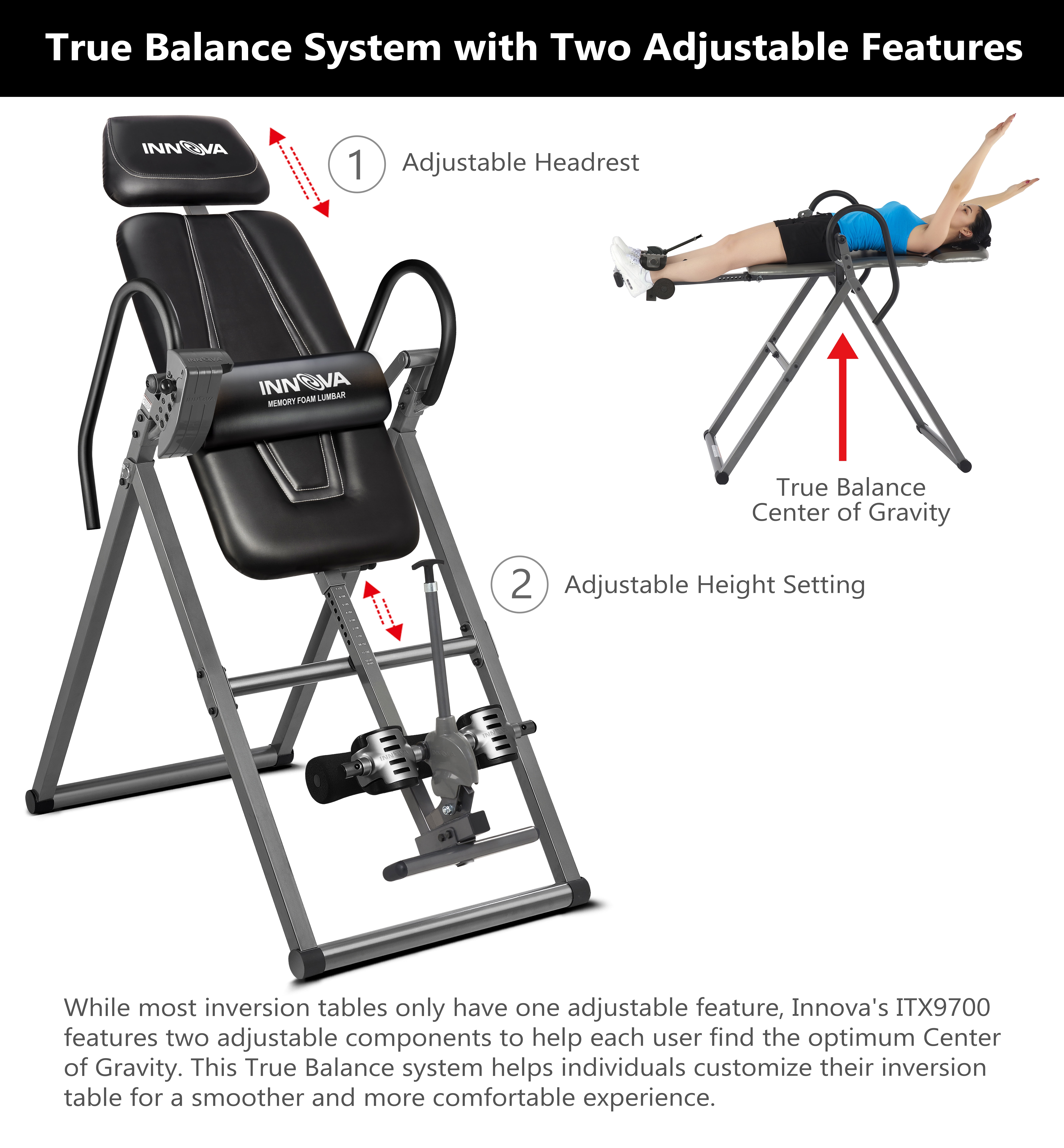 Innova Health and Fitness, Model ITX9700 The Innova ITX9700 is a heavy-duty inversion table that comes with many features that set it apart from other inversion tables. Starting with its adjustable Memory Foam Lumbar Pad the allows for a more relaxed inversion. This model also has a large backrest, adjustable headrest, and soft touch foam handlebars to allow for a comfortable, easy inversion. But these are just the basics. The ITX9700’s True Balance System allows each user to find their own unique center of gravity. The Six Angle Pin System allows users to trust that the ITX9700 will easily, safely, and consistently deliver on the finest inversion experience. True Balance System – Double Adjustment Structure Unlike other inversion tables, which only have one adjustable part, the ITX9700’s True Balance System has two adjustable features, to help each individual user find the smoothest and most comfortable inversion experience for them. The True Balance Structure allows users to adjust the headrest and the height to micromanage the center of gravity. The 6-Angle Pin System with Protective Cover The ITX9700 also includes a patented protective cover for the easy to adjust six angle pin system. Just position the pin in the desired slope and know that your inversion position will be safe, comfortable, and consistent every time. Old tether strap systems require the user to dismount entirely and climb underneath the table in order to adjust and can loosen after repeated use. Disclaimer: inversion tables are intended to provide immediate and lasting back relief, but may not work for all customers, we cannot guarantee pain relief with the purchase of this product Safety Information: Consult with a licensed physician before using this inversion table. Some medical conditions may not be suitable for use with this product. Disclaimer: Although we strive to ensure all product details and information is accurate, there may be slight variations by the manufacturer. Actual product packaging and materials may vary and may contain different information than shown on our product page or website. Please do not rely solely on the information presented and be sure to read all labels, warnings, and instructions before using the product. For additional information on the product, please do not hesitate to contact the manufacturer.