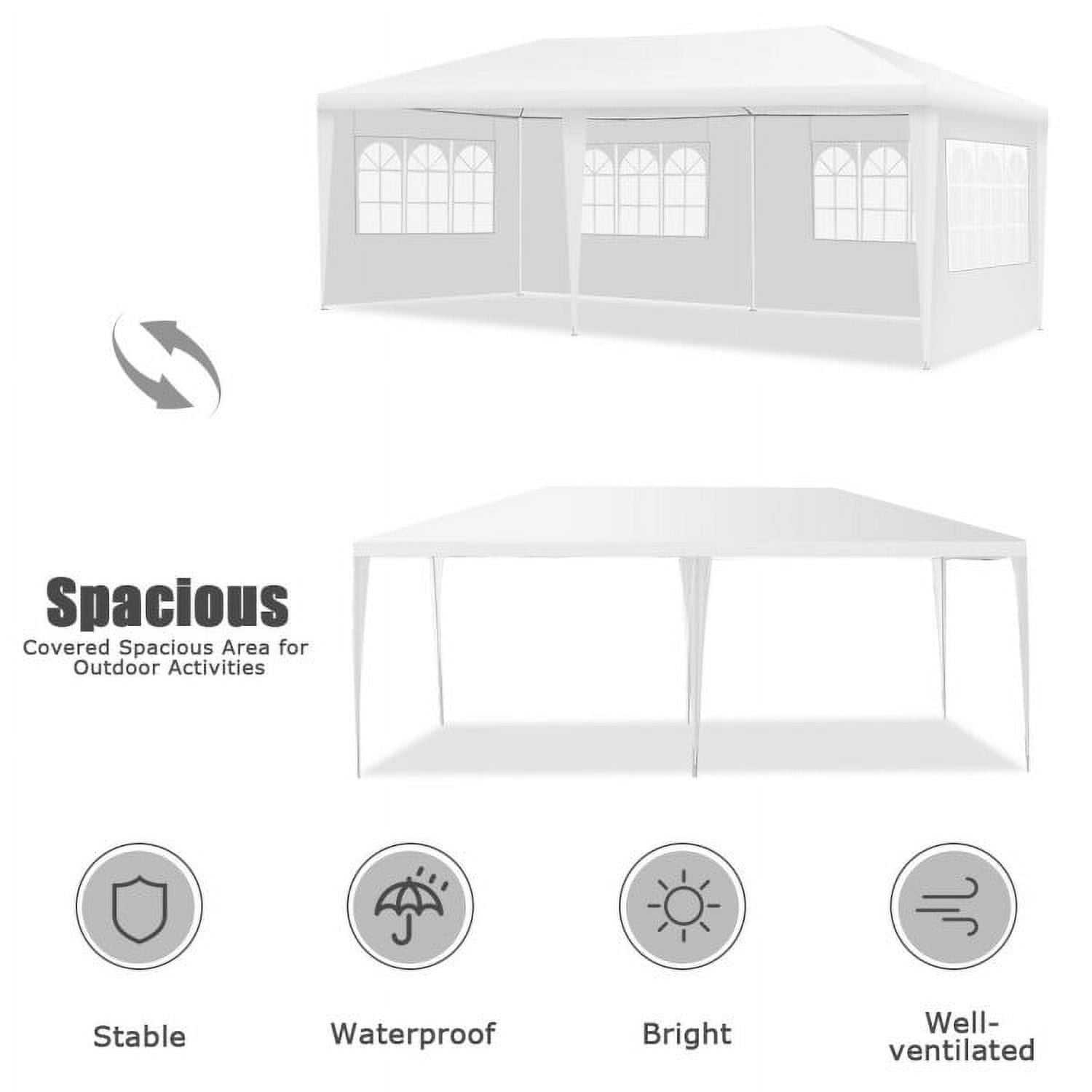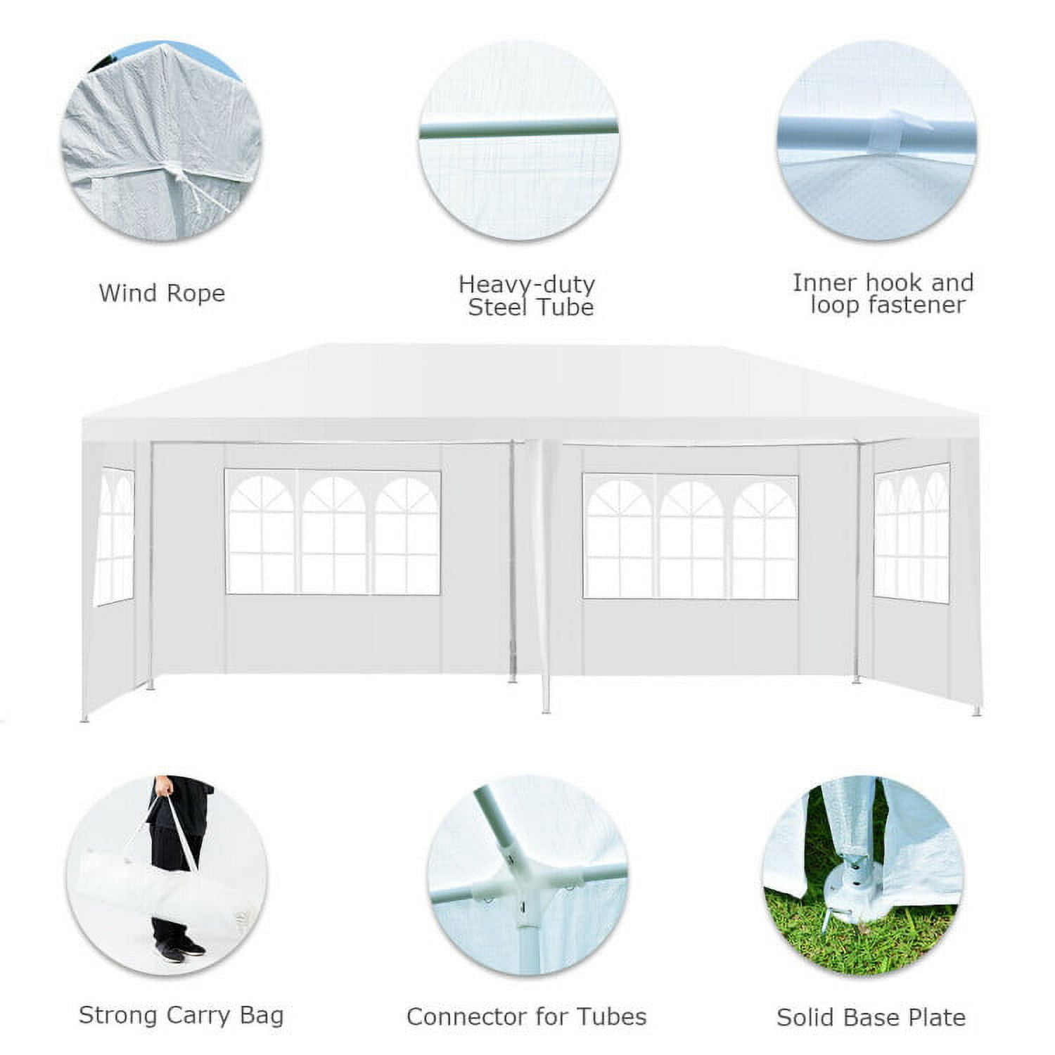 Weather-resistant Tent: The top of the gazebo is waterproof and sun-resistant which ensures you can use it on most days. You don’t have to worry about the strong sunlight influencing your outdoor activities with a reliable temporary shade. Thoughtful Design of Construction: This outdoor tent comes with a heavy-duty painted steel frame which is sturdy and not easy to rust. Each tent is equipped with 6 wind ropes and 12 tent pegs thus you can secure the tent firmly on the ground. Thick Polyethylene Fabric: This folding tent is covered with premium PE fabric which is thick and durable for long service life. What’s more, the PE material is easy to clean. Large Space and Multifunction: This 10′ x 20′ canopy tent is spacious enough to hold a group of people. The party tent is perfect for weddings, picnics, BBQ, or some commercial activities like flea markets or fruit markets. Easy to Install: This portable canopy can be easily assembled with detailed instructions and complete accessories. For your safety, do not use the tent outdoor during heavy rain, snow, or strong win.