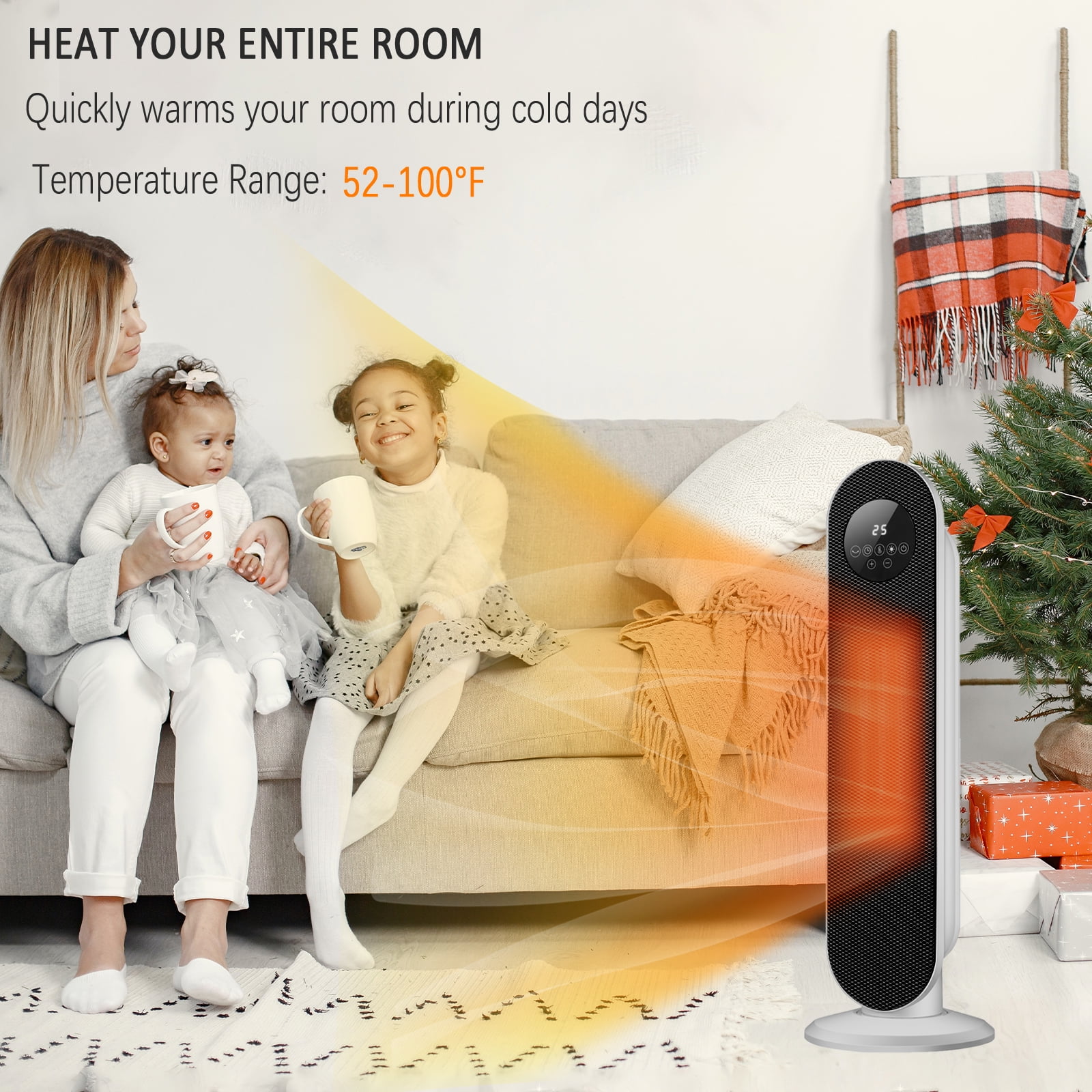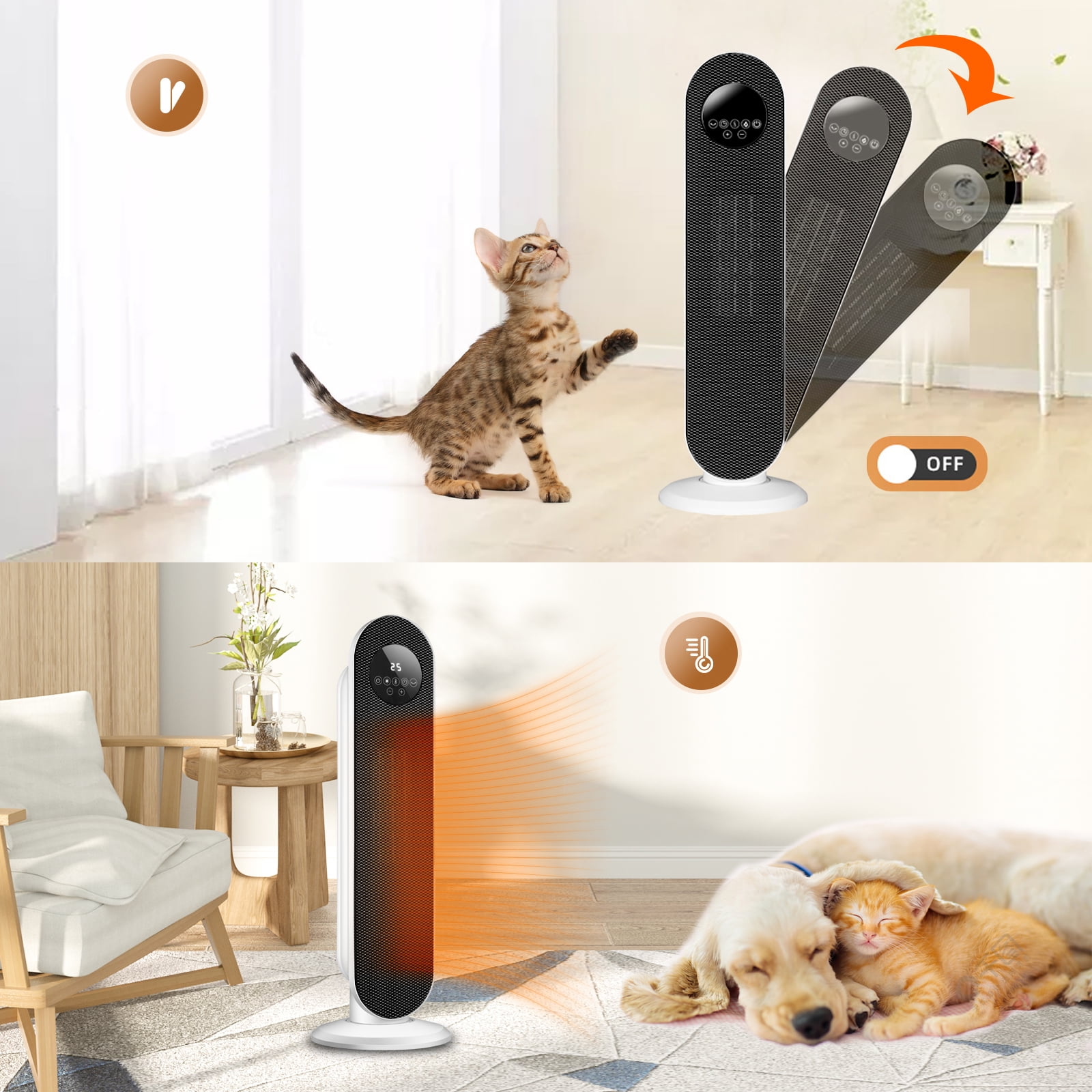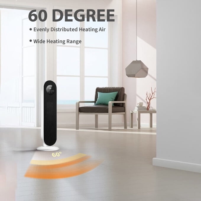 About this item Ceramic Technology: Ceramic heating element that provides faster and more efficient heating than traditional heaters. With PTC ceramic heating tech and high speed fan, heaters maximize heat out and are long lasting quiet operation. Handy and Mighty: Give your home’s heating system a boost with our handy heater. Unlike those small space heaters, it offers a wider heating range & dissipation grill and widespread 60° oscillation, dispersing the air evenly. The perfect space heater for office, bathroom, bedroom and so on. Adjust the Temperature to Your Needs : Equipped with an adjustable thermostat, our space heater will keep you comfortable at all times. Just set the dial to the desired heat setting and let the thermostat monitor the surrounding air temperature and keep you warm. Low Noise : The noise this heater makes is lower than 40 dB, quiet enough for most people to use in a bedroom while sleeping. Provide a quiet environment for you in cold days. Overheated Protection:Our portable heater is equipped with an automatic overheat protection device located inside the body of the heater. If personal space heater gets too hot for any reason, the automatic overheat protect device will turn the heater off. Specifications: Special Feature: Overheat Protection, 60° oscillation Material: Plastic, Metal, PTC Color: White Power Source: Corded Electric Heating Method: Convection Heat Output :1500 Watts Dimensions: 25.2 x 8.3 x 8.3 inches Item Weight: 5 pounds 3 Heat Settings: High(1500W), Low(1000W), Fan-Only(8W)
