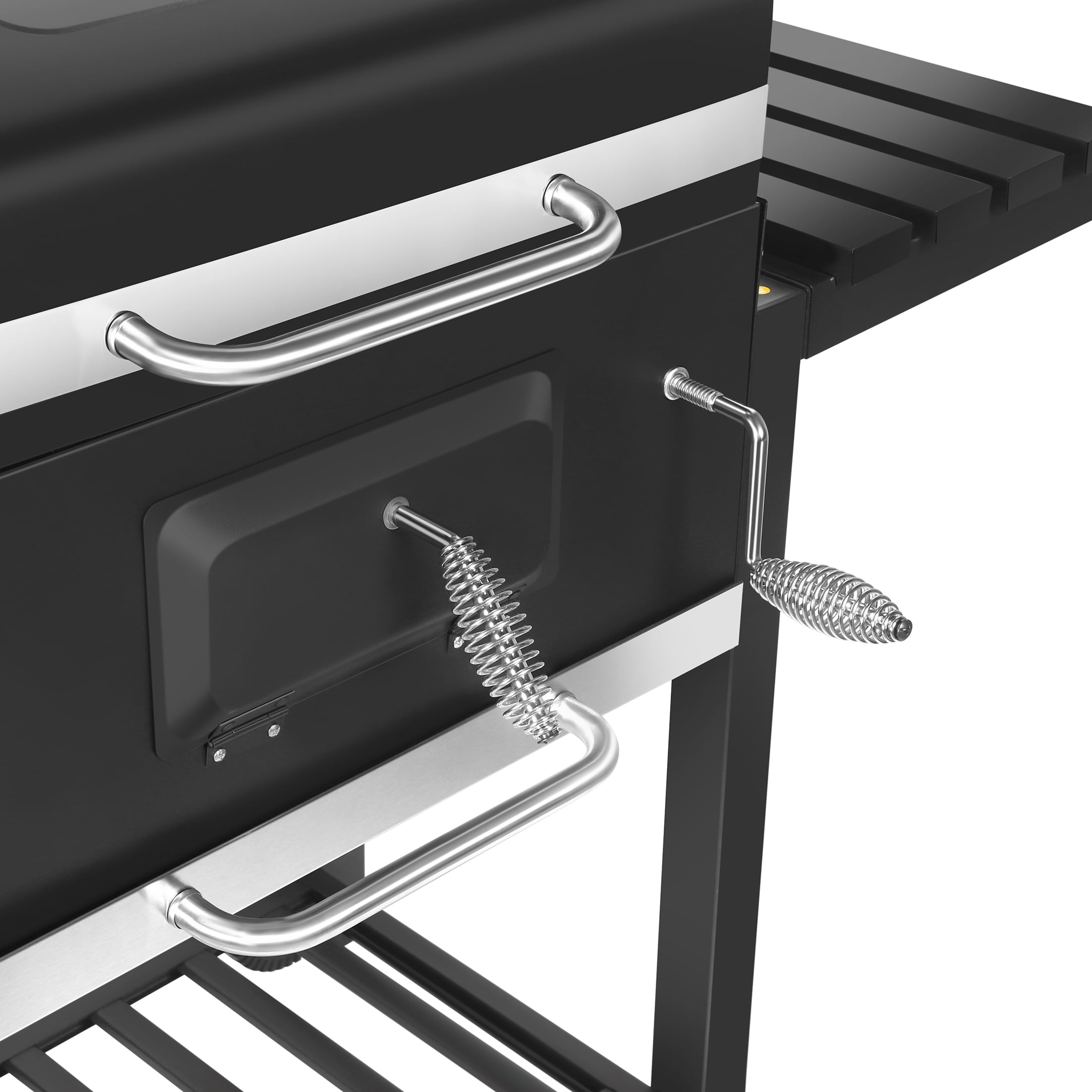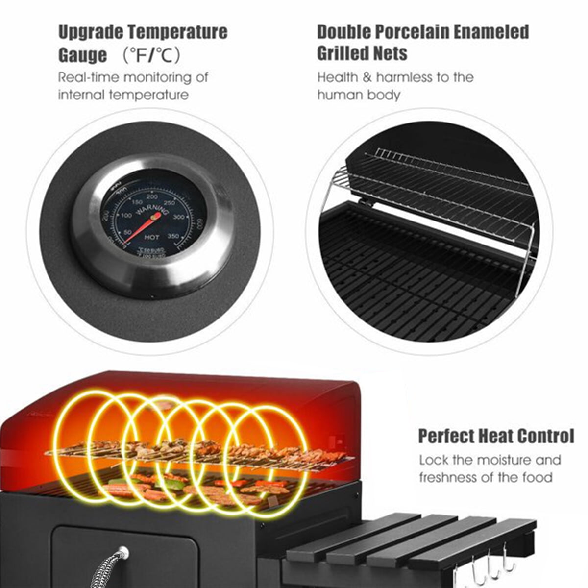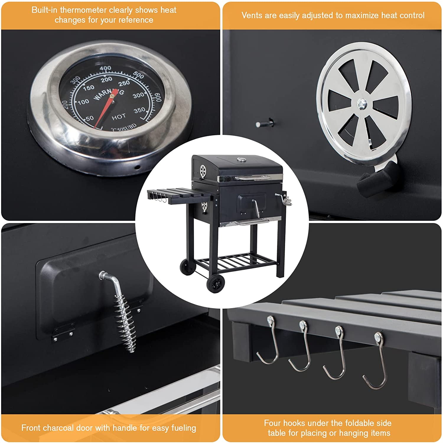 About this item The charcoal grill is perfect for dinner party and camping. The rugged and compact design provides an enough space for your barbecue. With a track record of long-lasting, this product will help you achieve perfectly grilled, flavorful food. The grill includes a large stationary side shelf for preparation, a removable oil-brushed charcoal grid and attached ash tray for easy clean up, and wheels for mobility. Sit down, and have a pleasant meal outside. You will enjoy your happy time. Worth having! Feature Allows for different heat settings Can cook three different ways:grilling, barbecuing, slow smoking Using charcoal and wood Heavy-duty porcelain enameled cooking grates High-temp powder coated lid and grate Foldable side shelf with 4 tool hooks Charcoal tray can be raised or lowered to desired height 2 wheels for easy rolling, bottom shelf for storage Folding shelves allow footprint to shrink for compact storage Easy to clean and easy to assemble Power Source Charcoal Color: Black Item Weight: 65.04 Pounds Item Dimensions LxWxH 55 x 21 x 43 inches Fuel Type: Charcoal ★Large Cooking Area: 558 square inches of total cooking area, including 375 square inches primary cooking area and 183 square inches Warming Rack Area. It could grill food for more than 5-20 people at one time. ★Convenient Fuel Window: With the front fuel window, coals can be quickly and conveniently added to the charcoal board. ★Liftable Charcoal Board: Friendly to adjust the firepower for different foods. And fine-tuning could ensure the best temperature of food. ★Four Vents: The four vents design makes air circulation more effective and ensures full combustion. ★Easy to Clean Up: The ashtray collects all ash and easy to pull out and