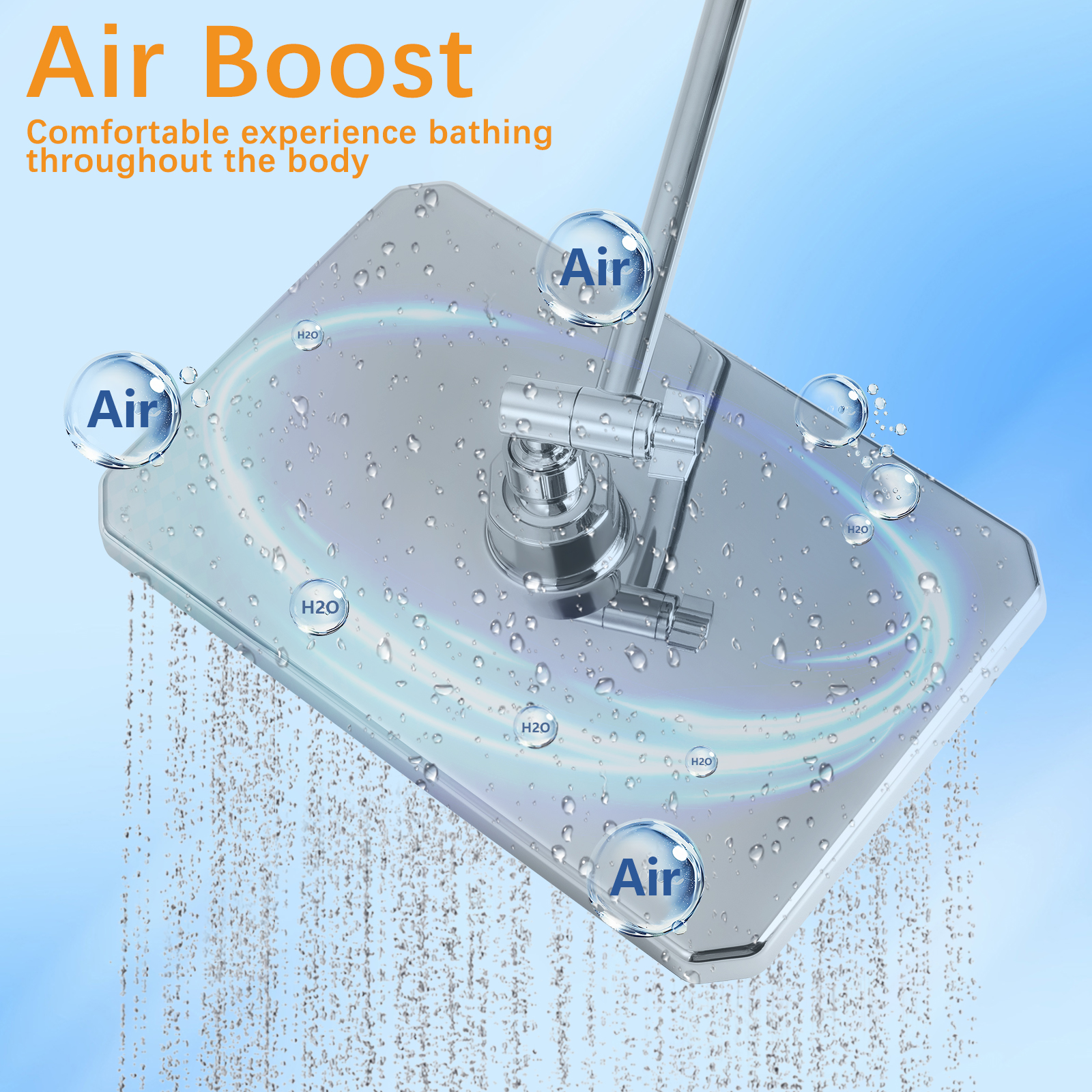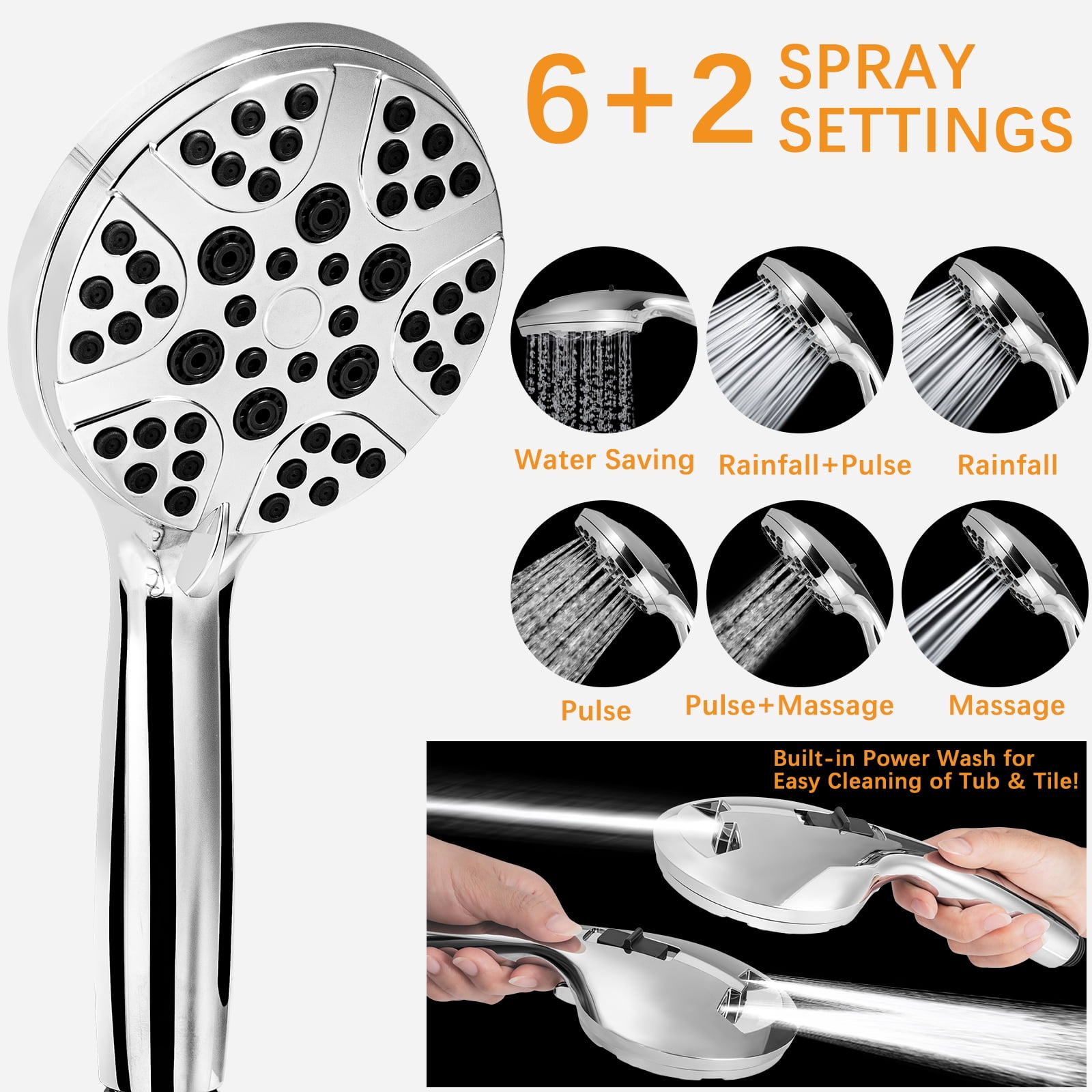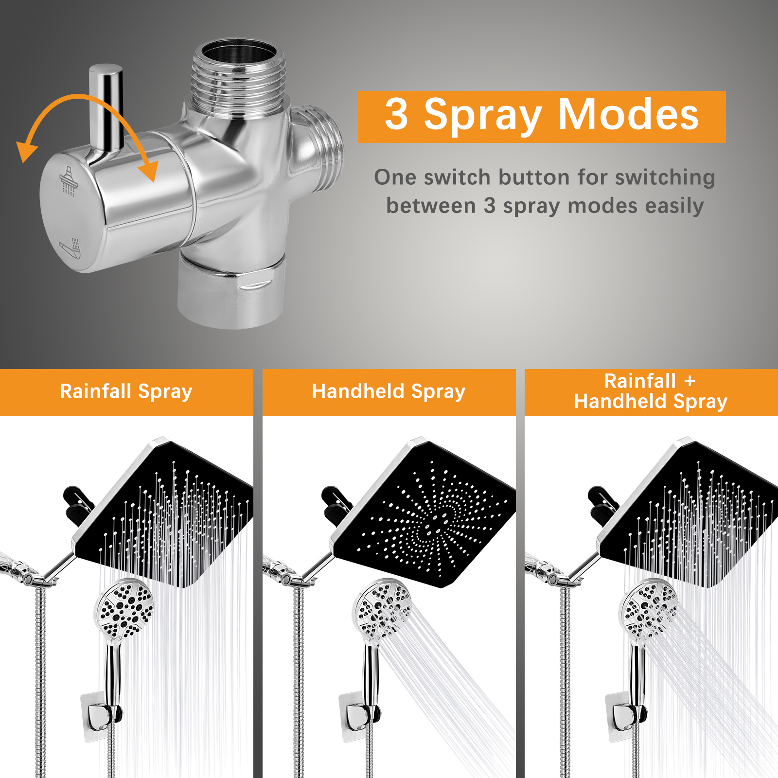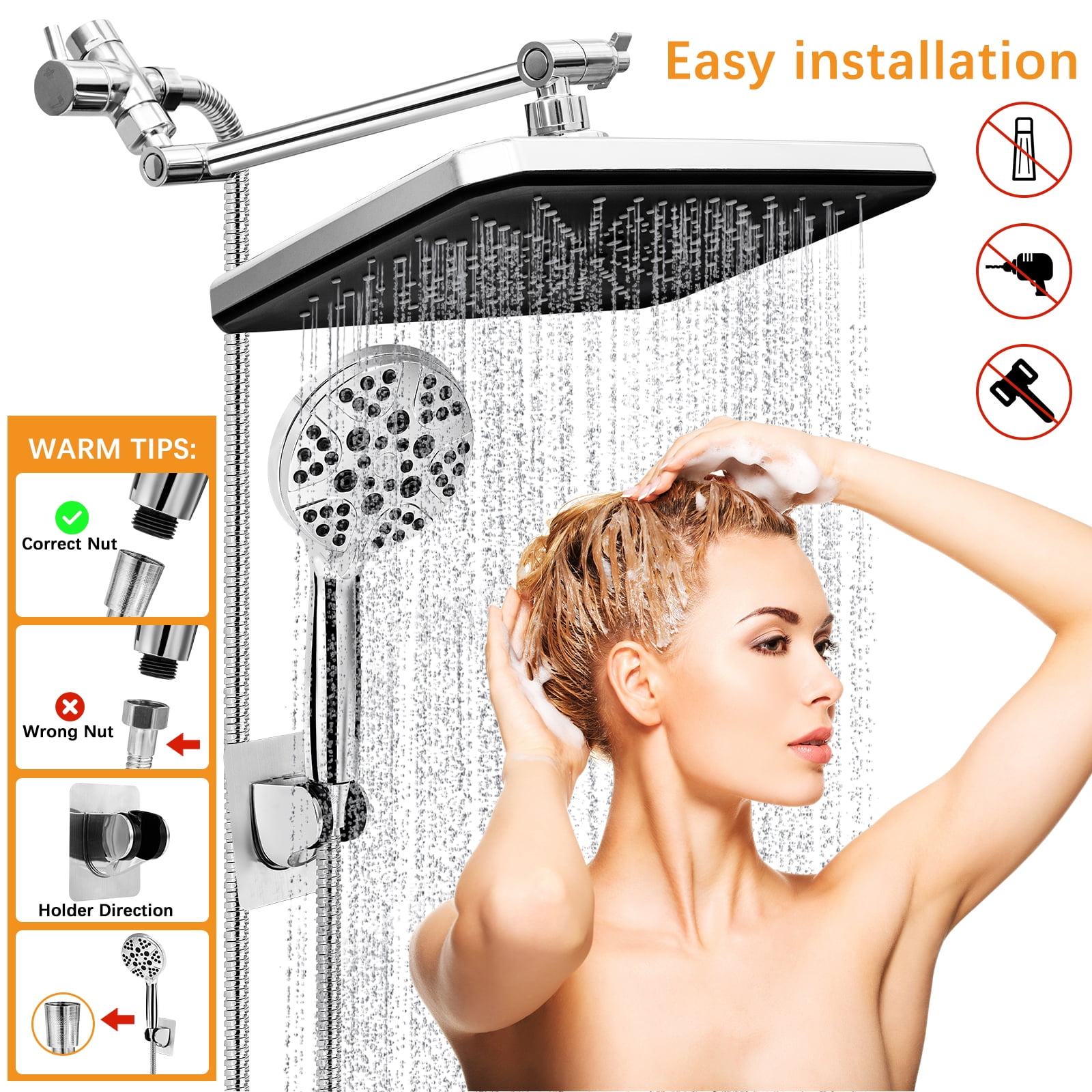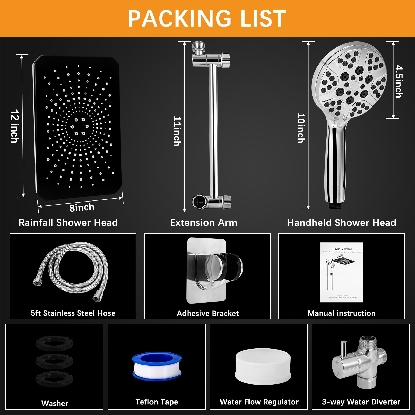 【Experience with All Your Senses】Experience the ultimate in shower luxury with our high-performance 12″ stainless steel rainfall showerhead combo. Immerse yourself in a powerful downpour that will invigorate your senses and transform your shower into a spa-like retreat, just like the scenes in your favorite movies. The whole rain stream will fully encompass your body and can accommodate two adults. 【3 Modes for Shower Head Combo】Introducing our versatile showerhead with three distinct spray modes: rainfall spray, handheld spray, and rainfall + handheld spray. Immerse yourself in the soothing sensation of a gentle rainfall with 12’’ large square rain shower head, effortlessly switch to the convenience of a handheld spray, or indulge in the combined experience of both. We are the FIRST & ONLY product that has waterfall mode in handheld shower head. 【8 Modes for Handheld Spray】There are various spray modes that create varying water pressure for the ultimate pleasurable experience. It can not only provide you with a luxurious shower experience but is also suitable for baby showers, pet showers, and cleaning the bathroom. Include shower hose, shower head holder and other accessories to meets your daily needs. 【11’’ Flexible Extension Arm】Experience the convenience of our showerhead’s dual knobs, allowing you to adjust and achieve the perfect angle and height that suit your preferences. Crafted from solid and durable brass, you can trust its strength and reliability, ensuring no concerns of breakage or leaks. The generous 15-inch vertical movement range makes tightening never so easy.