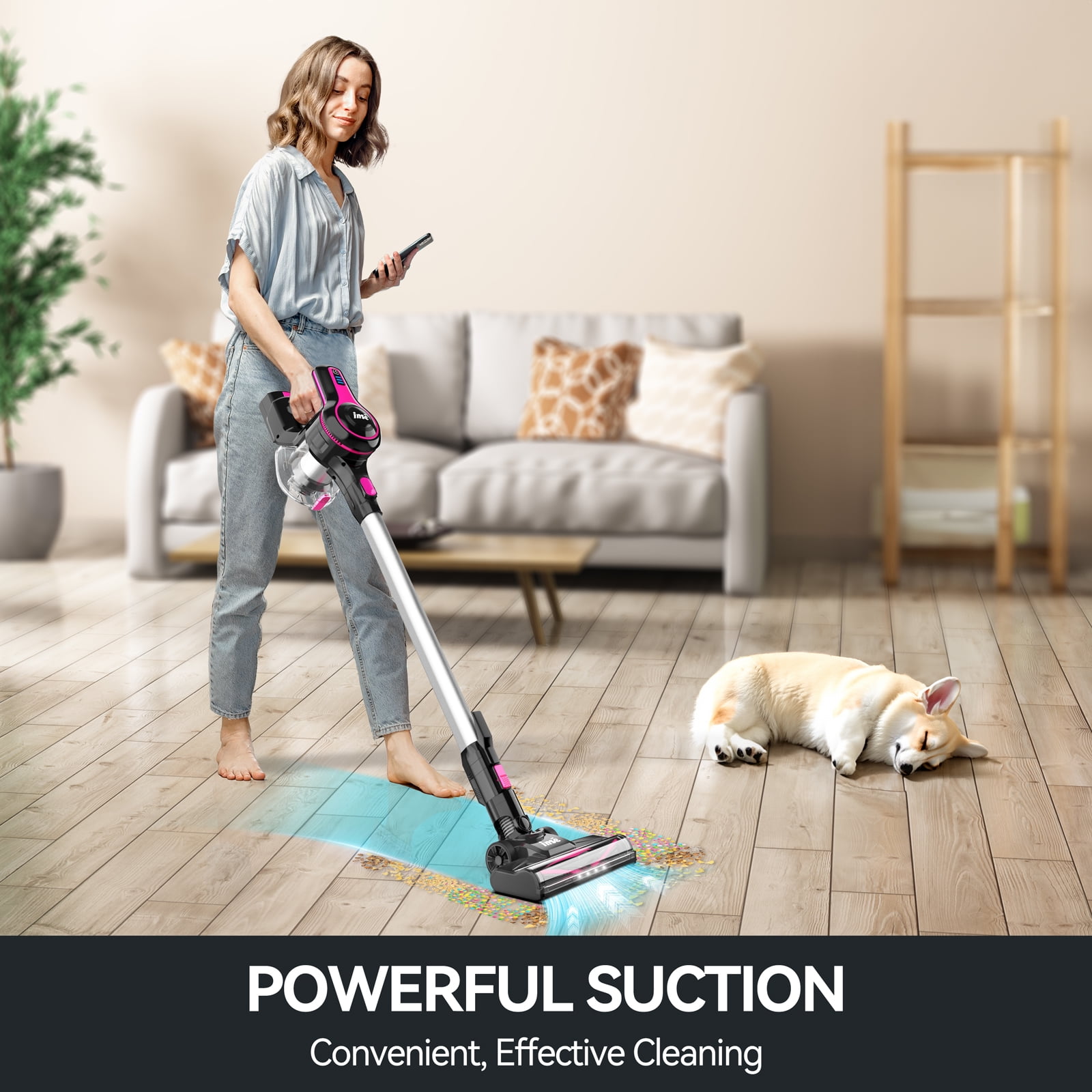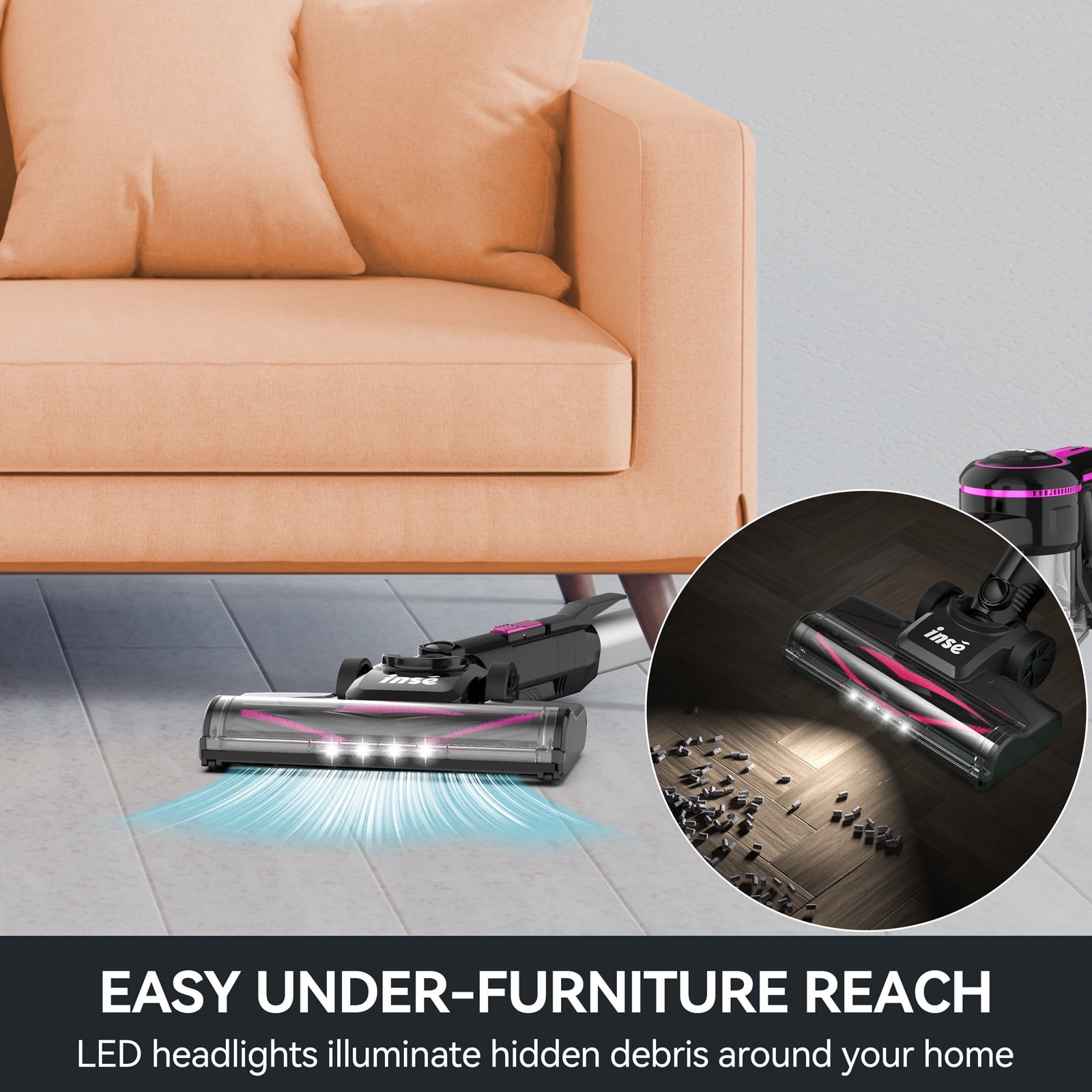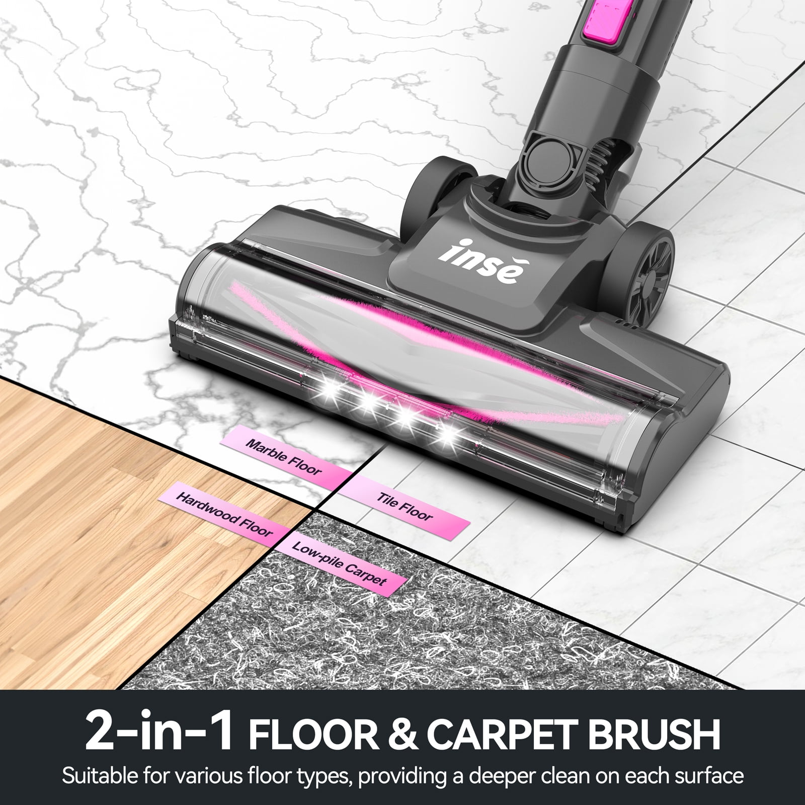 【25kPa Strong Suction】 INSE N520/N500 Cordless Vacuum Cleaner provides 25kPa strong suction on max mode, enabling cleaning of multiple types of hard floor and low pile carpets. Our cordless vacuum also generates less heat and less noise (65db) to offer a quiet cleaning environment. Clean quietly with less disturbance to family and pets. 【Up to 45 Mins Runtime Battery】 The stick vacuum cleaner builts in a 6-cell 2200 mAh large capacity battery provides 30-45 mins running time on standard mode, 12-20 mins on max mode. The detachable and rechargeable battery pack can be charged in or out of the vacuum cleaner. With a quick 5 hour charging time, Enjoy the freedom to clean at your own pace. 【2 Adjustable Speeds】 With 2 adjustable speeds, the pet vacuum cleaner effortlessly captures pet hair, cat litter, pet food, and other messes on the hardwood floor, low-pile carpet, stairs, bed, curtain, furniture, car, RV. 【High Efficiency Filtration System】 With 5 stages fully sealed cyclone filtration system, the vacuum cleaner cordless captures 99.99% of fine particles as small as 0.1um and offers powerful centrifugal force to efficiently separate dirt. This rechargeable vacuum cordless provides the ultimate purified air and an excellent cleaning experience for every user. We recommend cleaning the HEPA filter every 2-3 weeks and replacing them every 3 months for optimal performance (2 HEPA filter included). 【6 in 1 Multifunction Vacuum】 The hardwood floor vacuum cleaners for home hard floor carpet pet hair come with a range of accessories including the motorized brush head with LED light, 2 in 1 bush, long crevice, which can be assembled into 6 combinations. If you need to pick up debris on the desk or in the gap, the 2 in 1 bush or long crevice can be switched into a handheld vacuum to clean dust easily. 【LED Detects Hidden Debris】 The cordless stick vacuum is equipped with 2 in 1 Turbine Motorized Brush. No need to change the floor head to clean the hard floor and low pile carpet. Maneuverable 150° swivels sideways and 90°up and down enables you to easily clean the blind corners under furniture. The floor brush also has 4 LED lights, which can instantly illuminates hard-to-see corners and spaces, like under beds and furniture, making it easier to clean. 【V-Shaped Anti-tangle Roller Brush】 Equipped with the V-shaped design roller brush, it can reduce the hair tangles, and the dirt on both sides is concentrated to the middle when the vacuum cleaner is working. It is more effective for dust collection and cleaning. 【Lightweight and Compact】 The main motor of hardwood floor vacuum only weighs 3.2lb, extremely suitable for one-hand cleaning. Wall mount or upright storage ways, effectively save space and more convenient for your life. 【1.2L large dustbin】 1.2L large dustbin and unique continuous mode of this lightweight vacuum cleaner is designed for cleaning large space, you do not need to pull the trigger all the time while vacuuming and one press button designed to empty the dustbin after cleaning, no need to touch the dirt. 【After Sales Service】 No worry about after-sales, we offer a 12-Month customer service. Any concerns, we are always here.
