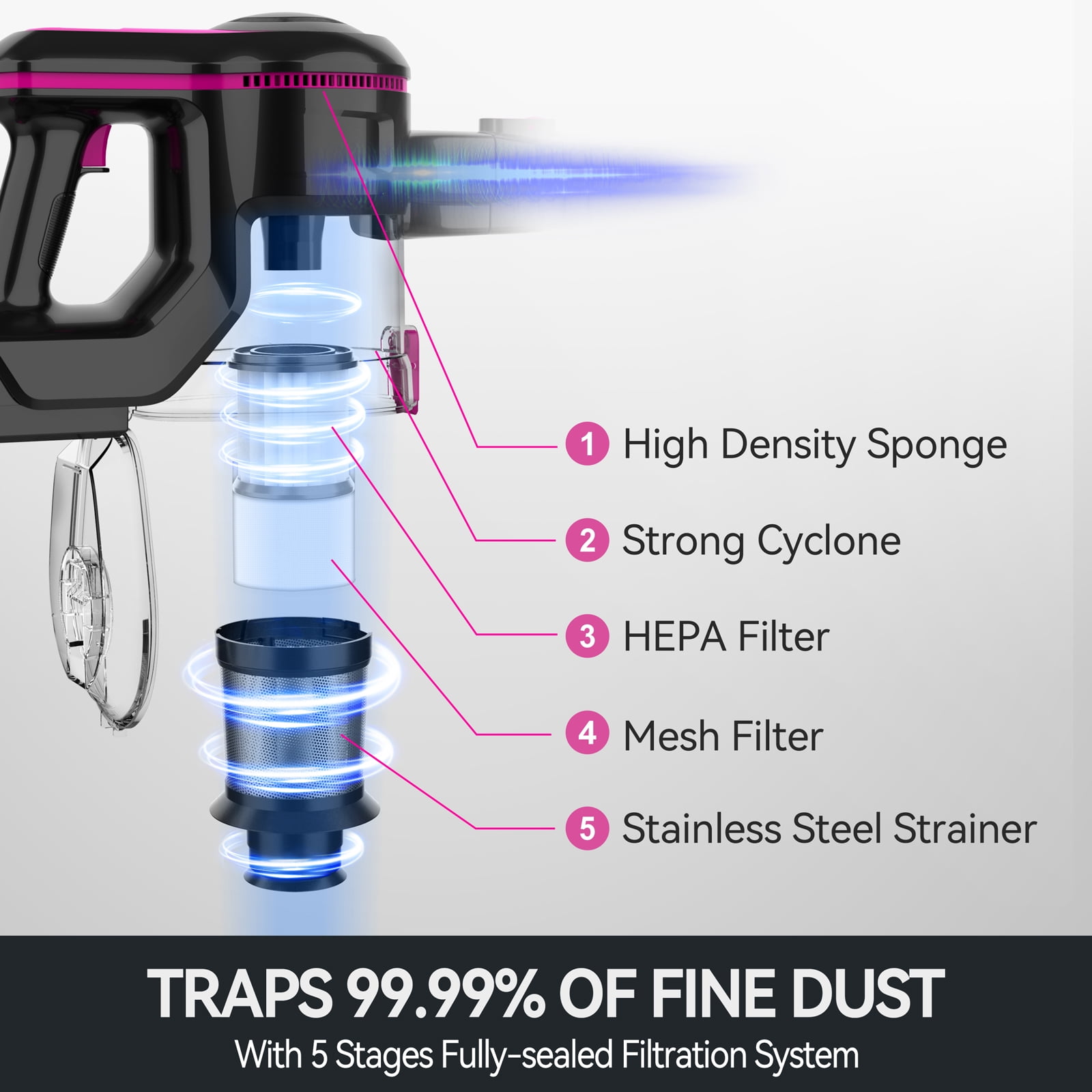 25kPa Strong Suction Up to 45 Mins Ultra Long-lasting Runtime 2 Adjustable Power Mode 2200mAh 6-cell Large Capacity Battery High-efficient 5-Stage Filtration System Maneuverable 150°swivels sideways and 90°up and down LED Brush Head LED headlights of the brush head illuminate dark places 5 Hours Fast Charge Time 1.2L Large Dust Cup 1 Button Quick Empty 6-in-1 combinations meet your different daily cleaning needs 6-in-1 Stick & Handheld Vacuum Perfect for both wood floors, hard floors, or low-pile carpets The V-shaped Roller Brush More Effective for Dust Collection and Cleaning 3.2lbs Lightweight Main Body Lightweight and portable main body can convent to be a handheld vacuum easily 65db Ultra-Quiet Mode What You Get: 1 x Main Motor (motor & dust cup) 1 x Motorized Brush Head 1 x Roller Brush 1 x Metal Tube 1 x Battery 1 x 2-in-1 Brush 1 x Long Crevice 1 x Wall Mount 1 x 2-in-1 Cleaning Tool 1 x Power Adapter 2 x HEPA Filter 1 x User Manual 1 x Quick Start Guide