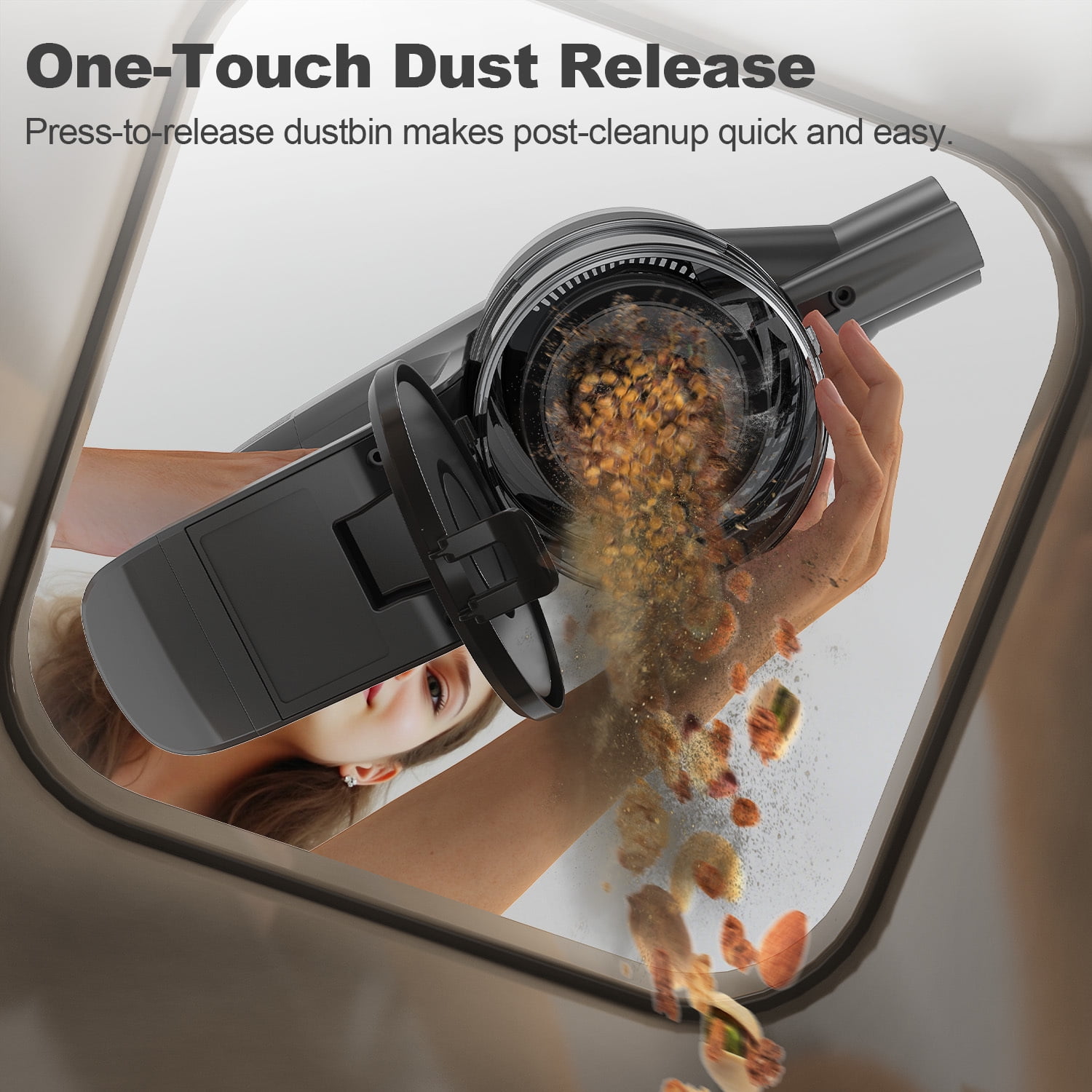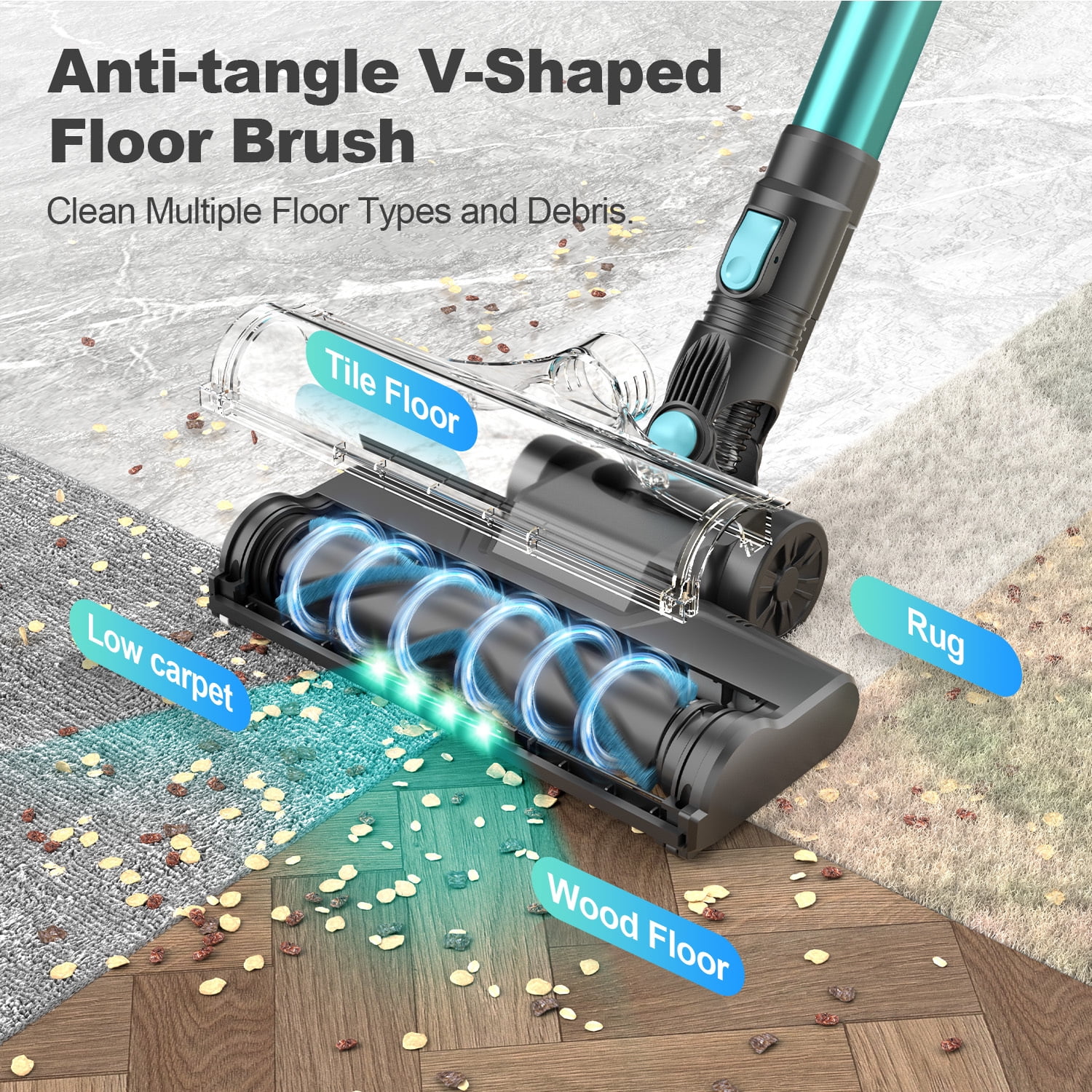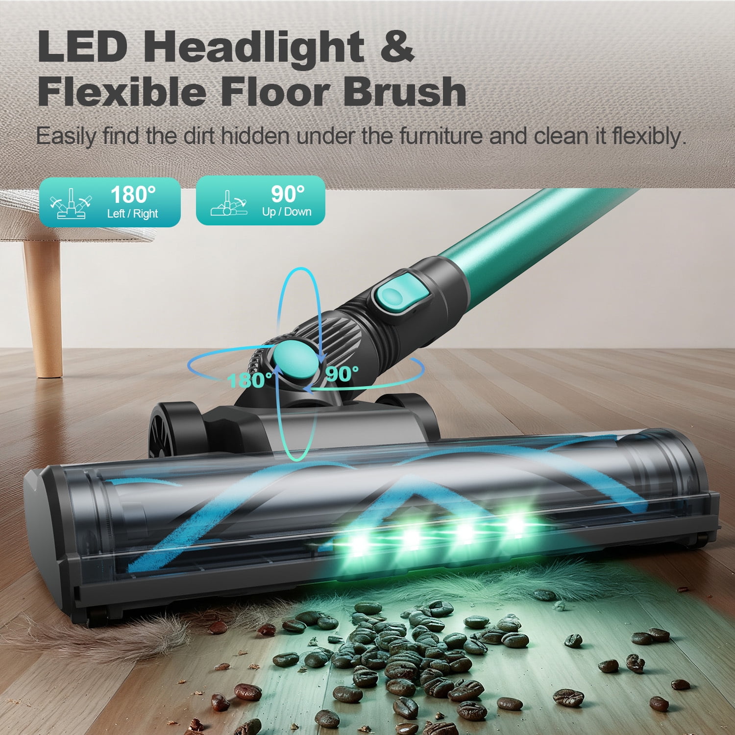 15kPa gentle for daily messes,25kPa tough for stubborn dirt Switch with a tap and conquer any cleanup 175W High-Performance Motor – Powerful yet energy-efficient A single charge can meet the daily cleaning needs 20 mins (Max mode) / 40 mins (Standard mode) V-shaped anti-tangle roller brush effectively solves the problem of long hair and pet hair entanglement 31.5-41.4 inches adjustable metal telescopic tube provides a comfortable grip for users of all heights, reducing back strain 4 LED lights on floor brush illuminates hidden dust and debris under furniture Self-standing allows you to free your hands and attend to other tasks anytime and anywhere without being hindered by cleaning duties Advanced HEPA Filtration System traps particles as small as 0.1um with 99.99% efficiency 90°+180° horizontal free rotation leave no corner untouched in cleaning Easily empty the dust bin with just one touch,making maintenance a breeze Easily maneuver between floor types-directly engage your hard floors and dig deep into carpets Suitable for curtains, beds, sofa crevices, pet cushions, car seats, etc One-touch emptying design, no need to empty it frequently