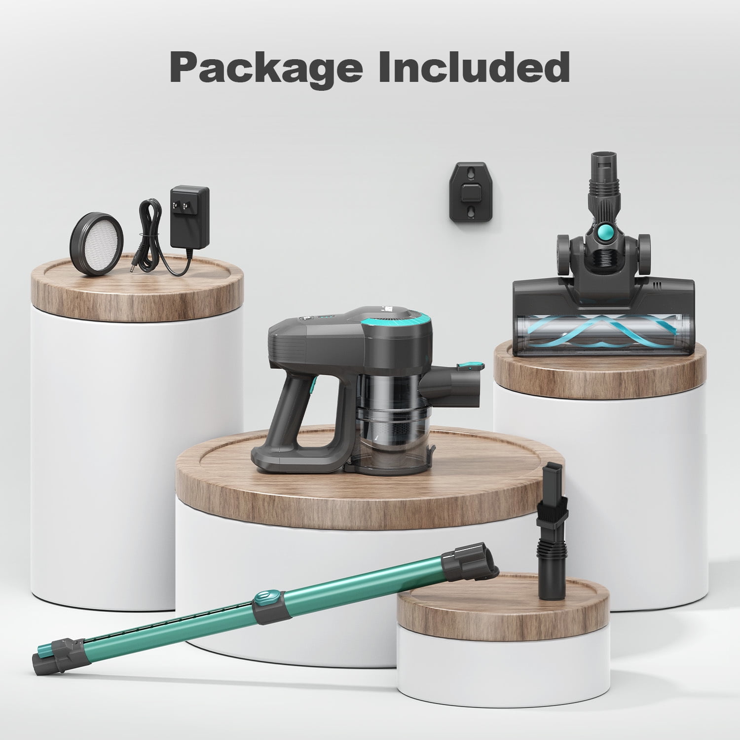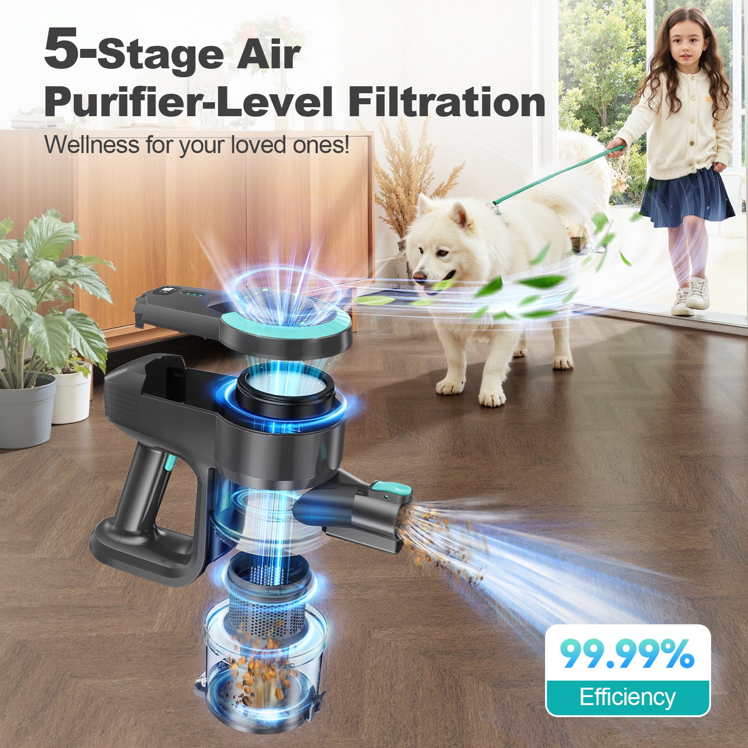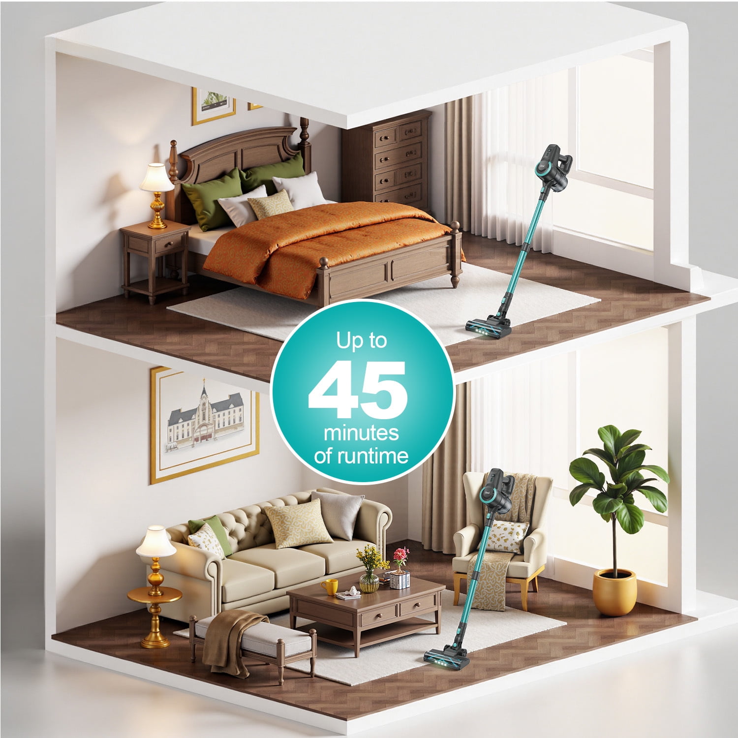 15kPa gentle for daily messes,25kPa tough for stubborn dirt Switch with a tap and conquer any cleanup 175W High-Performance Motor – Powerful yet energy-efficient A single charge can meet the daily cleaning needs 20 mins (Max mode) / 40 mins (Standard mode) V-shaped anti-tangle roller brush effectively solves the problem of long hair and pet hair entanglement 31.5-41.4 inches adjustable metal telescopic tube provides a comfortable grip for users of all heights, reducing back strain 4 LED lights on floor brush illuminates hidden dust and debris under furniture Self-standing allows you to free your hands and attend to other tasks anytime and anywhere without being hindered by cleaning duties Advanced HEPA Filtration System traps particles as small as 0.1um with 99.99% efficiency 90°+180° horizontal free rotation leave no corner untouched in cleaning Easily empty the dust bin with just one touch,making maintenance a breeze Easily maneuver between floor types-directly engage your hard floors and dig deep into carpets Suitable for curtains, beds, sofa crevices, pet cushions, car seats, etc One-touch emptying design, no need to empty it frequently