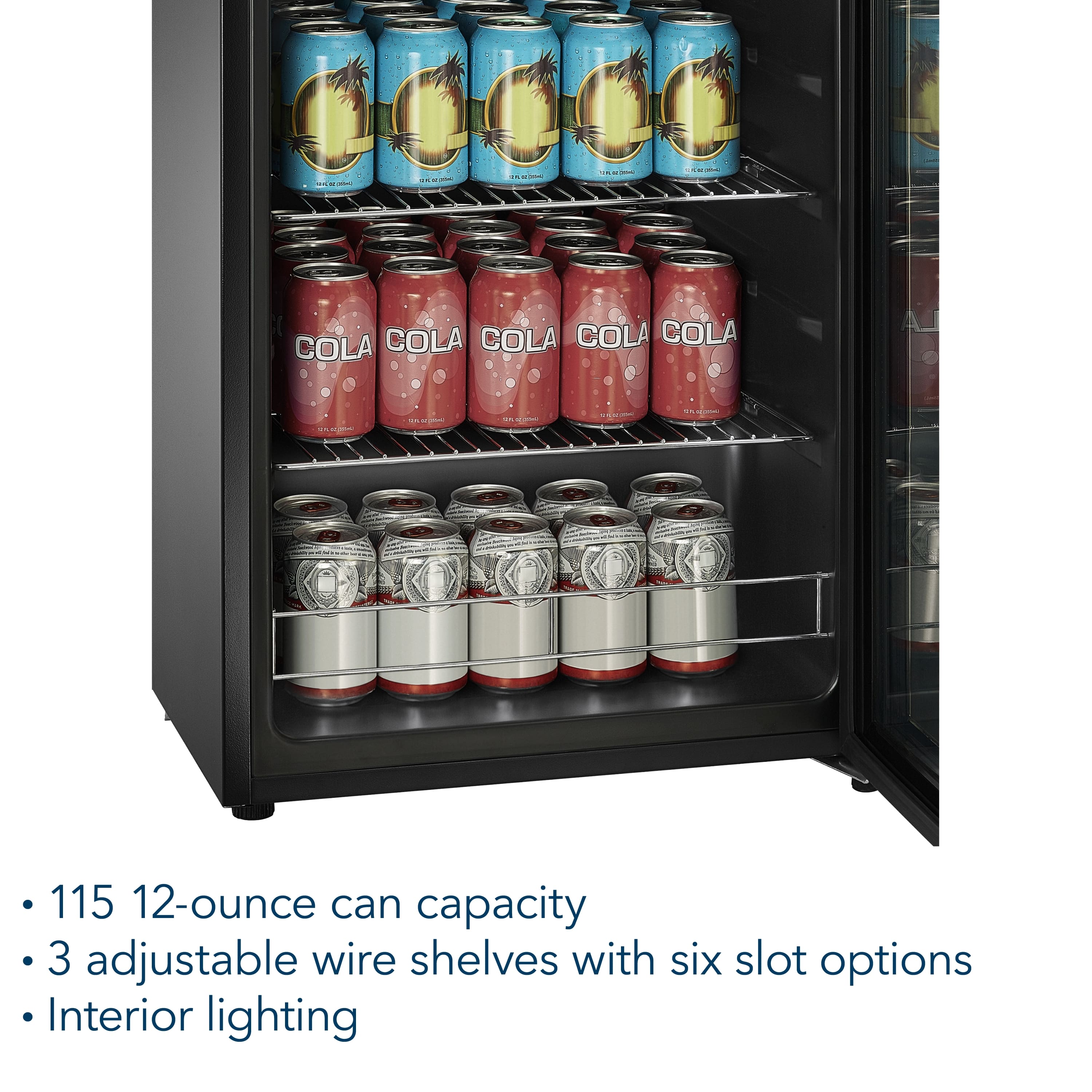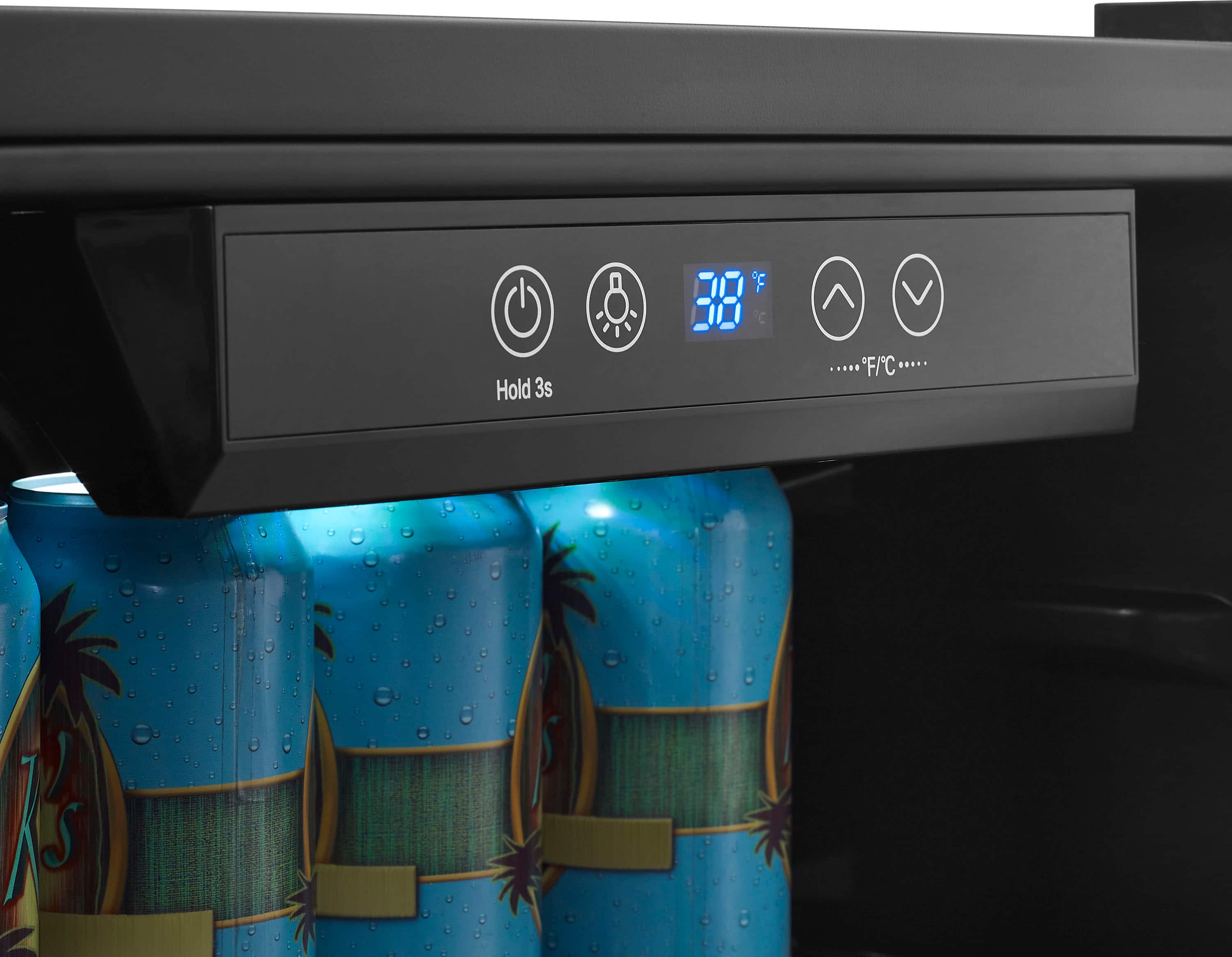 The Insignia 115 12-ounce can capacity beverage cooler has touch controls and a LED display to make it easy to select a temperature between 34° F and 50° F. It has 3 adjustable shelves that fit into 6 available slots, letting you organize this cooler to your exact preference. If there’s a power outage, an automatic memory function restores the same settings and automatic defrosting fan helps the cooler stay free of ice buildup.
