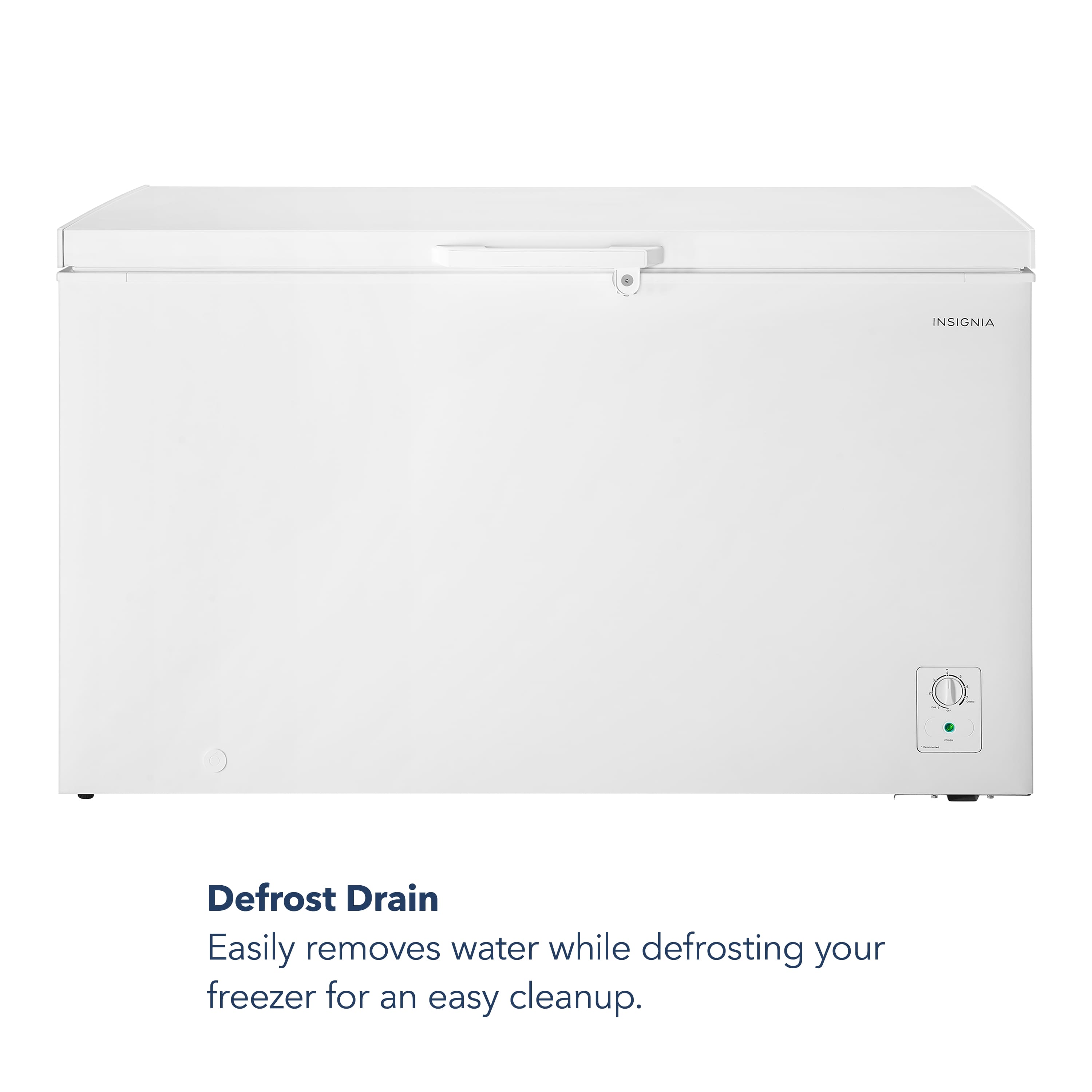 The Insignia 14.0 Cu. Ft. Garage-Ready Chest Freezer has three removable wire baskets allowing you to keep plenty of bulky foods at the bottom and smaller foods organized on top. An interior LED light makes it simple for you to find the items you’re looking for, and when you’re done, simply lock the freezer to keep both your children and your food safe. It’s easy to operate—just turn a knob to adjust the temperature. A defrost drain easily removes the water for when your freezer needs cleaning.