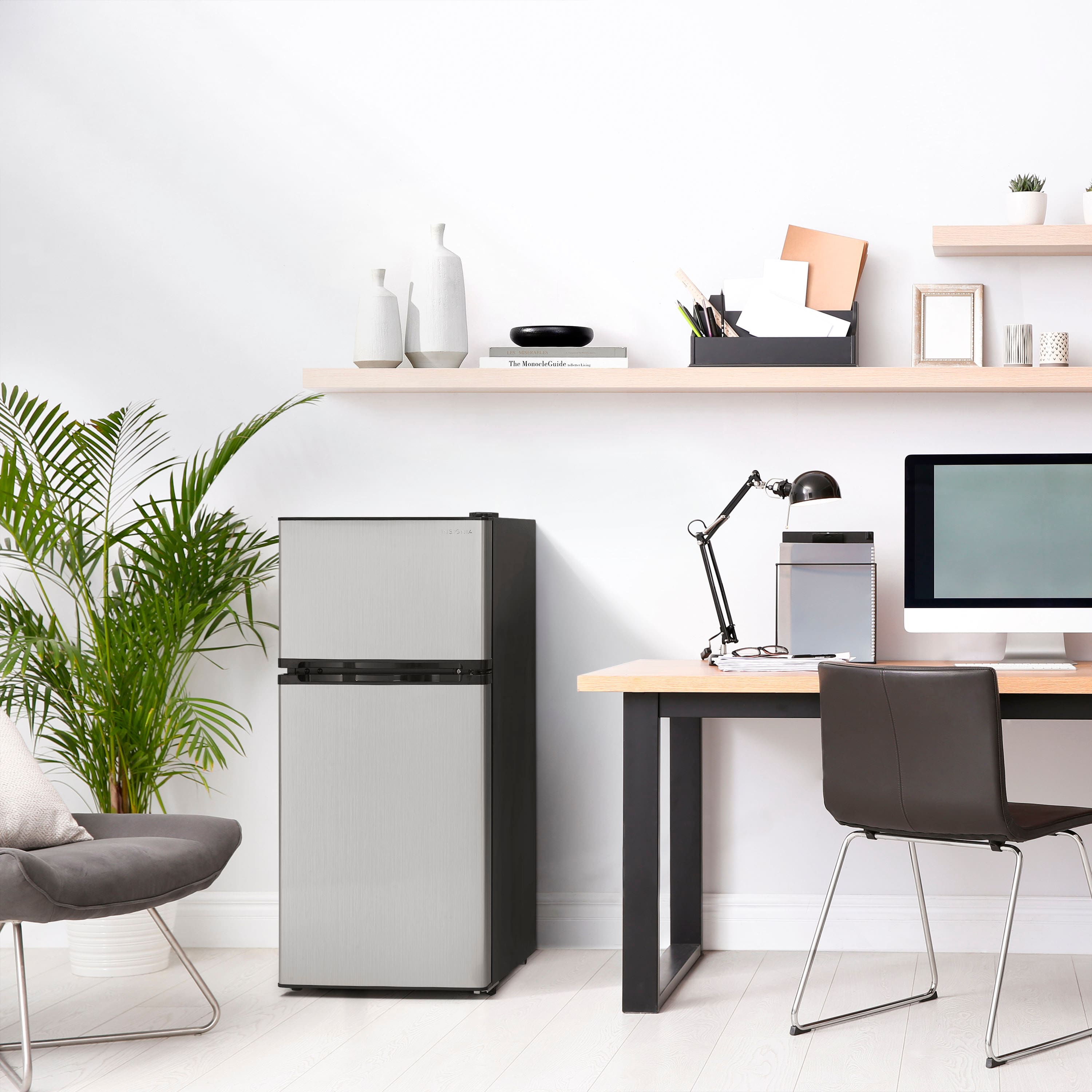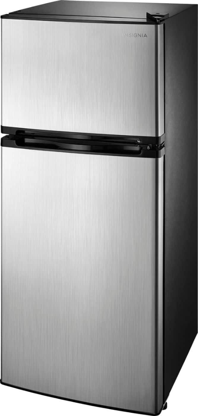 The Insignia 4.3 Cu. Ft. Mini Fridge with Top Freezer has two adjustable shelves in the fridge and one in the freezer, and its crisper drawer keeps produce fresh. TheTop Freezer has an interior light for spotting exactly what you need inside.