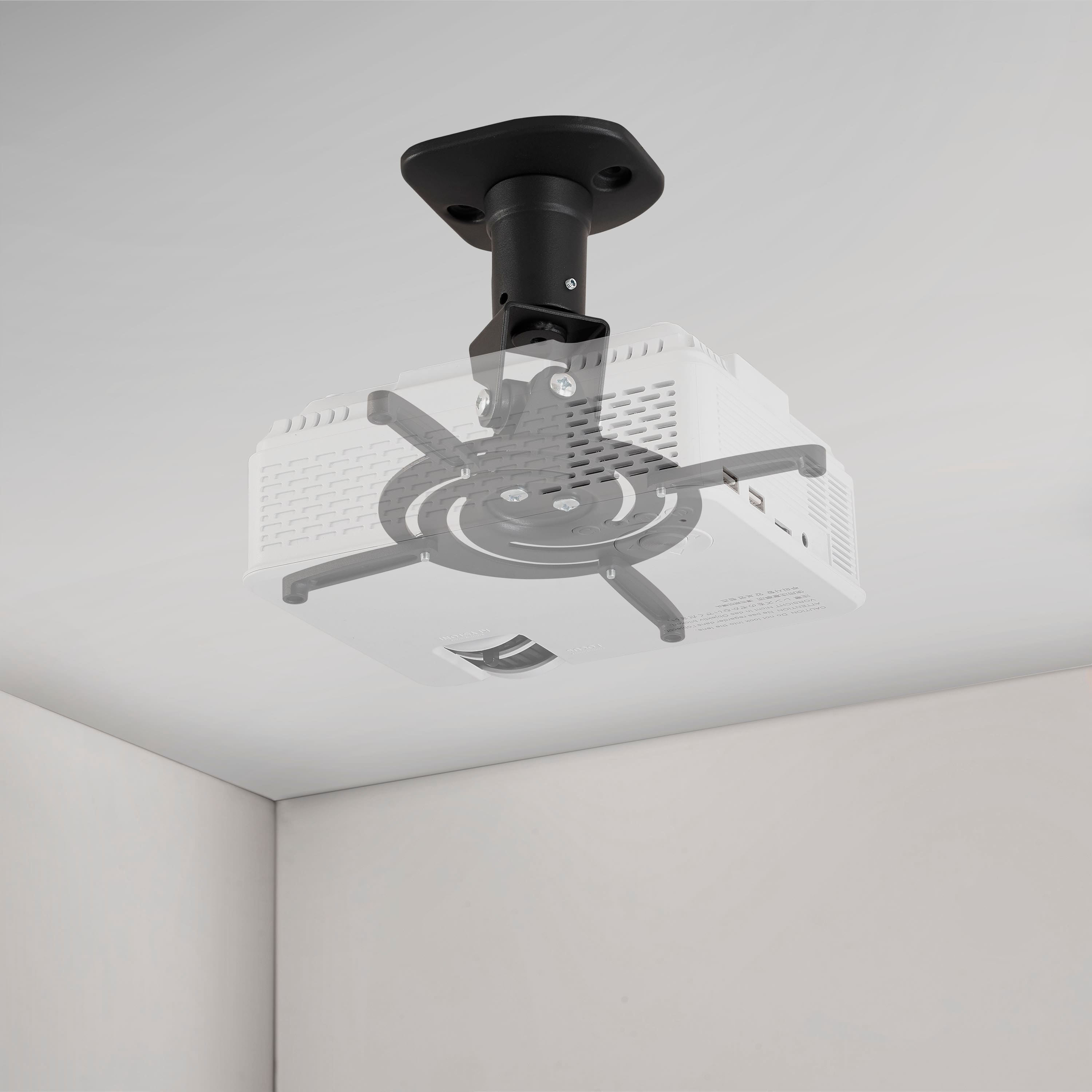 Bring the theater experience to the comfort of your own home. With the Insignia NS-PROJ2 Universal Projector Ceiling Mount, you can mount your projector to the ceiling and view any movie, sports event or presentation. Equipped with everything you need, this ceiling mount includes an assortment of hardware for an easy installation process. This UL-Listed mount supports projectors up to 30 lbs., making it perfect for home theaters and business offices alike. Your projector will be able to be tilted +/- 25° and mount rotated 360° once it is installed, helping you find the ideal viewing angle every time. Additionally, it can be mounted to wood studs or concrete, giving you a sturdy installation that you can trust. Now relax and enjoy those big-screen movies and presentations just like you would at the theater.