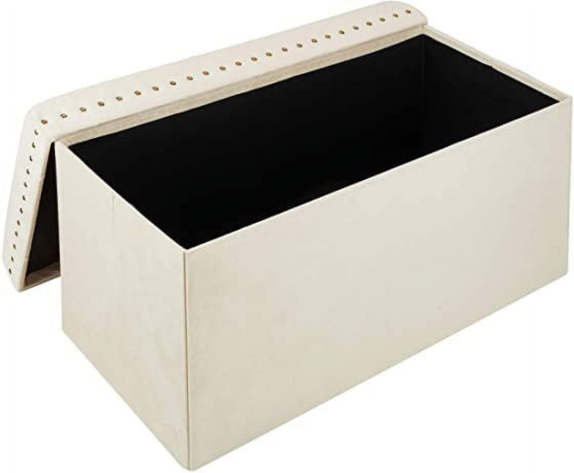 STORAGE AND SEATING – The Inspire Me! Home Décor Anastasia Bench features soft tufted velvet upholstery and is extremely versatile in its functionality. It provides comfortable seating for your family members and guests and allows items to be stored neatly inside simultaneously. AMPLE ROOM FOR HIDDEN STORAGE – Measuring 32 x 16 x 17 in, it provides a large space for hidden storage. Great for shoes, toys, remotes, wires, video games, and so much more. CLASSY AND FUNCTIONAL ACCENT PIECE – Featuring metal studs detailing in brushed brass, it instantly adds a luxurious touch to your home. Perfect for your living room or at the end of your bed. FOLDS FLAT WHEN NOT IN USE – Assembly is quick and easy. When not in use, this bench folds down into a smaller size so that you can always maximize your space according to your needs. Fantastic for your own space and also great as a housewarming gift because of its versatility and usefulness.