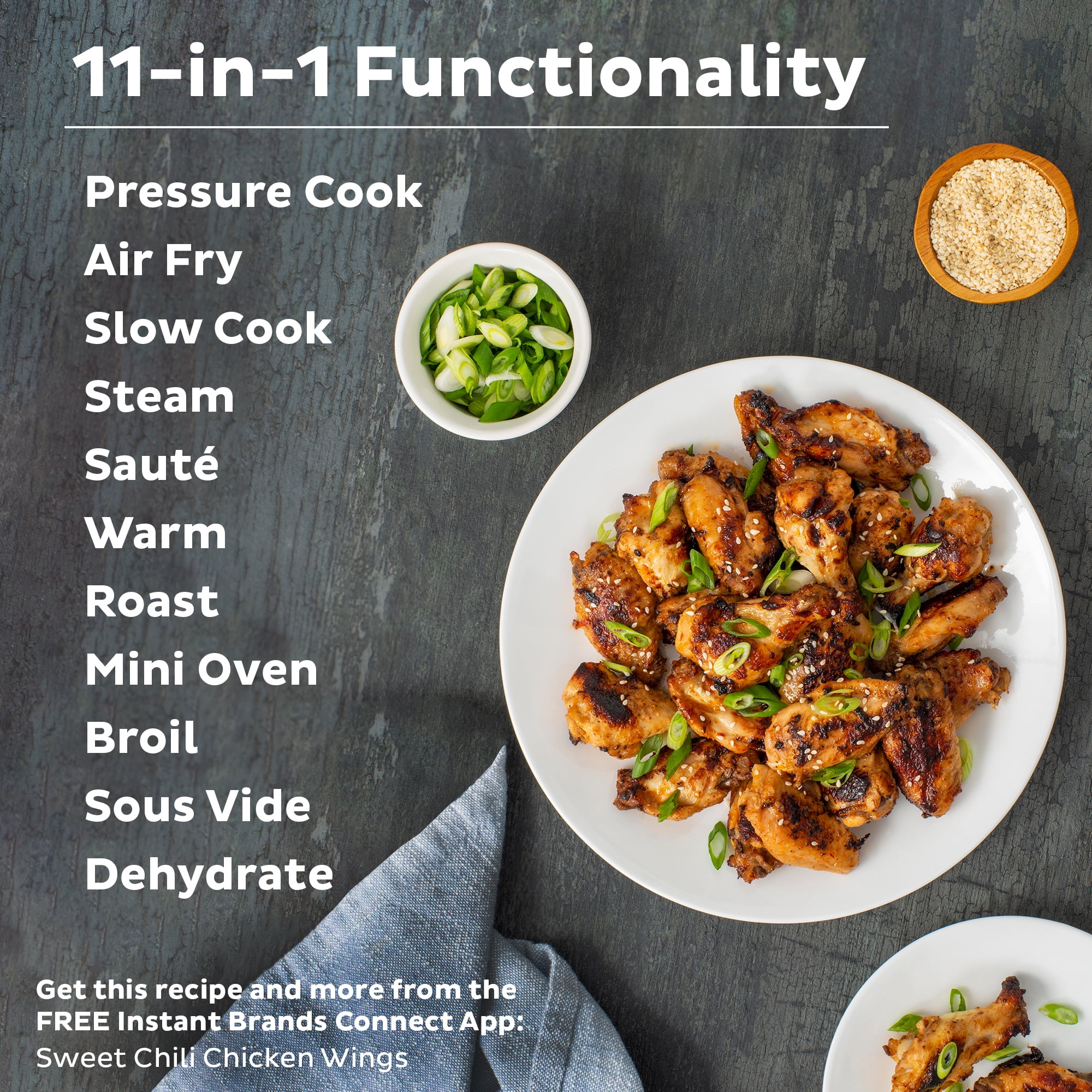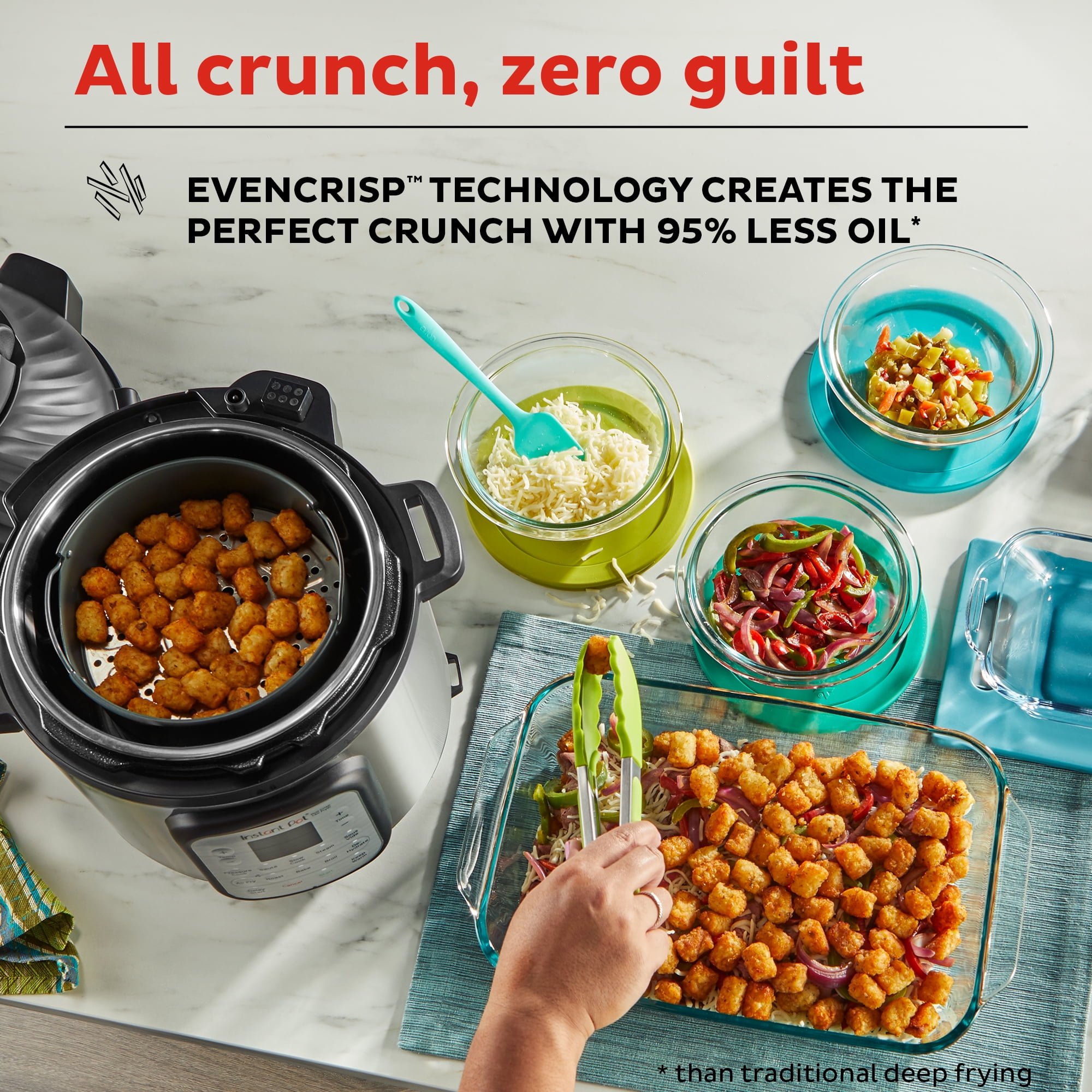 11-IN-1 FUNCTIONALITY: Air fry, roast, bake, dehydrate, pressure cook, slow cook, rice cooker, yogurt maker, steamer, sauté pan, yogurt maker, sterilizer and food warmer. THE INSTANT POT THAT AIR FRIES: From the makers of the best-selling Duo series comes a pressure cooker and air fryer combo, with 2 convenient removable lids. EVENCRISP TECHNOLOGY: The included air fryer lid delivers all the crunch and tenderness of deep-frying with 95% less oil. QUICK ONE-TOUCH COOKING: 11 customizable Smart Programs for air frying, pressure cooking ribs, soups, beans, rice, poultry, yogurt, desserts and more. Includes free app with over 1900 recipes! VERSATILE INNER COOKING POT: Food-grade stainless-steel cooking pot with a tri-ply bottom offers more even cooking and an anti-spin design that secures the pot for perfect sautéing. COOK FAST OR SLOW: Pressure cook delicious one-pot meals up to 70% faster than traditional cooking methods or slow cook your favorite traditional recipes – just like grandma used to make. QUICK AND EASY CLEAN UP: Finger-print resistant, stainless-steel sides and dishwasher-safe lid, inner pot, and accessories. PROVEN SAFETY FEATURES: Includes over 10 safety features, plus overheat protection and safe-locking lid. PERFECT FOR LARGER FAMILIES: Cook for up to 8 people – perfect for larger families, or meal prepping and batch cooking for singles and smaller families DISCOVER AMAZING RECIPES: Download our free Instant Pot app, so you can create quick new favorites and prepare delicious meals, available iOS and Android.