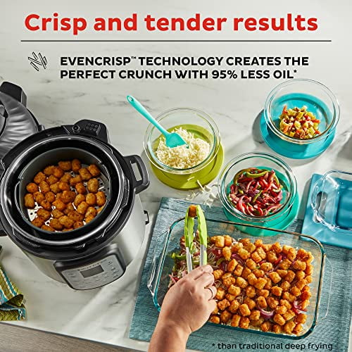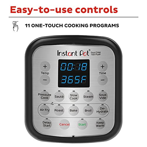 11-IN-1 APPLIANCES: pressure cooker, air fryer, slow cooker, steamer, sauté pan, food warmer, sous vide, roaster, mini oven, broiler, and dehydrator INSTANT CRISP TECHNOLOGY ensures crispy crunch and golden finish — with little to no oil — for delicious and healthy meals QUICK AND EASY CLEAN-UP with sleek surfaces that wipe clean and dishwasher-safe pot, drip pan, cooking tray and basket HUNDREDS OF RECIPES in the free Instant Pot app (iOS and Android) so you can discover new favorites and prepare delicious meals right from the start 10+ PROVEN SAFETY FEATURES including Overheat Protection, Safety Lock and more to ensure safe pressure cooking and air frying MOST POPULAR SIZE: 6-quart large capacity cooks for up to 6 people – perfect for families, and also great for meal prepping and batch cooking for singles and smaller households DETACHABLE AIR FRY LID lets you quickly fry, roast, bake, broil, and dehydrate EASY TO USE with Smart Programs to put cooking on autopilot – with delicious results