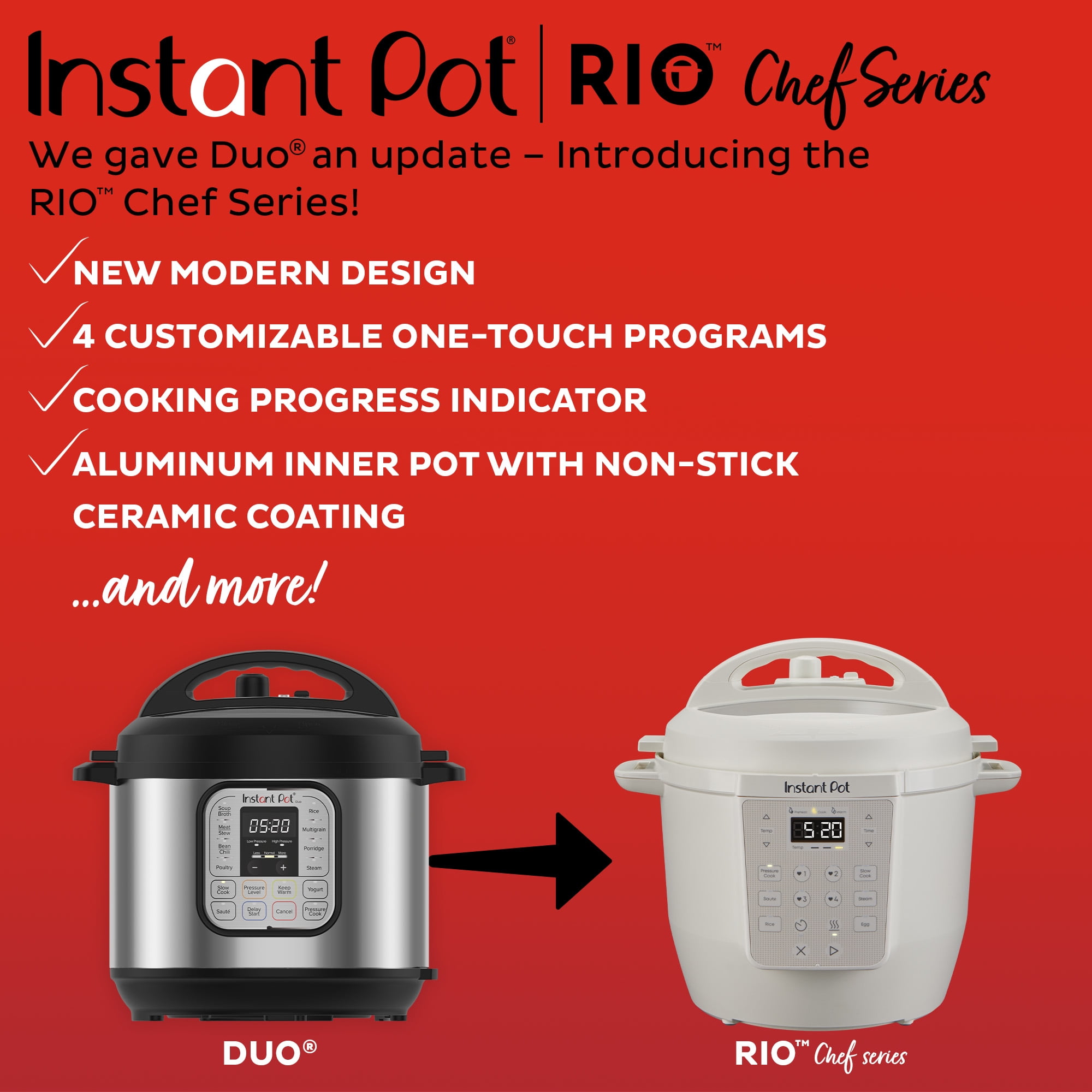 Instant Pot® RIO™ delivers all of the features you love about Instant Pot, in a slimmer, sleeker design that fits beautifully on your kitchen counter. RIO™ offers quick and easy meals up to 70% faster, with enough cooking capacity to feed a family of six. With 13 smart cooking programs, a guided cooking indicator that monitors progress and an anti-spin, stainless steel cooking pot that makes stirring, sauteing and browning easier than ever, RIO™ helps you make meals that are truly “all in one.” The updated Easy-Release switch makes steam release safe, simple and fast. Redefine cooking and enjoy quick and easy meals anywhere, any time.