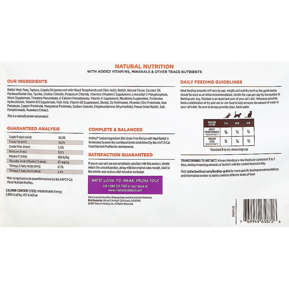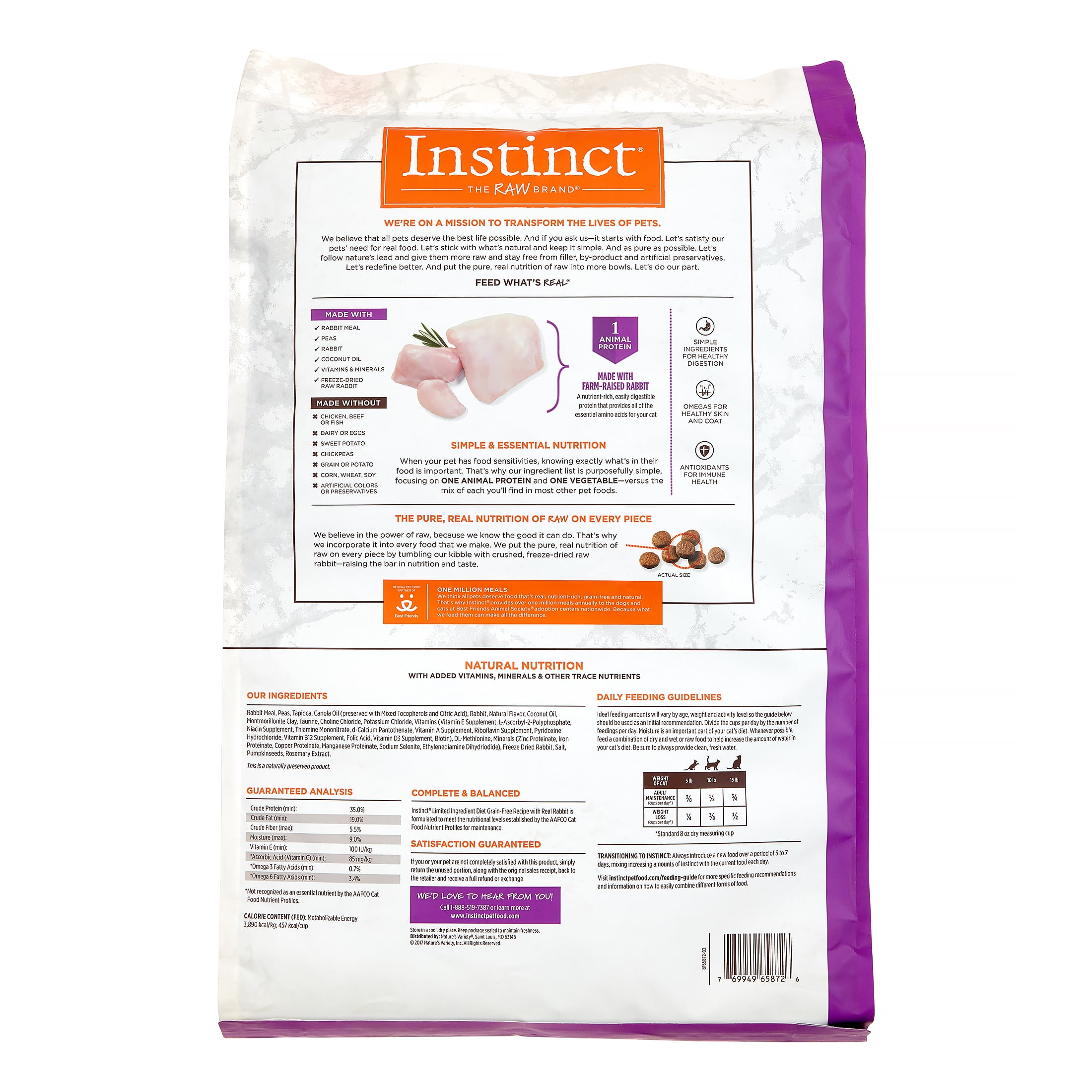 Instinct Limited Ingredient Diet Grain-Free Recipe with Real Rabbit Natural Dry Cat Food by Nature’s Variety, 10-lb. BagInstinct is the raw-brand division of Nature’s Variety and promotes pet health through natural, real ingredients. Instinct gives your pet the benefits of raw nutrition conveniently, safely, and without fillers, by-products, and artificial preservatives.Feed your favorite feline Instinct Limited Ingredient Diet Grain-Free Recipe with Real Rabbit. Perfect for cats with food sensitivities, this grain-free kibble contains only one animal protein (rabbit) and one plant protein (peas). Delicious Instinct Limited Ingredient Diet Grain-Free Recipe with Real Rabbit has natural omegas and antioxidants for healthy skin and coat as well as immune system health.