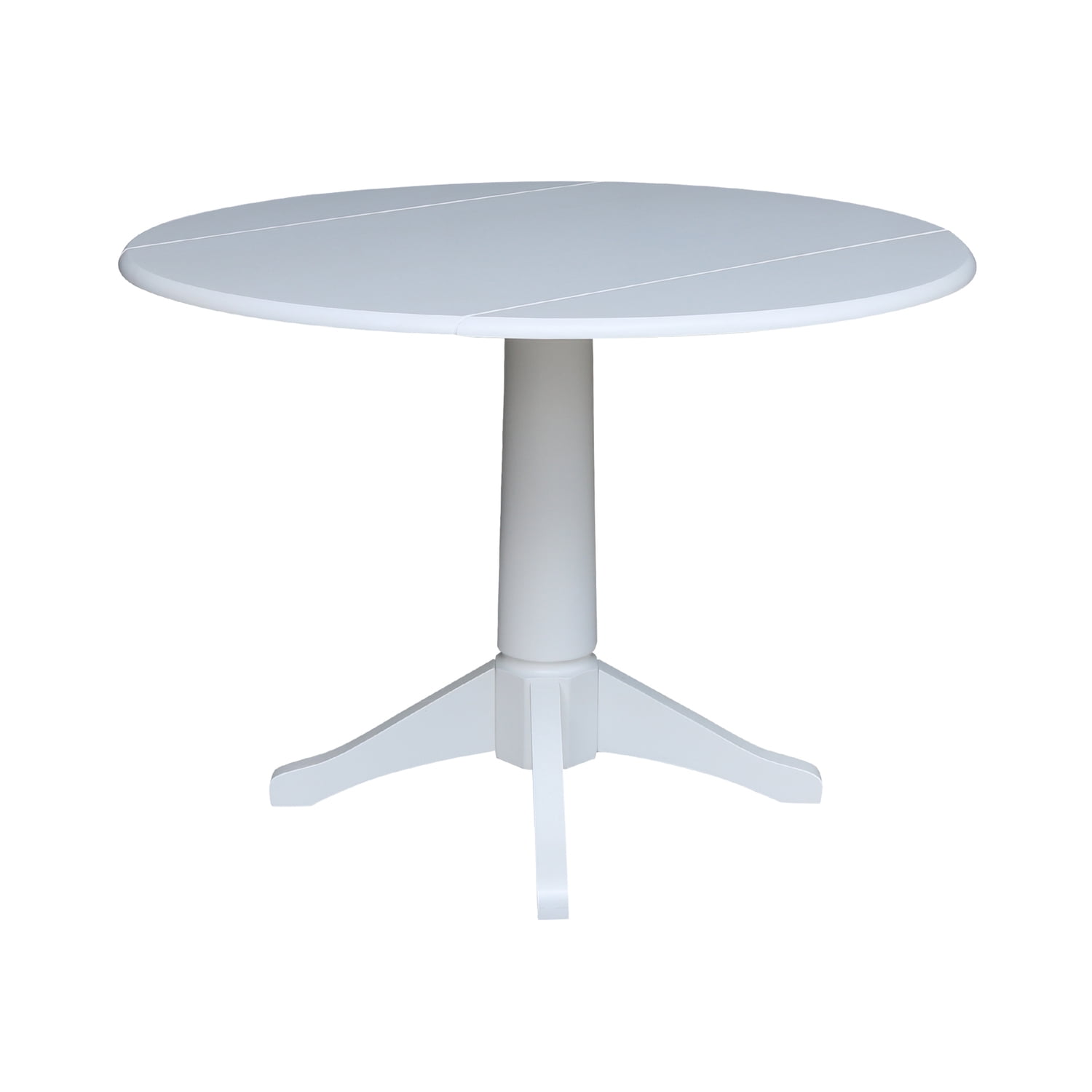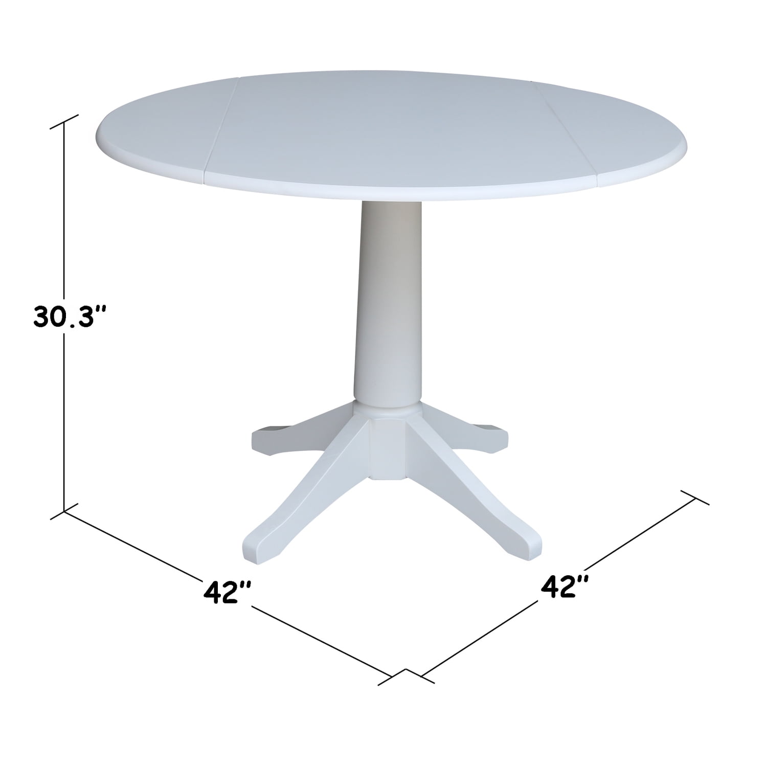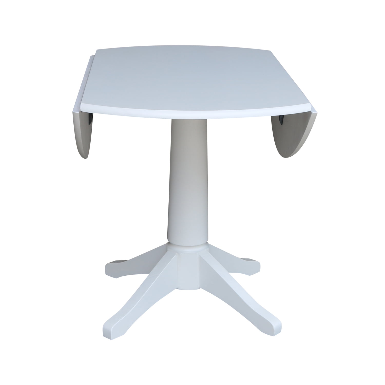Finish: White 9″ Drop leaf on each side Material: Solid Wood For use with dining chairs Butcher block table top design Ready to assemble