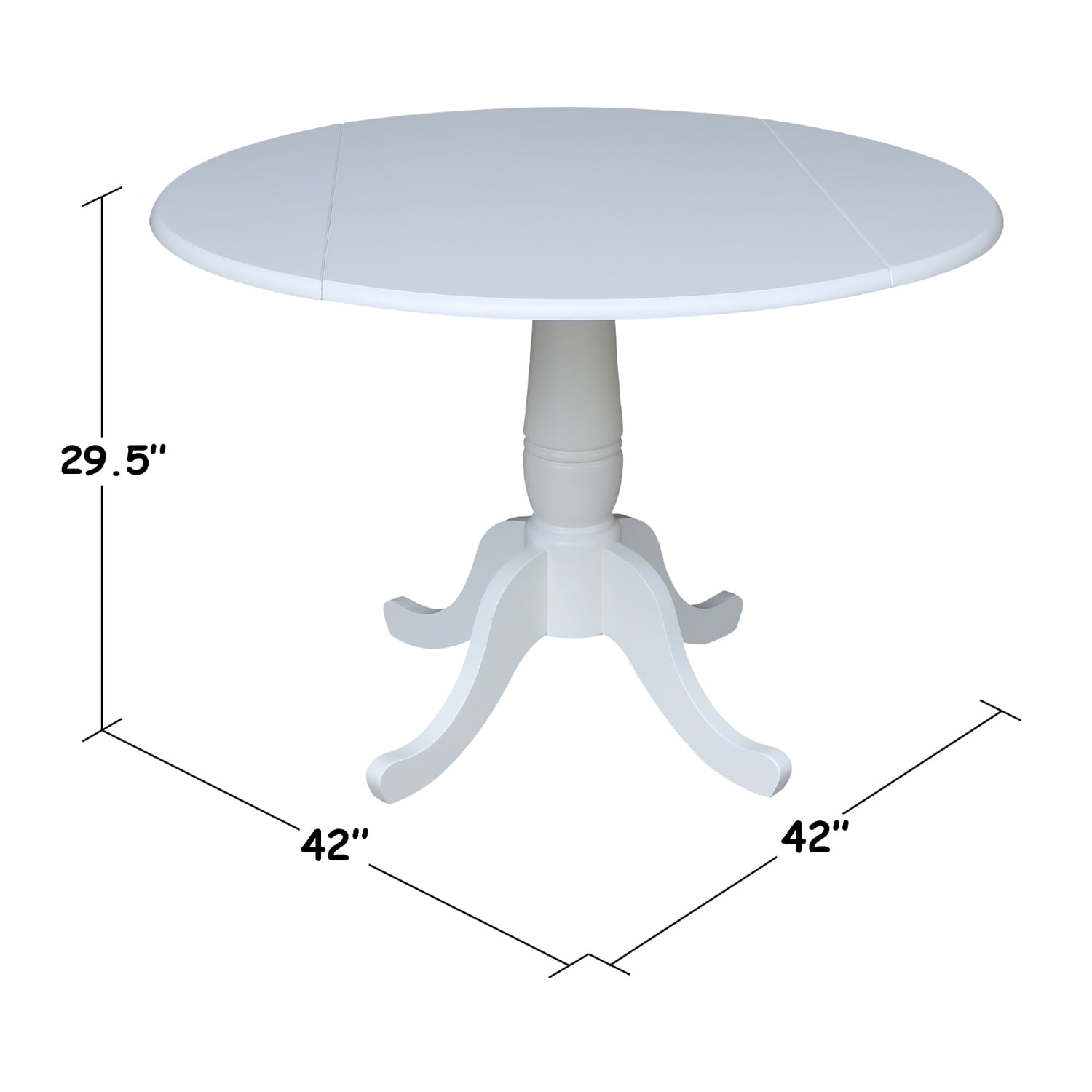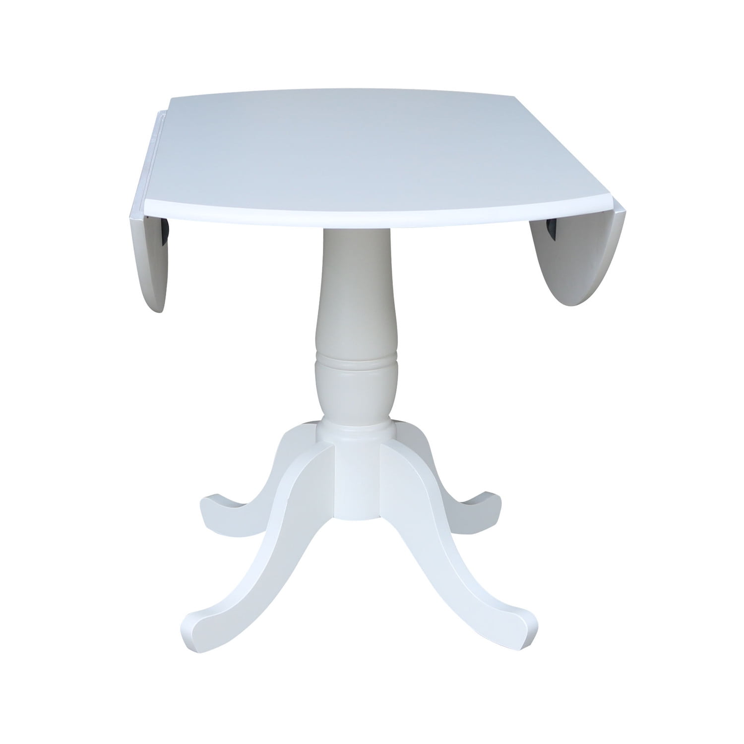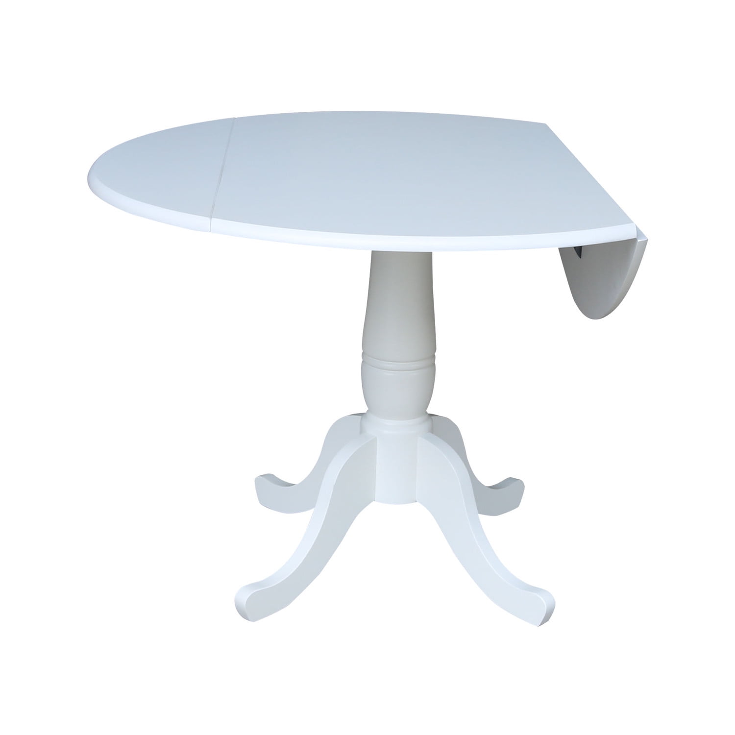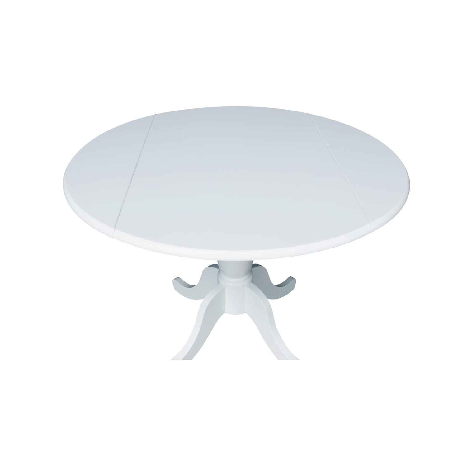 International Concepts home furniture is for those who appreciate high-quality, wood furniture with a traditional and elegant look. This dining piece will beautifully complement any decor in your kitchen or dining room. Features: Finish: White 9″ Drop leaf on each side Material: Solid Wood For use with dining chairs Butcher block table top design Ready to assemble Specifications: Product Dimensions: 29.5″ H x 42″ W x 42″ D Product Weight: 52 lbs