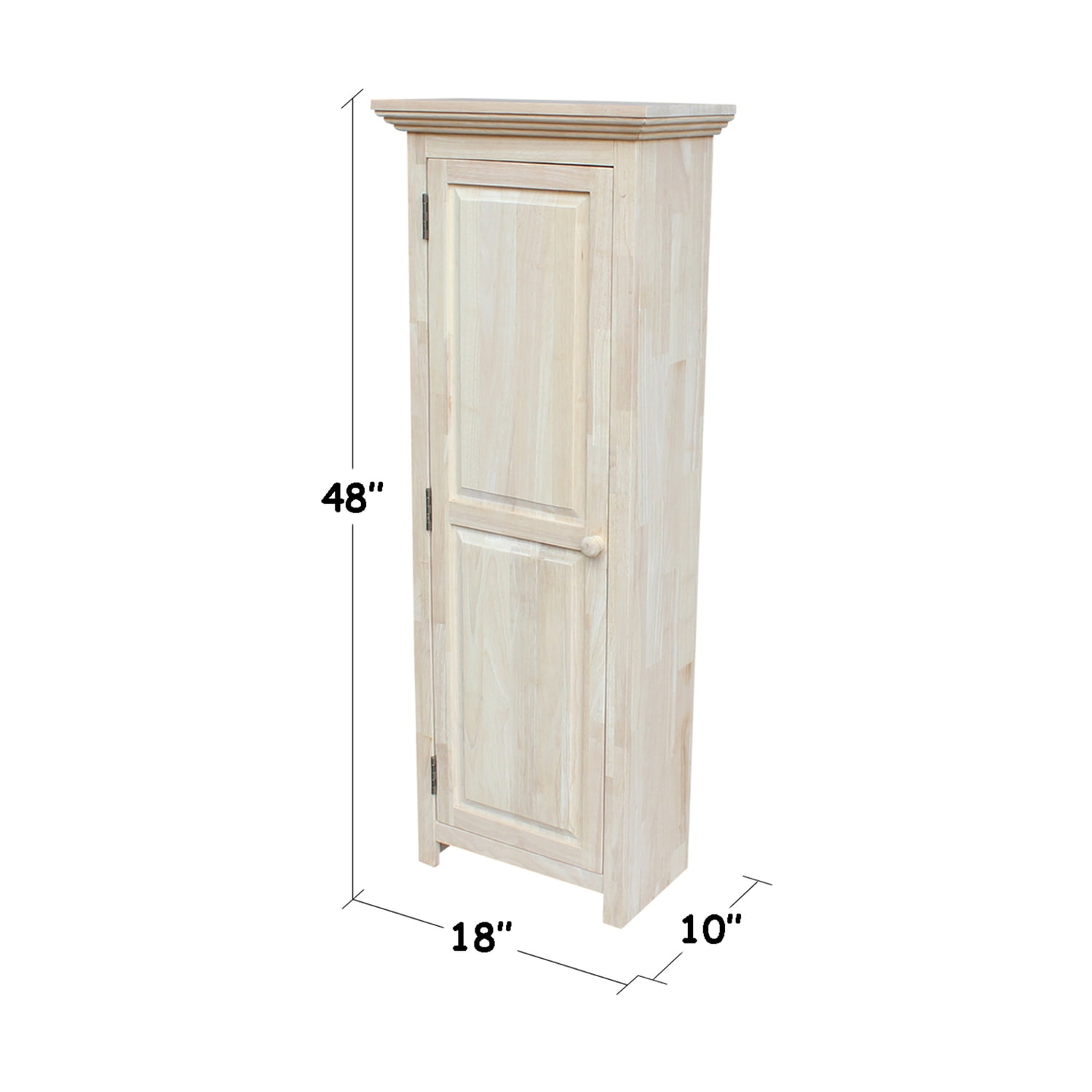 International Concepts Storage Cabinet, 48″H: Made from solid hardwood with a butcher block surface Dimensions: 18″W x 10″D x 48″H Distance from floor to bottom of apron: 1.97″ Four adjsutable shelves Size of shelves: 13.91″W x 7.37″D Size of door opening: 12.50″W x 41.47”H Ready to assemble International Concepts Founded in 1982, Whitewood Industries, Inc., is a manufacturer and distributor of high-quality, real wood furniture. From ready-to-finish pieces to the John Thomas Furniture line of full-sized dining groups, created in partnership with well-known designer Carol Wheeless, Whitewood is truly where beautiful furniture begins. Each piece is suitably casual for everyday living but handsome enough for special occasions. Based in Thomasville, NC.