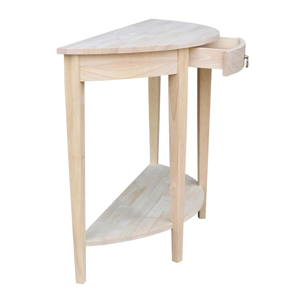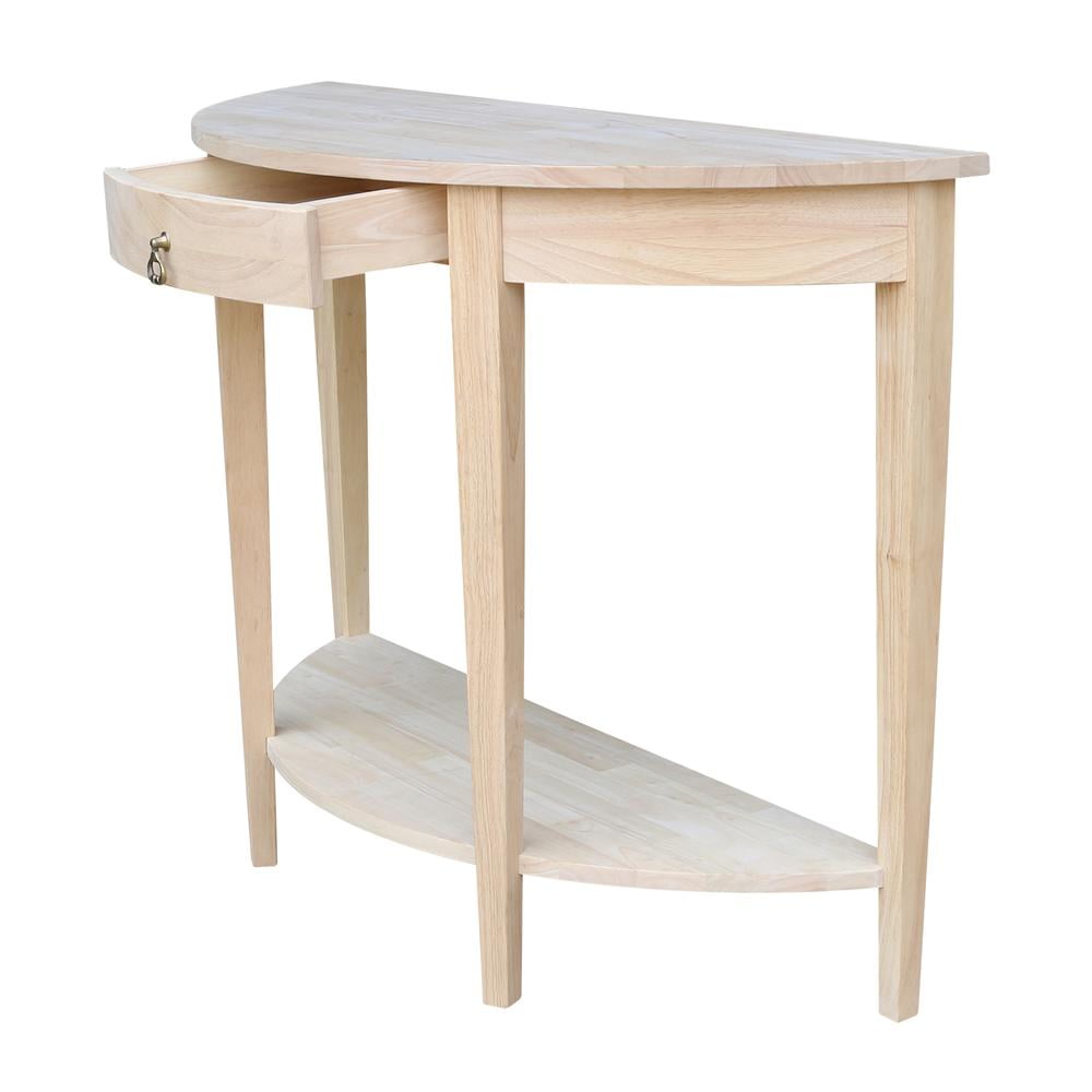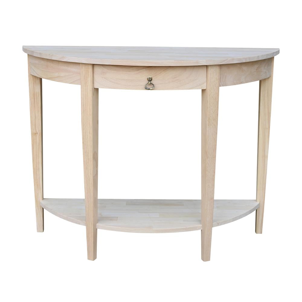 International Concepts OT-1643HD Half Moon Console Table, Ready To Finish: Made of wood Unfinished Ready to finish how you want Dimensions: 16.00″L x 42.00″W x 31.00″H Model number: OT-1643HD International Concepts console table with a drawer for additional storage space Drawer has a metal pull handle for easy opening and closing Top and bottom shelves for displaying items