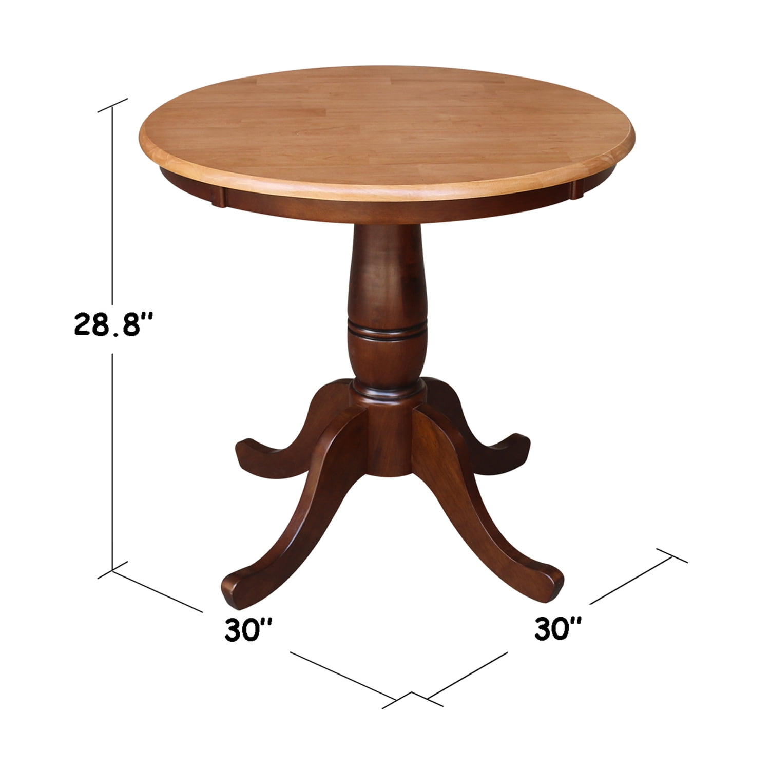 Table top – 30 ” Assembled Table Dimensions: 30 “H x 30 “W x 30 “D Butcher block top Product height: 30″ This is standard table height for chairs Top Table Diameter: 30” Pedestal base Weight product: 32 lbs. 4 feet for maximum support