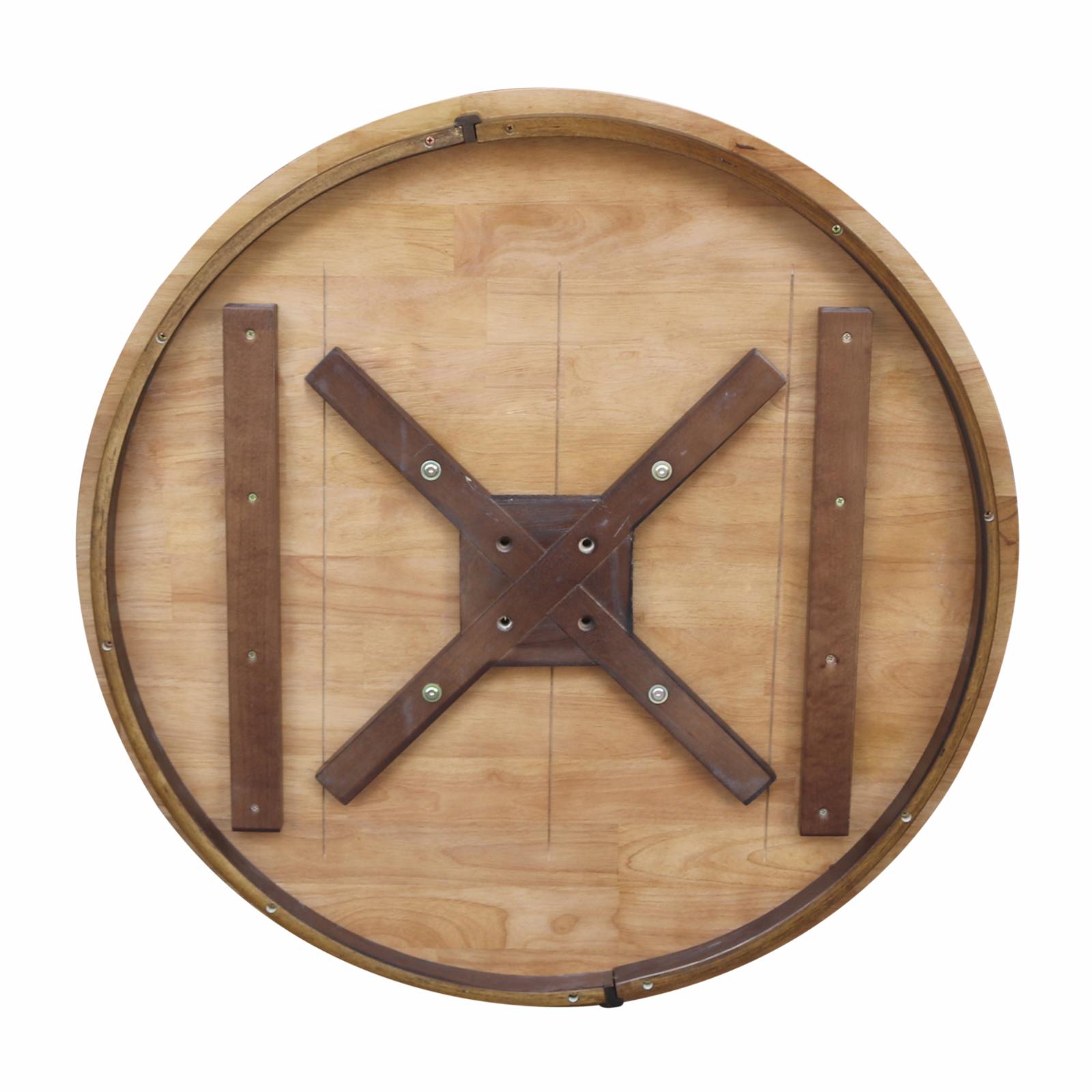 Table top – 36 ” Assembled Table Dimensions: 30 “H x 36 “W x 36 “D Butcher block top Product height: 30″ This is standard table height for chairs Top Table Diameter: 36” Pedestal base Weight product: 45 lbs. 4 feet for maximum support