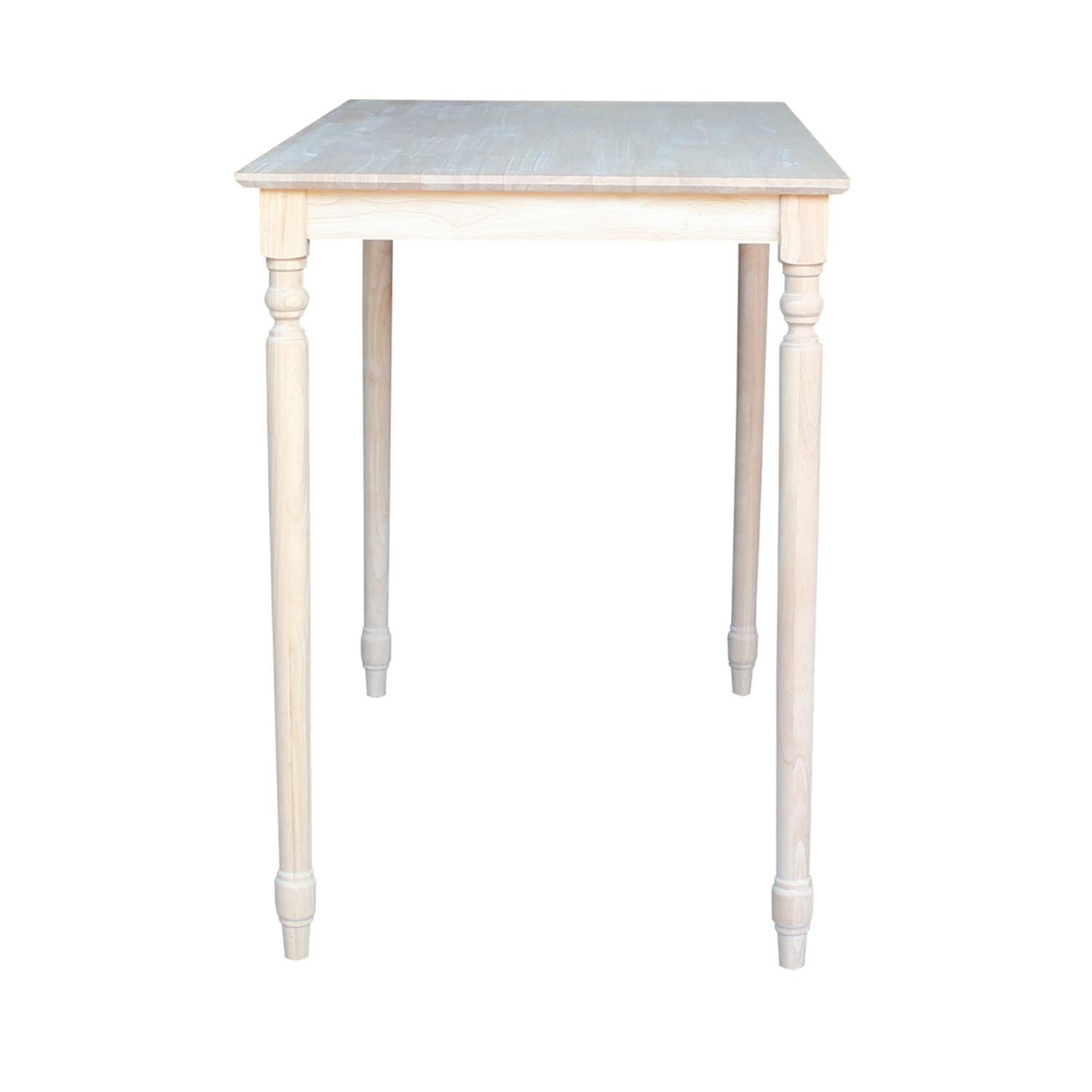International Concepts home furniture is a beautiful collection of high quality, wood furniture with a traditional and elegant look. Featuring pieces, you will be proud of for years to come and that will easily complement any decor. All pieces are manufactured from solid parawood which is more commonly referred to as Rubberwood. Parawood is eco-friendly in terms of being a fantastic renewable resource. As parawood is considered to be a hardwood, it is actually a truly durable and strong wood. Features: Unfinished Table Top Dimensions: 30″ W x 48″ D Solid Parawood For use with bar height stools – 30″ seat height Turned styled legs Butcher block top Ready to Assemble Specifications: Product Dimensions: 42″ H x 48″ W x 30″ D Product Weight: 78.1lbs