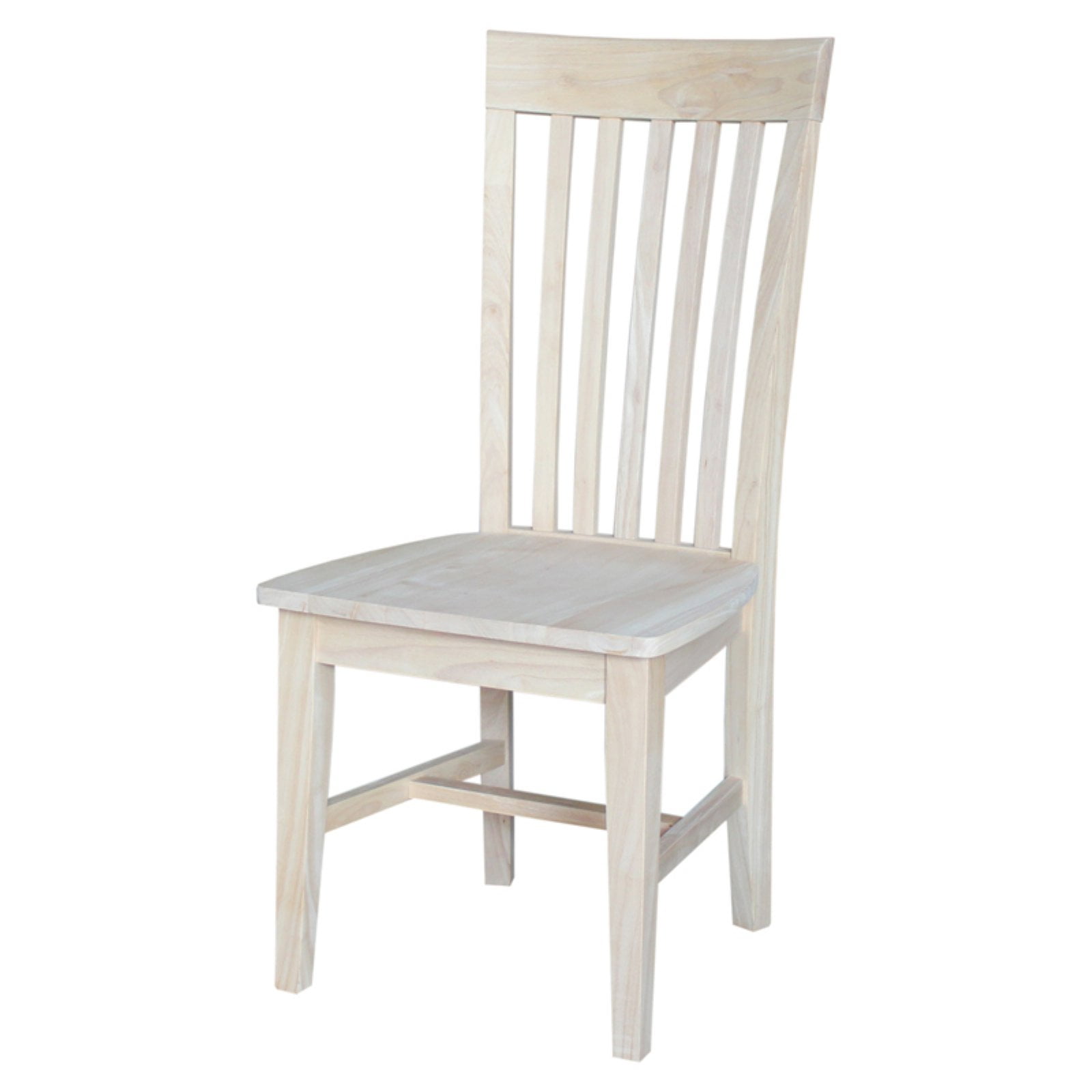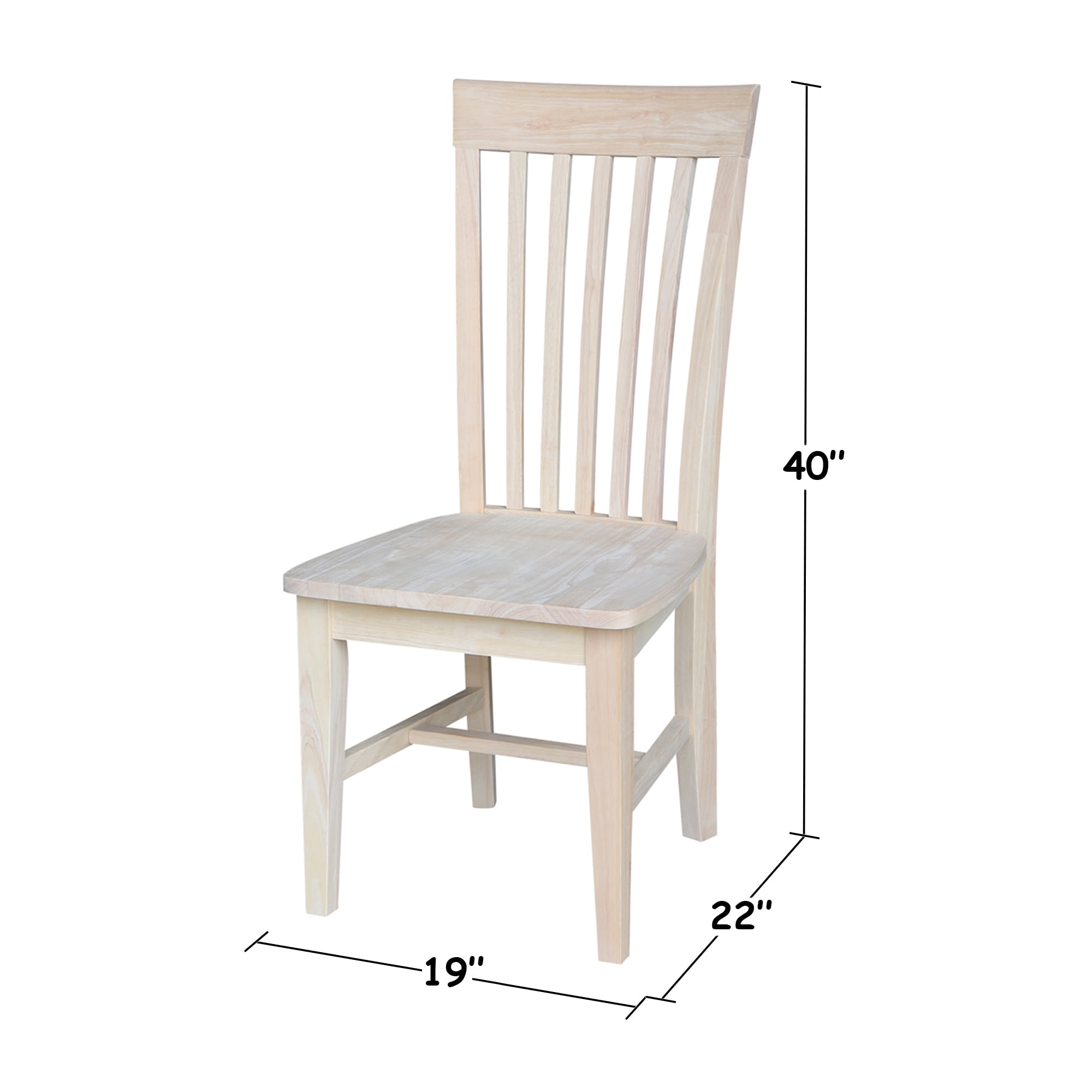 Includes set of 2 chairs Seat Size: 17.91″ W x 18″ D x 18″ H International Concepts Casual Dining Side Chair Unfinished surface Wood seat Made of solid parawood Mission style Ready to assemble Dimensions: 19″W x 22″D x 40″H
