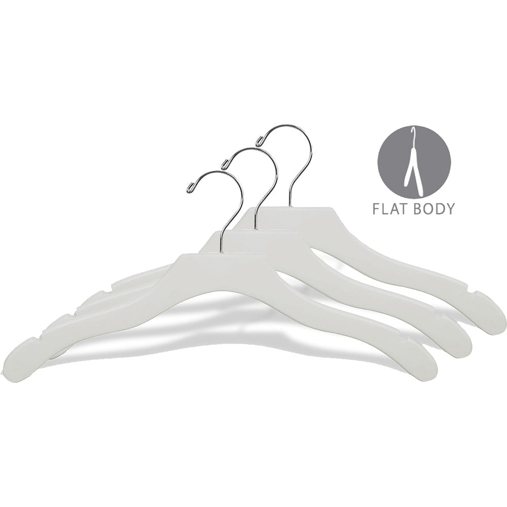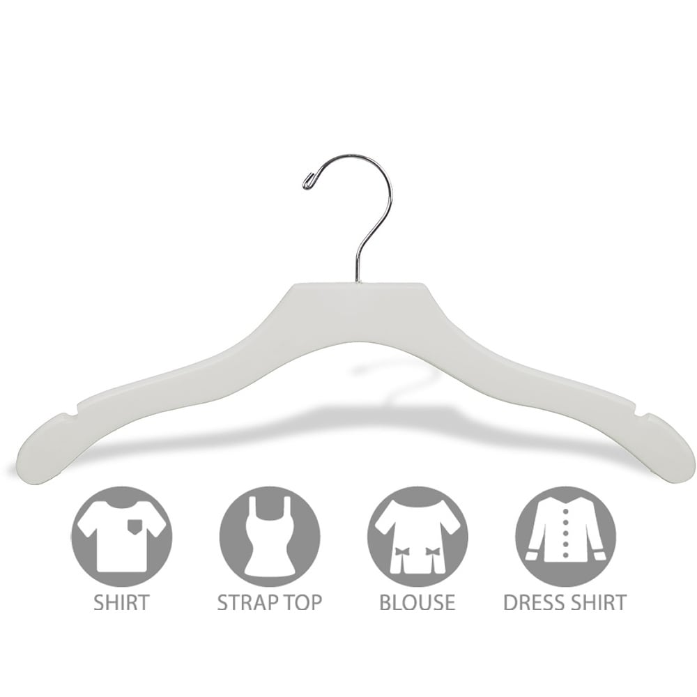 Featuring precision routed notches perfect for hanging straps, this hanger is ideal for tops of all kinds. These hangers are crafted from high-quality wood for durability and ease of use. Dimensions: 9.5 inches high x .38 inches wide x 17 inches long Material: Wood Color: White
