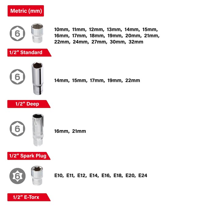 • 1/2″ Sockets: 10,11,12,13,14,15,16,17,18,19,20,21,22,24,27,30,32 mm – 1/2″ Deep Sockets: 14,15,17,19,22 mm – 1/2″ E-Torx Sockets: E10,E11,E12,E14,E16,E18,E20,E24 – 1/2″ Spark Plug Sockets: 16,21 mm