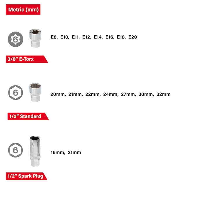 - 3/8″ Sockets: 6,7,8,9,10,11,12,13,14,15,16,17,18,19 mm – 3/8″ Deep Sockets: 13,14,15,17 mm – 3/8″ E-Torx Sockets: E8,E10,E11,E12,E14,E16,E18,E20