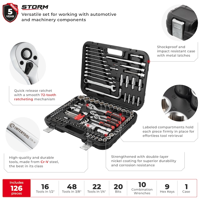 - 126-piece Metric tool kit with 1/4″, 3/8″, and 1/2″ drives; 1/2″ Sockets: 20-32 mm (select sizes); 3/8″ Sockets: 6-19 mm; 1/4″ Sockets: 4-13 mm