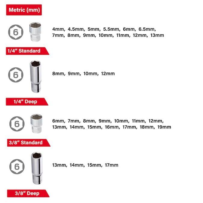 - 1/4″ Sockets: 4,4.5,5,5.5,6,6.5,7,8,9,10,11,12,13 mm – 1/4″ Deep Sockets: 8,9,10,12 mm