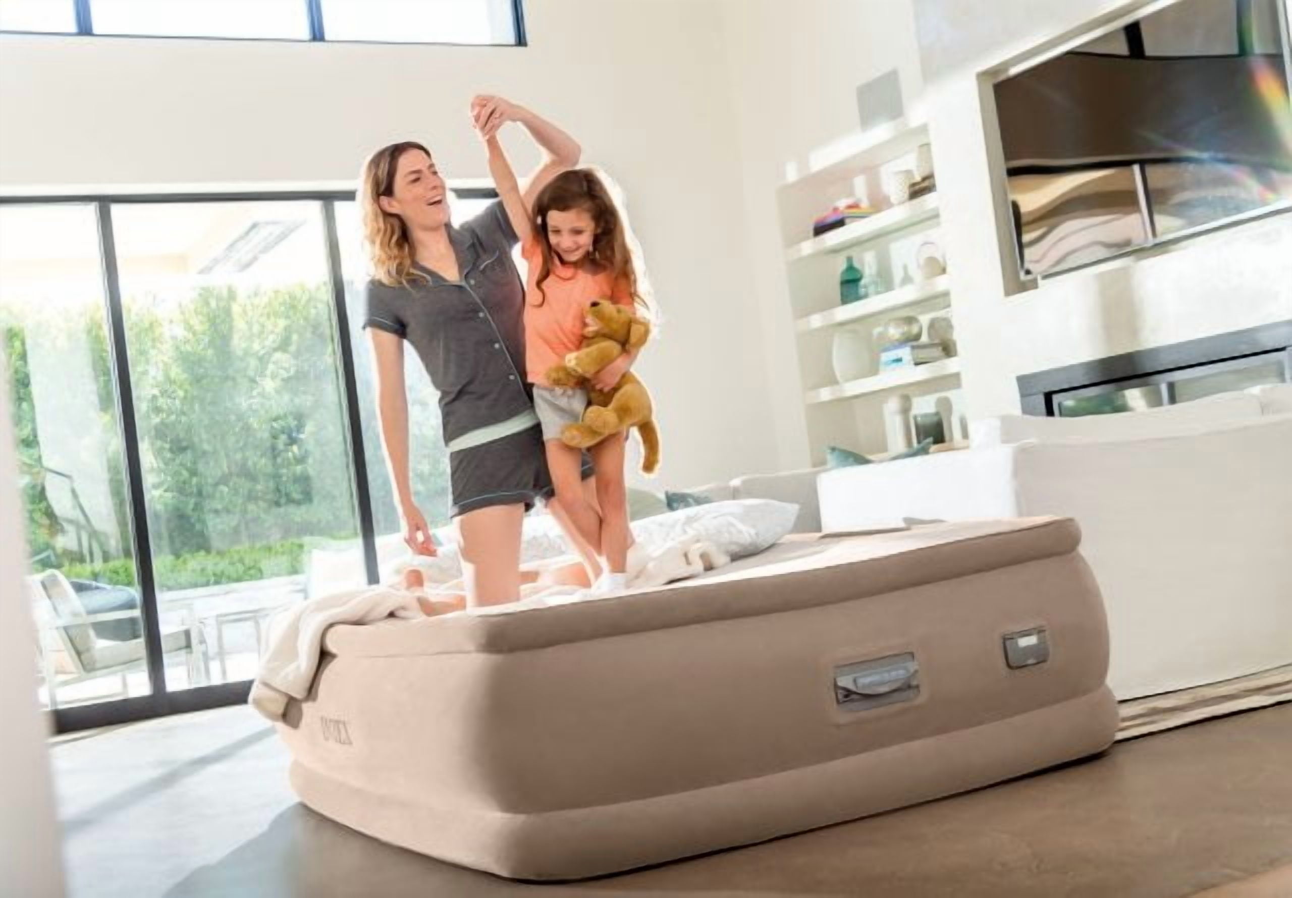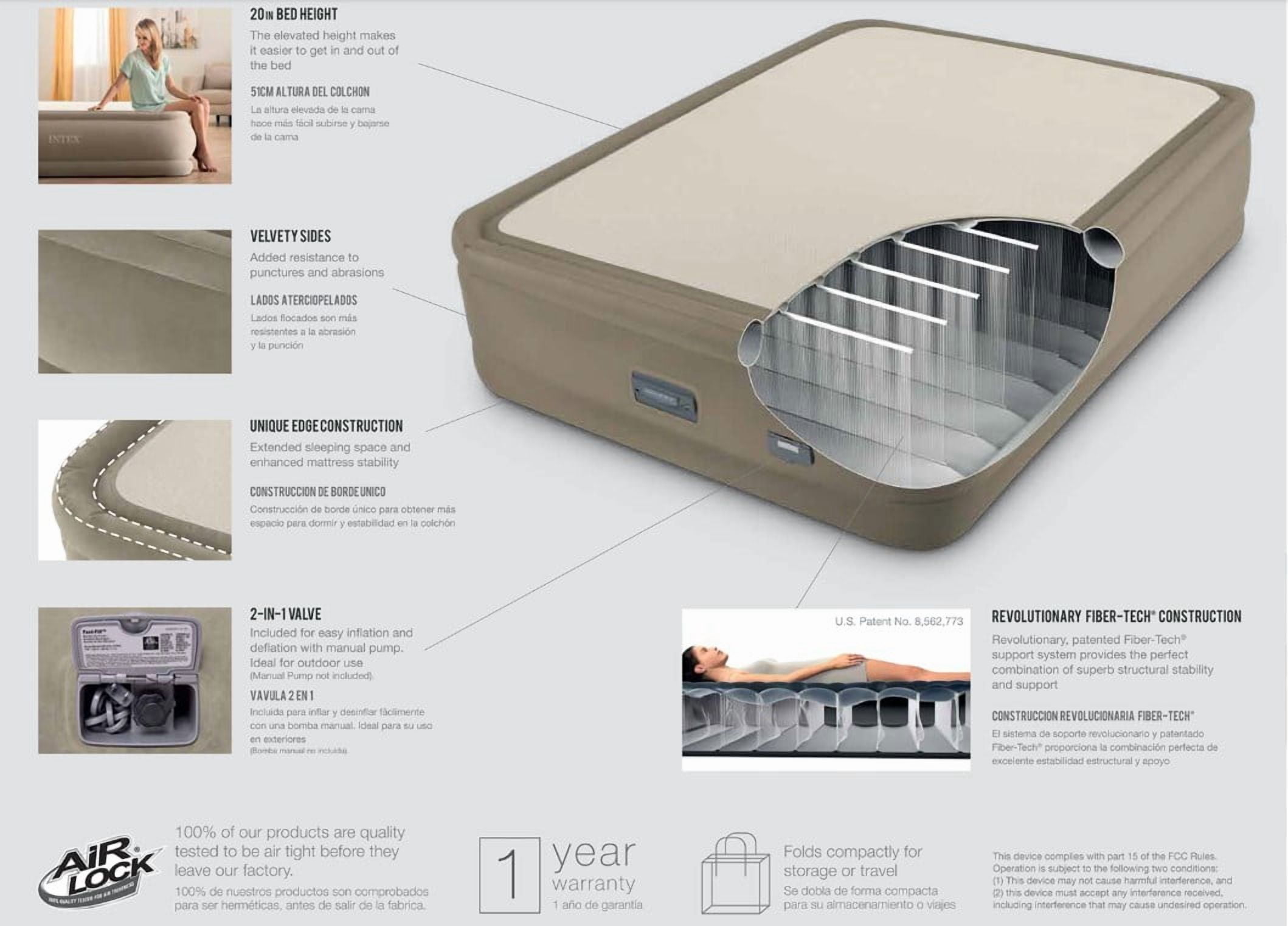Intex Queen 20″ PremAire ThermaLux Airbed Mattress with Digital Built-in Comfort Pump 110-120v Built-in digital comfort pump – 20% faster inflation, 10% greater PSI Auto-inflate/deflate button, firmness control button, USB connection for charging Extra soft tri-layer weave insulates in cold weather and wicks moisture in warm humid weather The polyester material is breathable and prevents the growth of microorganisms like bacteria and mold Raised 20″ from floor Unique edge construction for extended sleeping surface and enhanced mattress stability Includes 2-in valve for the manual pump when needed Comes with a carrying bag for convenience Weight capacity 600 lbs Dimensions: 60″ x 80″ x 20″