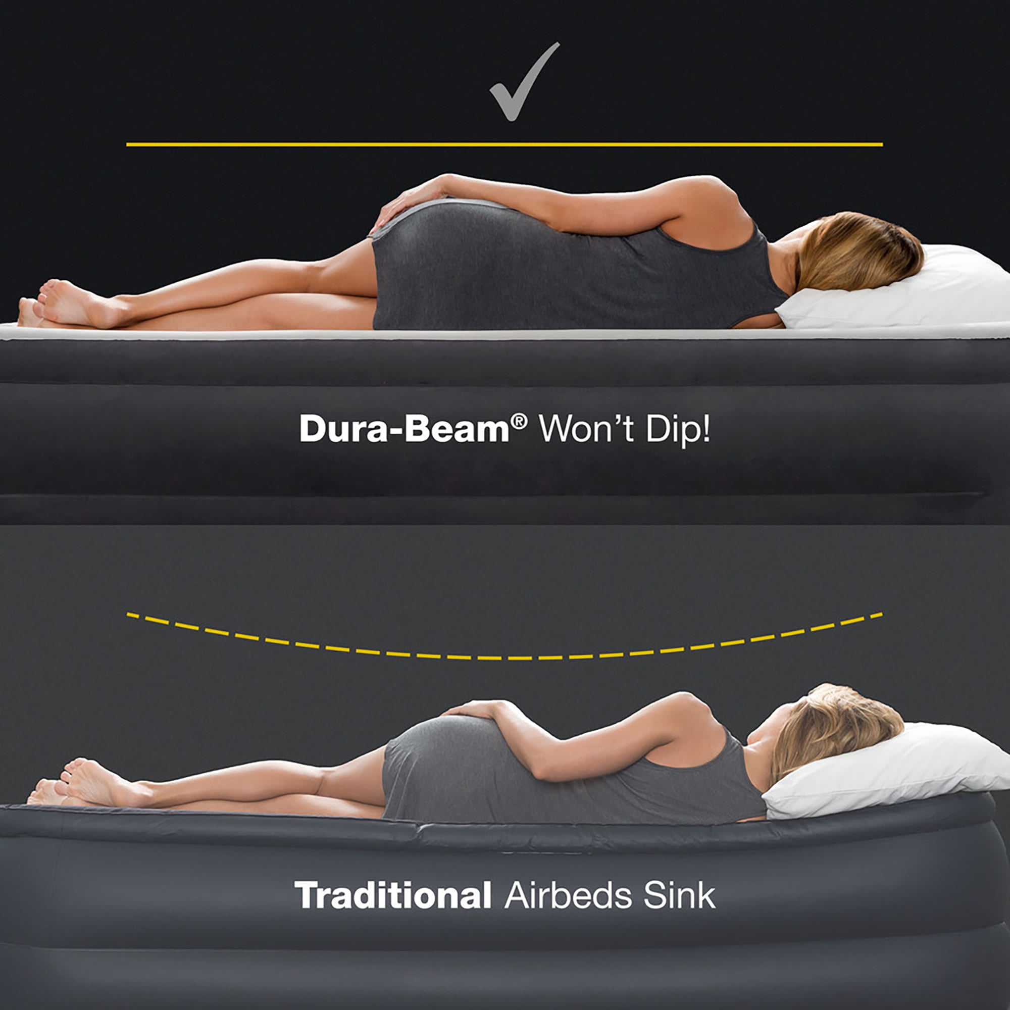 VERSATILE FOR INDOOR OR OUTDOOR USE: This raised 16.5″ bed includes a built in pillow and air pump; the unique construction provides superior stability with a soft, velvety sleeping surface ensures a good sleep. SUPERIOR STRENGTH: Unlike traditional air beds that tend to sink or dip over time, our 16.5″ Air Mattresses are designed with top and bottom ring stability to withstand the weight of the sleeper without losing its shape. FIBER-TECH BEAM CONSTRUCTION: Comprised of thousands of high-strength polyester fibers that provide enhanced comfort, stability and support; Fiber-Tech Beam Construction can withstand more weight without losing its comfort. BUILT-IN AC ELECTRIC PUMP: High-Powered built-in electric pump (110-120V) for hassle-free inflation and deflation; users can easily and quickly set up the air mattress when they need it and then deflate it. PRODUCT STRETCH: At first inflation the material will stretch, which can be misinterpreted as leaking. You will sense a loss of pressure, that’s just it stretching, simply re-inflate the bed. It will settle within 2-3 nights.