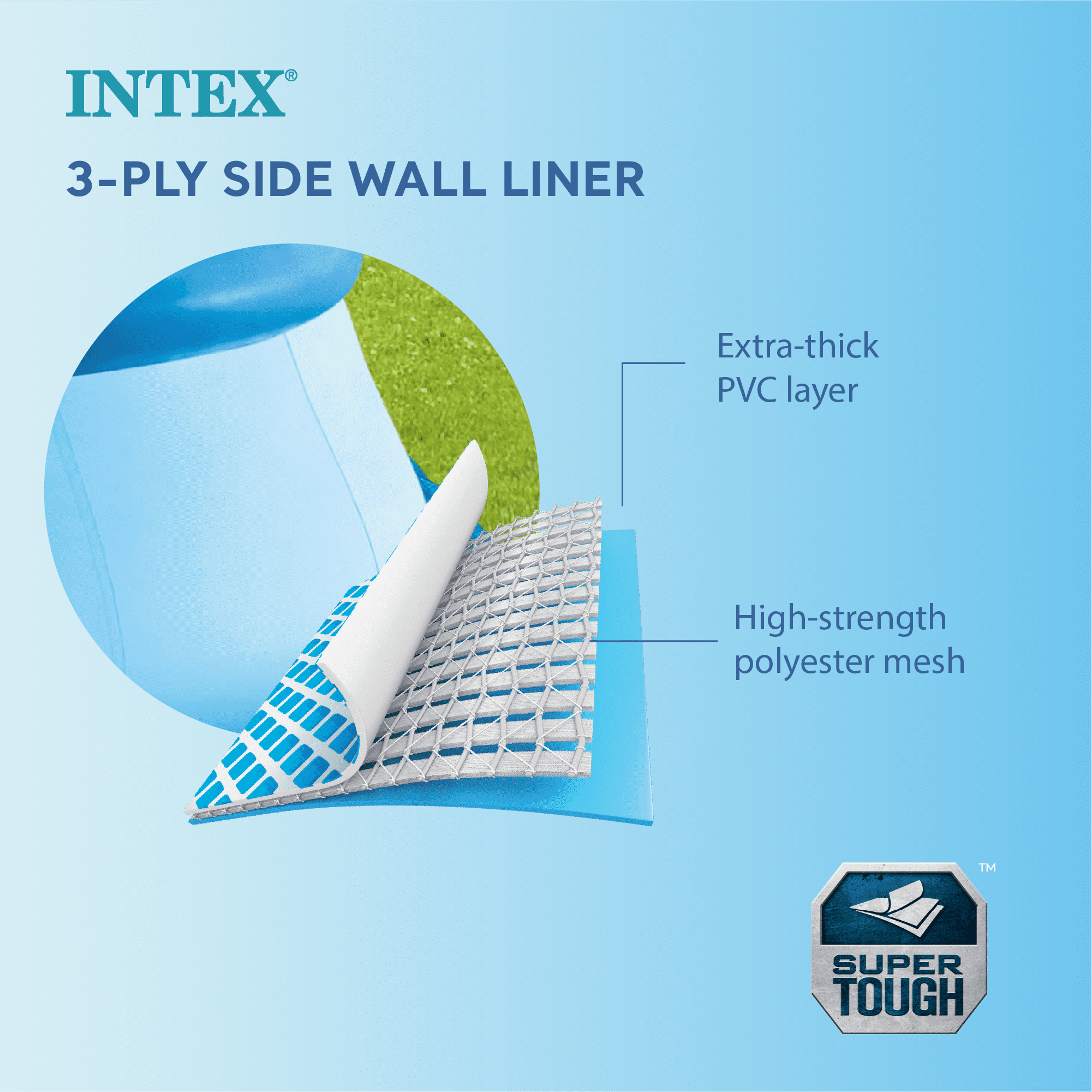 Pool measures 15ft x 42in and holds up to 3,736 gal. (80%) Quick and easy setup; ready for water in 15 minutes Spread out on level ground, inflate the top ring, and fill with water Made with puncture-resistant 3-ply PVC material to resist daily wear and tear Dual suction outlet fittings improve water circulation, hygiene, and clarity 1,000 GPH Krystal Clear Cartridge Filter pump provides excellent filtration Pump powered by the revolutionary Hydro Aeration® Technology Discover INTEX family pools for backyard use and enjoy pristine water all summer With replaceable Type A/C filter cartridge, ladder, ground cloth and pool cover Repair patch included for easy fixes Ideal for ages 6+ Pool Shape: Round Weight: 88.75 lbs. Dimensions (L x W x H): 15 ft x 15 ft x 42 in Disclaimer: Check HOA rules before purchase