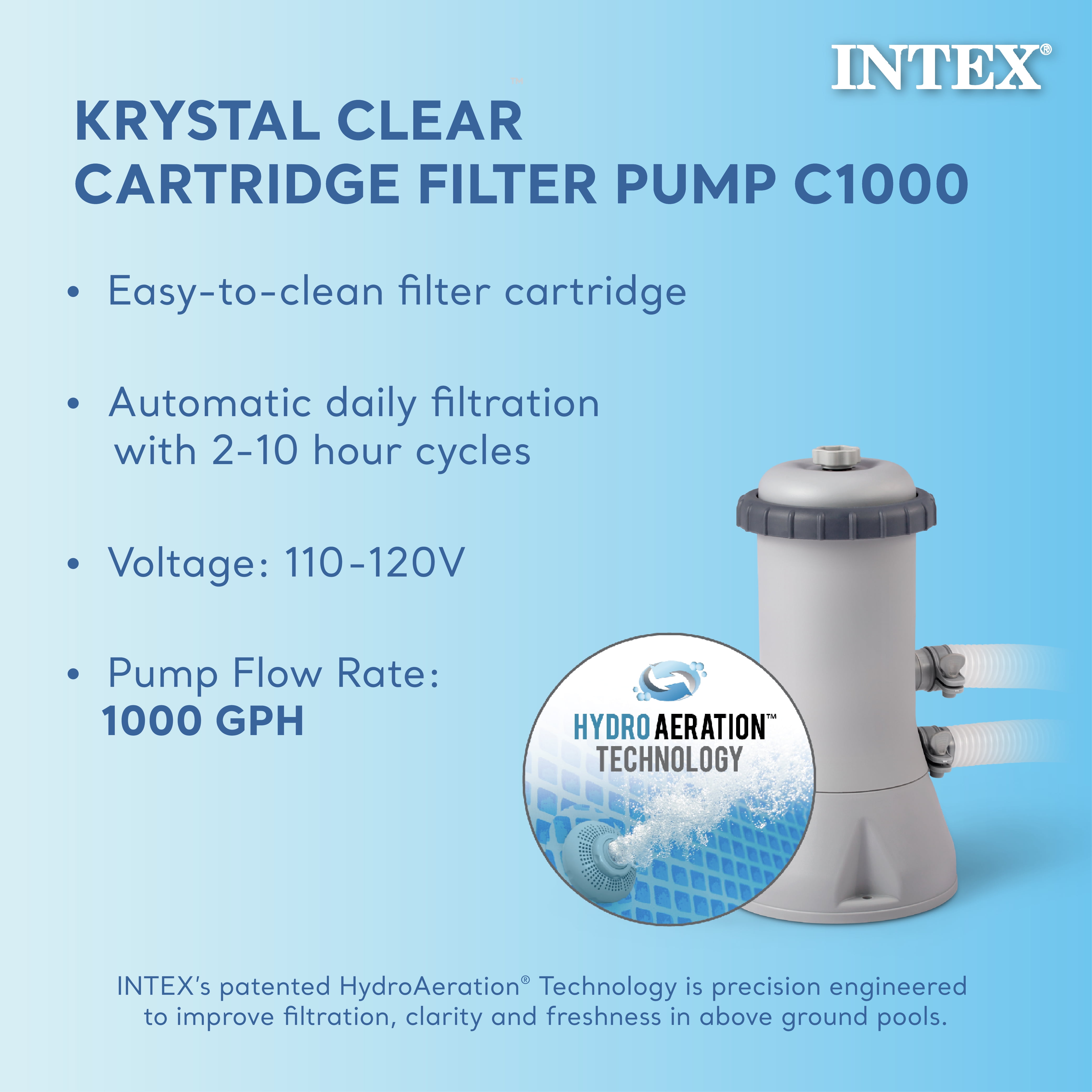 Pool measures 15ft x 42in and holds up to 3,736 gal. (80%) Quick and easy setup; ready for water in 15 minutes Spread out on level ground, inflate the top ring, and fill with water Made with puncture-resistant 3-ply PVC material to resist daily wear and tear Dual suction outlet fittings improve water circulation, hygiene, and clarity 1,000 GPH Krystal Clear Cartridge Filter pump provides excellent filtration Pump powered by the revolutionary Hydro Aeration® Technology Discover INTEX family pools for backyard use and enjoy pristine water all summer With replaceable Type A/C filter cartridge, ladder, ground cloth and pool cover Repair patch included for easy fixes Ideal for ages 6+ Pool Shape: Round Weight: 95 lbs. Dimensions (L x W x H): 15 ft x 15 ft x 48 in Disclaimer: Check HOA rules before purchase